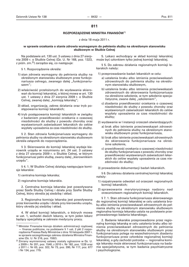Dziennik Ustaw Nr 138 — 8432 — Poz. 811 811 ROZPORZĄDZENIE MINISTRA FINANSÓW1) z dnia 18 maja 2011 r. w sprawie orzekania o stanie zdrowia wymaganym do pełnienia służby na określonym stanowisku służbowym w Służbie Celnej Na podstawie art. 130 ust. 3 ustawy z dnia 27 sierpnia 2009 r. o Służbie Celnej (Dz. U. Nr 168, poz. 1323, z późn. zm.2)) zarządza się, co następuje: § 1. Rozporządzenie określa: 1) stan zdrowia wymagany do pełnienia służby na określonym stanowisku służbowym przez funkcjonariusza celnego, zwanego dalej „funkcjonariuszem”; 2) właściwość przełożonych do wydawania skierowań do komisji lekarskiej, o której mowa w art. 130 ust. 1 ustawy z dnia 27 sierpnia 2009 r. o Służbie Celnej, zwanej dalej „komisją lekarską”; 3) skład, organizację, zakres działania oraz tryb postępowania komisji lekarskich; 4) tryb postępowania komisji lekarskich w związku z badaniem prawidłowości orzekania o czasowej niezdolności do służby z powodu choroby oraz wystawionych zaświadczeń lekarskich do celów wypłaty uposażenia za czas niezdolności do służby. § 2. Stan zdrowia funkcjonariusza wymagany do pełnienia służby na określonym stanowisku służbowym określa załącznik do rozporządzenia. § 3. Skierowanie do komisji lekarskiej wydaje kierownik urzędu w rozumieniu art. 24 ust. 3 ustawy z dnia 27 sierpnia 2009 r. o Służbie Celnej, w którym funkcjonariusz pełni służbę, zwany dalej „kierownikiem urzędu”. § 4. 1. W Służbie Celnej działają następujące komisje lekarskie: 1) centralna komisja lekarska; 2) regionalne komisje lekarskie. 2. Centralna komisja lekarska jest powoływana przez Szefa Służby Celnej i działa przy Szefie Służby Celnej, który określa jej siedzibę i skład. 3. Regionalna komisja lekarska jest powoływana przez kierownika urzędu i działa przy kierowniku urzędu, który określa jej siedzibę i skład. 4. W skład komisji lekarskich, o których mowa w ust. 1, wchodzi dwóch lekarzy, w tym jeden lekarz będący specjalistą w zakresie medycyny pracy. 1) Minister Finansów kieruje działem administracji rządowej — finanse publiczne, na podstawie § 1 ust. 2 pkt 2 rozporządzenia Prezesa Rady Ministrów z dnia 16 listopada 2007 r. w sprawie szczegółowego zakresu działania Ministra Finansów (Dz. U. Nr 216, poz. 1592). 2) Zmiany wymienionej ustawy zostały ogłoszone w Dz. U. z 2009 r. Nr 201, poz. 1540, z 2010 r. Nr 182, poz. 1228 oraz z 2011 r. Nr 63, poz. 322, Nr 73, poz. 390, Nr 117, poz. 677 i Nr 134, poz. 779. 5. Lekarz wchodzący w skład komisji lekarskiej może być członkiem tylko jednej komisji lekarskiej. § 5. Do zakresu działania regionalnych komisji lekarskich należy: 1) przeprowadzanie badań lekarskich w celu: a) ustalenia braku albo istnienia przeciwwskazań zdrowotnych do pełnienia służby na określonym stanowisku służbowym, b) ustalenia braku albo istnienia przeciwwskazań zdrowotnych do skierowania funkcjonariusza na określone szkolenie, w tym szkolenie specjalistyczne, zwane dalej „szkoleniem”, c) zbadania prawidłowości orzekania o czasowej niezdolności do służby z powodu choroby oraz wystawionych zaświadczeń lekarskich do celów wypłaty uposażenia za czas niezdolności do służby; 2) wydawanie w I instancji orzeczeń stwierdzających: a) brak albo istnienie przeciwwskazań zdrowotnych do pełnienia służby na określonym stanowisku służbowym przez funkcjonariusza, b) brak albo istnienie przeciwwskazań zdrowotnych do skierowania funkcjonariusza na określone szkolenie, c) prawidłowość orzekania o czasowej niezdolności do służby funkcjonariusza z powodu choroby oraz prawidłowości wystawianych zaświadczeń lekarskich do celów wypłaty uposażenia za czas niezdolności do służby; 3) prowadzenie dokumentacji badań lekarskich. § 6. Do zakresu działania centralnej komisji lekarskiej należy: 1) rozpatrywanie odwołań od orzeczeń regionalnych komisji lekarskich; 2) sprawowanie merytorycznego nadzoru nad orzecznictwem regionalnych komisji lekarskich. § 7. 1. Stan zdrowia funkcjonariusza skierowanego do regionalnej komisji lekarskiej w celu ustalenia braku albo istnienia przeciwwskazań zdrowotnych do pełnienia służby na określonym stanowisku służbowym regionalna komisja lekarska ustala na podstawie przeprowadzonego badania lekarskiego. 2. Badanie lekarskie przeprowadzone przez regionalną komisję lekarską w celu ustalenia braku albo istnienia przeciwwskazań zdrowotnych do pełnienia służby na określonym stanowisku służbowym przez funkcjonariusza polega na wszechstronnym zbadaniu funkcjonariusza przez członków regionalnej komisji lekarskiej, a gdy zachodzi potrzeba — regionalna komisja lekarska może skierować funkcjonariusza na badania specjalistyczne, w tym badania psychiatryczne i psychologiczne. Dziennik Ustaw Nr 138 — 8433 — 3. W przypadku stwierdzenia dwóch lub więcej schorzeń, ułomności fizycznych lub psychicznych w różnym stopniu ograniczających zdolność funkcjonariusza do służby na określonym stanowisku służbowym regionalna komisja lekarska rozpatruje wszystkie te schorzenia lub ułomności łącznie, mając na uwadze ogólną zdolność funkcjonariusza do służby na określonym stanowisku. Poz. 811 2. Badanie lekarskie, o którym mowa w ust. 1 pkt 1, regionalna komisja lekarska przeprowadza w terminie 14 dni od daty otrzymania skierowania do komisji lekarskiej. 3. W przypadku, o którym mowa w ust. 1, regionalna komisja lekarska wydaje orzeczenie: 4. Przy ustalaniu stanu zdrowia funkcjonariusza skierowanego do regionalnej komisji lekarskiej w celu ustalenia braku albo istnienia przeciwwskazań zdrowotnych do pełnienia służby na określonym stanowisku służbowym, w przypadku ostrego schorzenia w rozumieniu klinicznym regionalna komisja lekarska nie wydaje orzeczenia o zdolności do służby na określonym stanowisku służbowym aż do czasu ustąpienia ostrych objawów. 1) o 