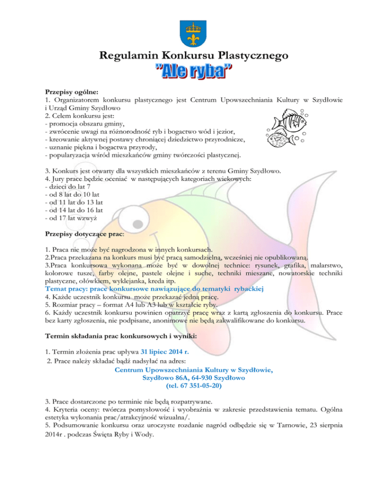 Regulamin Konkursu Plastycznego Przepisy ogólne: 1. Organizatorem konkursu plastycznego jest Centrum Upowszechniania Kultury w Szydłowie i Urząd Gminy Szydłowo 2. Celem konkursu jest: - promocja obszaru gminy, - zwrócenie uwagi na różnorodność ryb i bogactwo wód i jezior, - kreowanie aktywnej postawy chroniącej dziedzictwo przyrodnicze, - uznanie piękna i bogactwa przyrody, - popularyzacja wśród mieszkańców gminy twórczości plastycznej. 3. Konkurs jest otwarty dla wszystkich mieszkańców z terenu Gminy Szydłowo. 4. Jury prace będzie oceniać w następujących kategoriach wiekowych: - dzieci do lat 7 - od 8 lat do 10 lat - od 11 lat do 13 lat - od 14 lat do 16 lat - od 17 lat wzwyż Przepisy dotyczące prac: 1. Praca nie może być nagrodzona w innych konkursach. 2.Praca przekazana na konkurs musi być pracą samodzielną, wcześniej nie opublikowaną. 3.Praca konkursowa wykonana może być w dowolnej technice: rysunek, grafika, malarstwo, kolorowe tusze, farby olejne, pastele olejne i suche, techniki mieszane, nowatorskie techniki plastyczne, ołówkiem, wyklejanka, kreda itp. Temat pracy: prace konkursowe nawiązujące do tematyki rybackiej 4. Każde uczestnik konkursu może przekazać jedną pracę. 5. Rozmiar pracy – format A4 lub A3 lub w kształcie ryby. 6. Każdy uczestnik konkursu powinien opatrzyć pracę wraz z kartą zgłoszenia do konkursu. Prace bez karty zgłoszenia, nie podpisane, anonimowe nie będą zakwalifikowane do konkursu. Termin składania prac konkursowych i wyniki: 1. Termin złożenia prac upływa 31 lipiec 2014 r. 2. Prace należy składać bądź nadsyłać na adres: Centrum Upowszechniania Kultury w Szydłowie, Szydłowo 86A, 64-930 Szydłowo (tel. 67 351-05-20) 3. Prace dostarczone po terminie nie będą rozpatrywane. 4. Kryteria oceny: twórcza pomysłowość i wyobraźnia w zakresie przedstawienia tematu. Ogólna estetyka wykonania prac/atrakcyjność wizualna/. 5. Podsumowanie konkursu oraz uroczyste rozdanie nagród odbędzie się w Tarnowie, 23 sierpnia 2014r . podczas Święta Ryby i Wody. Nagrody: 1. Jury powołane przez organizatora, spośród przekazanych prac wyłoni trzech laureatów konkursu w każdej kategorii wiekowej, którzy otrzymają nagrody rzeczowe. 2. Jury powołane przez organizatora, spośród pozostałych prac może wyłonić dodatkowe prace – wyróżnienia. 3. Decyzja Jury, co do wskazania laureatów i osób wyróżnionych w konkursie oraz przyznania im nagród jest ostateczna. Postanowienia końcowe: 1. Przekazując pracę na konkurs, uczestnik oświadcza że: - jest autorem/autorką przekazanej pracy i posiada do nich pełne prawa autorskie, - przyjmuje warunki regulaminu konkursu plastycznego, - wyraża zgodę na nieodpłatne wykorzystywanie nadesłanej pracy dla celów promocyjnych przez organizatora 2. Biorąc udział w konkursie, uczestnik akceptuje jego regulamin. Autor zgadza się na nieodpłatne publikowanie zwycięskiej pracy na wszelkich polach eksploatacji. 3. Regulamin niniejszego konkursu będzie dostępny na stronie internetowej www.szydlowo.pl KARTA ZGŁOSZENIA KONKURS PLASTYCZNY IMIĘ I NAZWISKO AUTORA PRACY ……………………………………………………………………………….. KATEGORIA WIEKOWA dzieci do lat 7 od 8 lat do 10 lat od 11 lat do 13 lat od 14 lat do 16 lat od 17 lat wzwyż ADRES: Ulica:………………………………………………. Numer:…………….…. Miejscowość:……………………..……… Telefon:………………………..... e-mail: Imię i nazwisko rodzica/opiekuna prawnego ………………………………………………………………………………… Zgoda na przetwarzanie danych osobowych Wyrażam zgodę na udział w konkursie plastycznym „Ale ryba" oraz na publikację, prezentowanie i eksponowanie pracy na wystawach, stronie internetowej organizatora oraz innych mediach, a także przetwarzanie danych osobowych, zawartych w karcie zgłoszenia, w ramach promocji konkursu zgodnie z ustawą z dnia 29 sierpnia 1997r. o ochronie danych osobowych (Dz. U. z 2002r. Nr 101, poz. 926 z późn. zm.) i ustawą z dnia 4 lutego 1994r. o prawie autorskim i prawach pokrewnych (Dz. U. z 2006r. Nr 90, poz. 631 z późn. zm.) ……………………………….. Miejscowość i data ………………………………………………. Podpis rodzica lub opiekuna prawnego