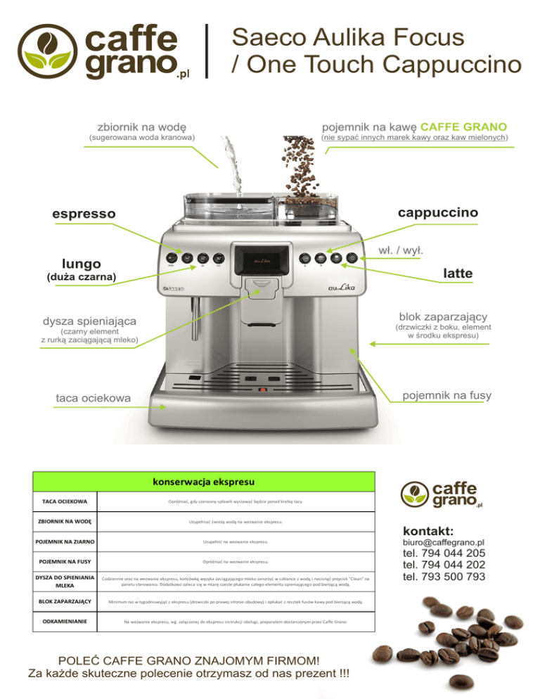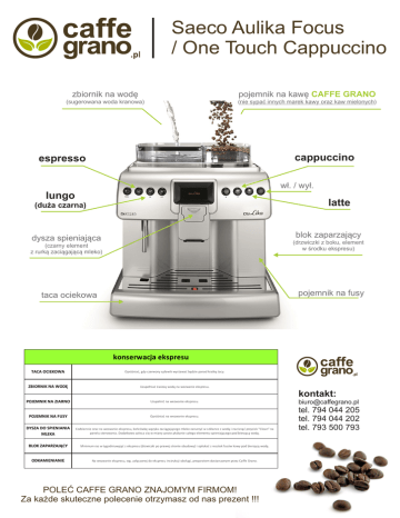 Saeco Aulika Focus / One Touch Cappuccino zbiornik na wodę pojemnik na kawę CAFFE GRANO (sugerowana woda kranowa) (nie sypać innych marek kawy oraz kaw mielonych) cappuccino espresso wł. / wył. lungo latte (duża czarna) blok zaparzający dysza spieniająca (drzwiczki z boku, element w środku ekspresu) (czarny element z rurką zaciągającą mleko) pojemnik na fusy taca ociekowa konserwacja ekspresu TACA OCIEKOWA Opróżniać, gdy czerwony spławik wystawać będzie ponad kratkę tacy. ZBIORNIK NA WODĘ Uzupełniać świeżą wodą na wezwanie ekspresu. POJEMNIK NA ZIARNO Uzupełnić na wezwanie ekspresu. kontakt: POJEMNIK NA FUSY Opróżniać na wezwanie ekspresu. DYSZA DO SPIENIANIA MLEKA Codziennie oraz na wezwanie ekspresu, końcówkę węzyka zaciągającego mleko zanurzyć w szklance z wodą i nacisnąć przycisk "Clean" na panelu sterowania. Dodatkowo zaleca się w miarę czeste płukanie całego elementu spieniającego pod bierzącą wodą. BLOK ZAPARZAJĄCY Minimum raz w tygodniuwyjąć z ekspresu (drzwiczki po prawej stronie obudowy) i opłukać z resztek fusów kawy pod bierzącą wodą. ODKAMIENIANIE Na wezwanie ekspresu, wg. załączonej do ekspresu instrukcji obsługi, preparatem dostarczonym przez Caffe Grano. POLEĆ CAFFE GRANO ZNAJOMYM FIRMOM! Za każde skuteczne polecenie otrzymasz od nas prezent !!! [email protected] tel. 794 044 205 tel. 794 044 202 tel. 793 500 793