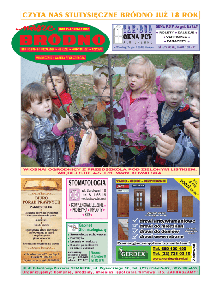 CZYTA NAS STUTYSIĘCZNE BRÓDNO JUŻ 18 ROK TA K- BU D ROK ZAŁOŻENIA1995 OKNA PCV A L U ISSN 1425-7645 v BEZPŁATNA v NR 4(209) v KWIECIEŃ 2013 v ROK XVIII D R E W N O ul. Wysockiego 26, paw. 3, 03-388 Warszawa OKNA P.C.V. do 30% RABAT v ROLETY v ŻALUZJE v VERTICALE v v PARAPETY v v tel. 675 05 03, 0-501 108 297 MIESIĘCZNIK v GAZETA SPÓŁDZIELCZA WIOSNA! OGRODNICY Z PRZEDSZKOLA POD ZIELONYM LISTKIEM. WIĘCEJ STR. 4-5. Fot. Marta KOWALSKA. STOMATOLOGIA ul. Syrokomli 10 tel. 811 65 16 www.stomatolog-izodent.waw.pl H KOMPLEKSOWE LECZENIE H H PROTETYKA H IMPLANTY H H RTG H Gabinet Stomatologiczny Stomatologia zachowawcza Protetyka n Leczenie w narkozie n Korony porcelanowe na metalu cyrkonie Zapraszamy: Warszawa n n dorosłych i dzieci pon.-pt.: 800-2000 sobota: 800-1300 ul. Szwedzka 37 tel. 818 07 91 Klub Bilardowy-Pizzeria SEMAFOR, ul. Wysockiego 10, tel. (22) 814-85-62, 607-398-452 O r g a n i z u j e m y : k o m u n i e , u r o d z i n y, i m i e n i n y, s p o t k a n i a f i r m o w e , i t p . Z A P R A S Z A M Y ! 2 DYŻURY CZŁONKÓW RADY NADZORCZEJ 18.04. – Maria ODOLAK Sylwia OLEKSIŃSKA 25.04. – Teresa KOS Krystyna ROMANOWSKA-KONIOR 9.05. – Anna SZUBA Monika WOJCIECHOWSKA DY¯URY: ul. Krasnobrodzka 11 Biuro Zarz¹du SM „Bródno” Pocz¹tek dy¿urów – godz. 1700 marca obradowała Rada NadOBRADY 25 zorcza pod przewodnictwem Sławomira RADY Antonika. Poniżej naj- ważniejsze uchwały. Rada Nadzorcza zaopiniowała zmiany w regulaminie Rady Nadzorczej, które będą przedstawione do akceptacji Walnego Zgromadzenia. Zmiany te wynikają z konieczności dostosowania regulaminu do znowelizowanego statutu i w większości zawiera zmiany porządkowe. W projekcie regulaminu Walnego Zgromadzenia (§ 1, pkt 2) zapisano, że członek spółdzielni może brać udział w Walnym Zgromadzeniu osobiście lub przez ustanowionego w tym celu pełnomocnika, z kolei pełnomocnik nie może zastępować więcej niż jednego członka, a pełnomocnictwo powinno być udzielone na piśmie pod rygorem nieważności i dołączone do protokołu Walnego Zgromadzenia. W § 3 proponuje się zapis, że liczbę części Walnego Zgromadzenia ustala corocznie Rada Nadzorcza. Ponadto w § 11 ust. 14 projektu tegoż regulaminu Rada Nadzorcza uzupełniła o zapisy dotyczące procedury wyboru członków Rady Nadzorczej w przpadku uzyskania tej samej liczby głosów przez dwóch kandydatów. Rada Nadzorcza zaopiniowała też pozytywnie 2 projekty uchwał Walnego Zgromadzenia w zakresie organizacyjno-finansowych przedsięwzięć inwestycyjnych spółdzielni, które przewidują lokalizację kolejnej inwestycji mieszkaniowej – przy ul. Kondratowicza 27 oraz określają źródła finansowania prac przygotowawczych. 1 2 3 P oczynając od 2007 roku nasza spółdzielnia – SM „Bródno” – rok rocznie zbiera wyrazy uznania, o czym pisaliśmy wielokrotnie w latach minionych. Na początku roku obecnego „Dziennik. Gazeta Prawna” – jak napisała w słowie odredakcyjnym – przemierzając wzdłuż i wszerz kraj zahaczyła również i o Bródno, a jej dziennikarze zapoznali się z pracą spółdzielni. W rezultacie gazeta przyznała naszej spółdzielni dyplom z tytułem DOBRA SPÓŁDZIELNIA 2013. Z tej okazji 25 lutego br. „Dziennik. Gazeta Prawna” opublikował obszerny wywiad z Prezesem Zarządu Krzysztofem Szczurowskim, który m. in. powiedział, że: w 2012 r. spółdzielnia wykonała remonty na kwotę 24,5 mln zł, w br. na remonty wyda ok. 25 mln zł.; w 2012 r. został oddany do użytku budynek „RÓŻOPOL” ze 122 mieszkaniami i 9 lokalami usługowymi; obecnie w biurze Zarządu trwają prace nad projektem budynku przy Syrokomli. W trakcie wywiadu Krzysztof Szczurowski powiedział: – Nie oglądamy się na sejm, tylko robimy swoje. Kolejne manipulacje nad ustawą spółdzielczą grożą likwidacją spółdzielczości mieszkaniowej. Sam fakt posiadania mandatów poselskich nie daje prawa do ingerowania w majątek członków spółdzielni. W końcu jesteśmy samorządnymi jednostkami gospodarczymi. JUŻ KOLEKCJA SM „BRÓDNO” oferuje: miejsca postojowe w lokalu garażowym Turmoncka 22 – Chodecka 21. Cena 22 tys. zł + VAT 5.060,00 zł. Informacje 510 05 26. H „Różopol”. Do sprzedania lokal użytkowy. Powierzchnia 66,70 m2. Cena 5.200 zł netto/m2. Informacje 510 05 29, 510 05 01. H 21 marca odbyło się VII Wielkanocne Spotkanie Dzieci i Młodzieży Targówka, które zorganizowane zostało przez Radę Dzielnicy i Urząd Dzielnicy Targówek m. st. Warszawy, Spółdzielnię Mieszkaniową „Bródno” oraz Robotniczą Spółdzielnię Mieszkaniową „Praga”. Na spotkanie zaproszono 360 najbardziej potrzebujących dzieci, dla których przygotowano liczne atrakcje. W tej grupie znalazło się 80 dzieci zaproszonych przez SM „Bródno”. Dziecięce buzie rozświetlały się uśmiechem oglądając występ młodych artystów z Amatorskiego Teatru Dziecięcego RAJ oraz pokazy grupy cyrkowej. Nie obyło się również bez licznych konkursów, w których zwycięzcy otrzymali nagrody. Dzięki hojności współorganizatorów, radnych dzielnicy i sponsorów dzieci obdarowane zostały paczkami ze słodyczami, zabawkami oraz biletami wstępu na basen, do kina i teatru. Akcja dała dzieciom dużo radości, a organizatorom po raz kolejny potwierdzenie słuszności jej przeprowadzania. DZIECIOM – Muszę chyba rzucić pracę by zająć się dziećmi, bo nie mam szans na przedszkole – powiedziała naszej gazecie matka dwójki dzieci prosząc o anonimowość. I dodała: – Jestem zdruzgotana, bo mój mąż sam nie zarobi na całą rodzinę. W okresie starań o przedszkole warto wiedzieć, że w naszej dzielnicy – jak podaje Wydział Edukacji i Kultury Urzędu Dzielnicy – jest obecnie 21 przedszkoli, do których w obecnym roku uczęszcza 3072 dzieci. Jednak nie wszystkie dzieci zameldowane na stałe mogą korzystać z przedszkoli. W roku ubiegłym nie przyjęto 36 proc. trzylatków, 22 proc. 
