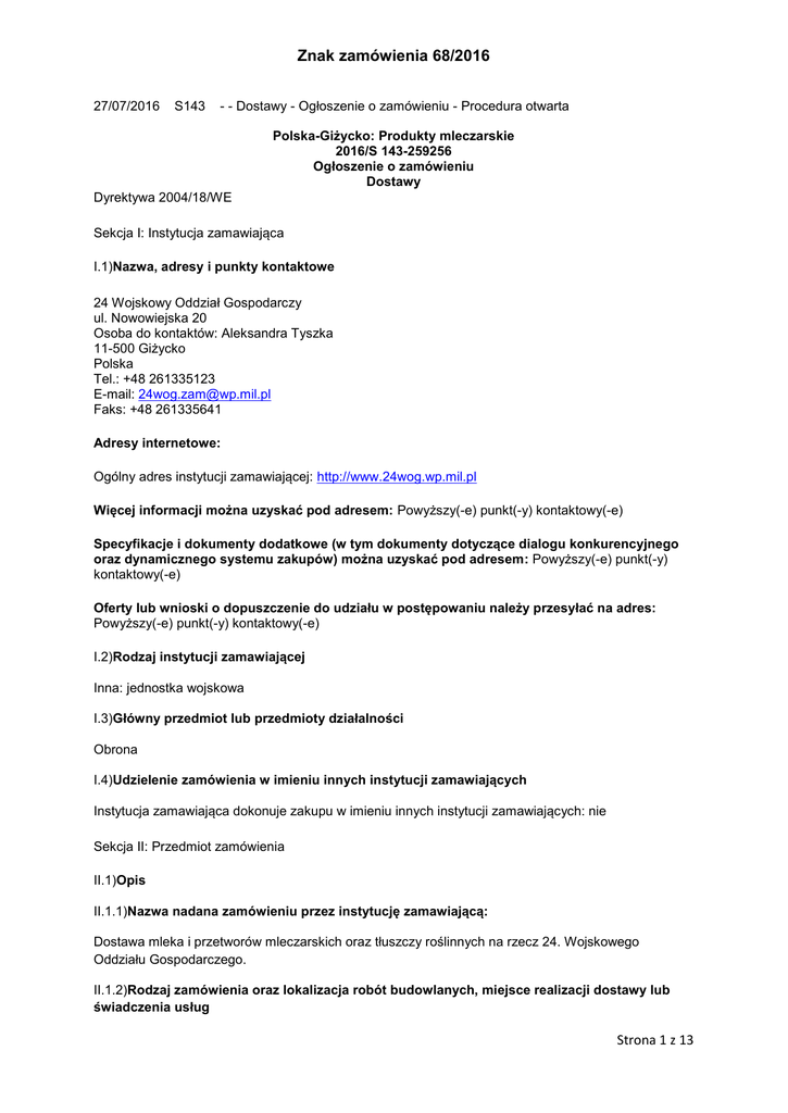 Znak zamówienia 68/2016 - 24 Wojskowy Oddział Gospodarczy