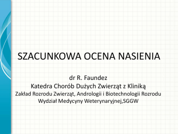 SZACUNKOWA OCENA NASIENIA dr R. Faundez Katedra Chorób Dużych Zwierząt z Kliniką Zakład Rozrodu Zwierząt, Andrologii i Biotechnologii Rozrodu Wydział Medycyny Weterynaryjnej,SGGW Atlas of spermatology. Springer Verlag 1990 BUHAJ Badanie makroskopowe - objętość • Objętość (0,5 – 17 ml, średnia 4 - 5 ml) – Wiek • U buhajów rosnących objętość powiększa się z wiekiem. Po 2 roku życia - norma > 4 ml – Rasa • Mięsne – mniejsza objętość ejakulatu – Wyżywienie – Stopień eksploatacji • ↑ Częstość pobrania → ↓ objętość – Popęd • ↓ przygotowania → ↓ objętość – Wielkość jąder – Okres roku • Lato ↓ objętość Badanie makroskopowe - zabarwienie • Nasienie dobrej jakości (wysoka koncentracja plemników) – mleczno biała, szarawa, kremowa lub żółtawa (flawiny ryboflawina) • Ejakulat złej jakości (niska koncentracja) – szarawa, szarawoblękitna, żółta, żółtawo-zielona • Obecność ropy – brudno-błętkitna, błękitno-niebieskawa (bakterie) • Obecność świeżej krwi – różowa, czerwona • Otarcie prącia, przetoki ciał jamistych, kamienie moczowe, stany zapalne układu moczowego, brutalnie przeprowadzone masaż baniek nasieniowodów • Obecność starej krwi – brązowa • Buhaje żywione trawą – żółtawa Badanie makroskopowe - zapach • Zapach typowe – spermina (świeże mleko) • Zapach moczu lub gnilny nieprawidłowe – Schorzenia jąder, dodatkowych gruczołów płciowych lub napletka – Bakterie Badanie makroskopowe -konsystencja • Zależy od ilości plemników w jednostce objętości • Normalna – śmietana, charakterystyczna marmurkowatość (ruch masy plemników) • Konsystencja mleczna lub wodnista – niska koncentracja plemników Badanie makroskopowe • Nasienie dobrej jakości – gęste, lepkie, nieprzezroczyste, wykazuje drobną gęstą ziarnistość (ruch masy plemników) • Nasienie niskiej jakości – wodniste, przezroczyste nie wykazujące ziarnistości • Nasienie zdrowych buhajów nie zawiera elementów patologicznych ani zanieczyszczeń - Krew, ropa, elementy komórkowe mogą pochodzić od jader, nasieniowodów, najądrza, dodatkowych gruczołów płciowych, nerek, cewki moczowej, prącia lub napletka. • Przy braku higieny: wazelina, włosy, kał, itp.. Badanie makroskopowe -pH • • • • Papierki lakmusowe lub pH-metr Wartość pH w świeżym nasieniu wynosi 6,4 – 6,9 Ejakulaty o niższym pH wydają być lepsze Wyższy pH może wskazywać na procesy zapalne jąder, dodatkowych gruczołów płciowych, nasieniowodów Badania mikroskopowe (subiektywne) • Gęstość nasienia – Temperatura 36-37 oC – Warstwa nasienia o określonej grubości – Stolik Bloma • Ocena ruchu falowego w warstwie o grubości 350 μm • Ocena szacunkowej gęstości w warstwie o grubości 50 μm • Ocena rodzaju ruchu plemników w warstwie o grubości 5 μm Ocena ruchu falowego i gęstości nasienia Gęstość nasienia stolik Bloma warstwa 50 µm • D (densum) – nasienie gęste: odległość między główkami jest mniejsza od połowy długości witki. ≥ 106 plemników w 1 mm3 • SD (semidensum – nasienie średnio gęste: odległość między główkami odpowiada połowie długości witki. 0,5 – 1 x 106 plemników w 1 mm3 • R (rarum) – nasienie rzadkie: odległość między główkami odpowiada długości witki lub jest większa. 0,2 – 0,5 x 106 plemników w 1 mm3 • O (oligozoospermia) – nasienie bardzo rzadkie: występują nieliczne plemniki. < 0,2 x 106 plemników w 1 mm3 • A (azoospermia) – zupełny brak plemników Aglutynacja plemników stolik Bloma warstwa 5 µm • A – słaba aglutynacja (zlepianie się ze sobą jedynie pojedynczych plemników) • AA – średnia aglutynacja (pojedyncze skupienia zlepionych plemników) • AAA – silna aglutynacja (zjawisko aglutynacji występuje masowo) • Zlepianie się ze sobą jedynie pojedynczych plemników i to w skali nie masowej jest zjawiskiem obserwowanym dość często i i nie może stanowić podstawy do dyskwalifikacji nasienia KNUR Ocena makroskopowa • Objętość: 80 – 900 ml. Zależna od wieku, częstotliwości ejakulacji i rasy knurów • Zapach i barwa: – zapach białka jaja kurzego. Ostry zapach – zanieczyszczone moczem lub wydzieliną uchyłka napletkowego. Gnilny – stan chorobowy – Barwa przypomina rozcieńczone mleko bądź kość słoniową. Zmętnienie lub przeźroczystość ejakulatu związane z koncentracją plemników. Żółta, zielona lub różowa – zanieczyszczenie moczem, ropą lub krwią. Poszczególne frakcje ejakulatu charakteryzuje inna barwa. Frakcja przedplemnikowa – przeźroczysta, plemnikowa – biała, poplemnikowa - szara • pH : 6,8 – 7,9 OGIER Ocena makroskopowa • Objętość: 20 – 250 ml, średnia 60-70 ml. Objętość frakcji bogatej w plemniki 25-35 ml • Barwa: mleczno-biała z odcieniem sinawym • Zapach: nieco zbliżony do woni potu konia • pH: 7,2 – 7,5 PIES Ocena makroskopowa • pH : 6,2 – 6,6 • Nasienie psa wydalane jest w 3 frakcjach. – Pierwsza o objętości 0,25 - 2 ml, zabarwieniu i konsystencji wodnistej nie zawiera plemników – Druga – 0,5 – 3,5 ml o zabarwieniu szaro mlecznym zawiera dużą ilość plemników – Trzecia – 3 – 20 ml o zabarwieniu wodnistym jest wydzieliną prostaty, nie zawiera wcale lub tylko niewiele plemników – Objętość ejakulatu zależy od masy ciała psa KOT Ocena makroskopowa • Objętość: – 0,01 – 0,15 ml (sztuczna pochwa) • Średnia 0,03 – 0,04 ml – 0,02 – 0,8 ml (elektroejakulacja) • Średnia 0,08 – 0,25 ml • pH : 6,6 – 6,8