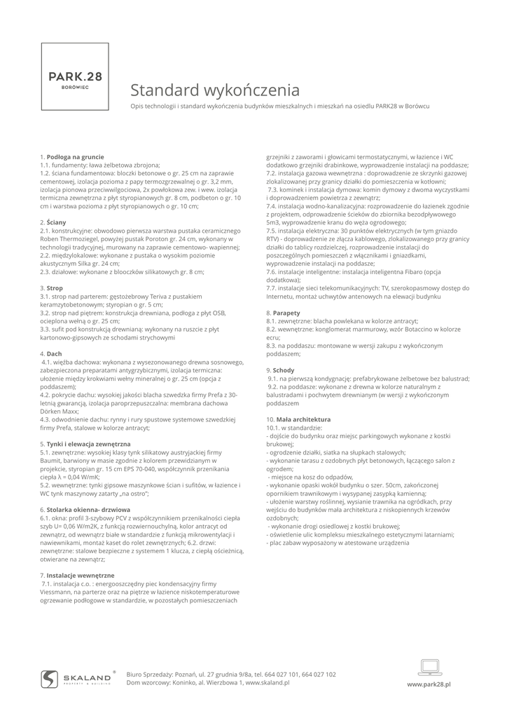 Standard wykończenia Opis technologii i standard wykończenia budynków mieszkalnych i mieszkań na osiedlu PARK28 w Borówcu 1. Podłoga na gruncie 1.1. fundamenty: ława żelbetowa zbrojona; 1.2. ściana fundamentowa: bloczki betonowe o gr. 25 cm na zaprawie cementowej, izolacja pozioma z papy termozgrzewalnej o gr. 3,2 mm, izolacja pionowa przeciwwilgociowa, 2x powłokowa zew. i wew. izolacja termiczna zewnętrzna z płyt styropianowych gr. 8 cm, podbeton o gr. 10 cm i warstwa pozioma z płyt styropianowych o gr. 10 cm; 2. Ściany 2.1. konstrukcyjne: obwodowo pierwsza warstwa pustaka ceramicznego Roben Thermoziegel, powyżej pustak Poroton gr. 24 cm, wykonany w technologii tradycyjnej, murowany na zaprawie cementowo- wapiennej; 2.2. międzylokalowe: wykonane z pustaka o wysokim poziomie akustycznym Silka gr. 24 cm; 2.3. działowe: wykonane z blooczków silikatowych gr. 8 cm; 3. Strop 3.1. strop nad parterem: gęstożebrowy Teriva z pustakiem keramzytobetonowym; styropian o gr. 5 cm; 3.2. strop nad piętrem: konstrukcja drewniana, podłoga z płyt OSB, ocieplona wełną o gr. 25 cm; 3.3. sufit pod konstrukcją drewnianą: wykonany na ruszcie z płyt kartonowo-gipsowych ze schodami strychowymi 4. Dach 4.1. więźba dachowa: wykonana z wysezonowanego drewna sosnowego, zabezpieczona preparatami antygrzybicznymi, izolacja termiczna: ułożenie między krokwiami wełny mineralnej o gr. 25 cm (opcja z poddaszem); 4.2. pokrycie dachu: wysokiej jakości blacha szwedzka firmy Prefa z 30letnią gwarancją, izolacja paroprzepuszczalna: membrana dachowa Dörken Maxx; 4.3. odwodnienie dachu: rynny i rury spustowe systemowe szwedzkiej firmy Prefa, stalowe w kolorze antracyt; 5. Tynki i elewacja zewnętrzna 5.1. zewnętrzne: wysokiej klasy tynk silikatowy austryjackiej firmy Baumit, barwiony w masie zgodnie z kolorem przewidzianym w projekcie, styropian gr. 15 cm EPS 70-040, współczynnik przenikania ciepła λ = 0,04 W/mK; 5.2. wewnętrzne: tynki gipsowe maszynkowe ścian i sufitów, w łazience i WC tynk maszynowy zatarty „na ostro”; 6. Stolarka okienna- drzwiowa 6.1. okna: profil 3-szybowy PCV z współczynnikiem przenikalności ciepła szyb U= 0,06 W/m2K, z funkcją rozwiernouchylną, kolor antracyt od zewnątrz, od wewnątrz białe w standardzie z funkcją mikrowentylacji i nawiewnikami, montaż kaset do rolet zewnętrznych; 6.2. drzwi: zewnętrzne: stalowe bezpieczne z systemem 1 klucza, z ciepłą ościeżnicą, otwierane na zewnątrz; grzejniki z zaworami i głowicami termostatycznymi, w łazience i WC dodatkowo grzejniki drabinkowe, wyprowadzenie instalacji na poddasze; 7.2. instalacja gazowa wewnętrzna : doprowadzenie ze skrzynki gazowej zlokalizowanej przy granicy działki do pomieszczenia w kotłowni; 7.3. kominek i instalacja dymowa: komin dymowy z dwoma wyczystkami i doprowadzeniem powietrza z zewnątrz; 7.4. instalacja wodno-kanalizacyjna: rozprowadzenie do łazienek zgodnie z projektem, odprowadzenie ścieków do zbiornika bezodpływowego 5m3, wyprowadzenie kranu do węża ogrodowego; 7.5. instalacja elektryczna: 30 punktów elektrycznych (w tym gniazdo RTV) - doprowadzenie ze złącza kablowego, zlokalizowanego przy granicy działki do tablicy rozdzielczej, rozprowadzenie instalacji do poszczególnych pomieszczeń z włącznikami i gniazdkami, wyprowadzenie instalacji na poddasze; 7.6. instalacje inteligentne: instalacja inteligentna Fibaro (opcja dodatkowa); 7.7. instalacje sieci telekomunikacyjnych: TV, szerokopasmowy dostęp do Internetu, montaż uchwytów antenowych na elewacji budynku 8. Parapety 8.1. zewnętrzne: blacha powlekana w kolorze antracyt; 8.2. wewnętrzne: konglomerat marmurowy, wzór Botaccino w kolorze ecru; 8.3. na poddaszu: montowane w wersji zakupu z wykończonym poddaszem; 9. Schody 9.1. na pierwszą kondygnację: prefabrykowane żelbetowe bez balustrad; 9.2. na poddasze: wykonane z drewna w kolorze naturalnym z balustradami i pochwytem drewnianym (w wersji z wykończonym poddaszem 10. Mała architektura 10.1. w standardzie: - dojście do budynku oraz miejsc parkingowych wykonane z kostki brukowej; - ogrodzenie działki, siatka na słupkach stalowych; - wykonanie tarasu z ozdobnych płyt betonowych, łączącego salon z ogrodem; - miejsce na kosz do odpadów, - wykonanie opaski wokół budynku o szer. 50cm, zakończonej opornikiem trawnikowym i wysypanej zasypką kamienną; - ułożenie warstwy roślinnej, wysianie trawnika na ogródkach, przy wejściu do budynków mała architektura z niskopiennych krzewów ozdobnych; - wykonanie drogi osiedlowej z kostki brukowej; - oświetlenie ulic kompleksu mieszkalnego estetycznymi latarniami; - plac zabaw wyposażony w atestowane urządzenia 7. Instalacje wewnętrzne 7.1. instalacja c.o. : energooszczędny piec kondensacyjny firmy Viessmann, na parterze oraz na piętrze w łazience niskotemperaturowe ogrzewanie podłogowe w standardzie, w pozostałych pomieszczeniach Biuro Sprzedaży: Poznań, ul. 27 grudnia 9/8a, tel. 664 027 101, 664 027 102 Dom wzorcowy: Koninko, al. Wierzbowa 1, www.skaland.pl www.park28.pl