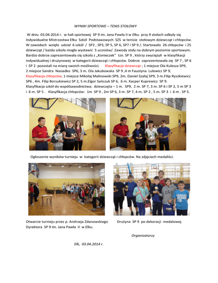 WYNIKI SPORTOWE – TENIS STOŁOWY W dniu 03.04.2014 r. w hali sportowej SP 9 im. Jana Pawła II w Ełku przy 9 stołach odbyły się Indywidualne Mistrzostwa Ełku Szkól Podstawowych SZS w tenisie stołowym dziewcząt i chłopców. W zawodach wzięło udział 6 szkół / SP2 , SP3, SP 5, SP 6, SP7 i SP 9 /. Startowało 26 chłopców i 25 dziewcząt / każda szkoła mogła wystawić 5 uczniów/. Zawody stały na dobrym poziomie sportowym. Bardzo dobrze zaprezentowała się szkoła z „Konieczek’’ tzn. SP 9 , którzy zwyciężyli w klasyfikacji indywidualnej i drużynowej w kategorii dziewcząt i chłopców. Dobrze zaprezentowała się SP 7 , SP 6 i SP 2 pozostali na miarę swoich możliwości. Klasyfikacja dziewcząt ; 1 miejsce Ola Kulesza SP9, 2 miejsce Sandra Nasiadko SP6, 3 m. Ola Jakubowska SP 9 ,4 m Faustyna Lulewicz SP 9, Klasyfikacja chłopców; 1 miejsce Mikołaj Malinowski SP9, 2m. Daniel Szałaj SP9, 3 m.Filip Ryszkiewicz SP6 , 4m. Filip Borsukiewicz SP 2, 5 m.Elgor Sańczuk SP 6, 6 m. Kacper Kuprewicz SP 9. Klasyfikacja szkół do współzawodnictwa; dziewczęta – 1 m. SP9, 2 m. SP 7, 3 m. SP 6 i SP 2, 5 m SP 3 i 6 m. SP 5 . Klasyfikacja chłopców- 1m SP 9 , 2m SP 6, 3 m. SP 7, 4 m. SP 2 , 5 m. SP 3 i 6 m . SP 5. Ogłoszenie wyników turnieju w kategorii dziewcząt i chłopców. Na zdjęciach medaliści. Otwarcie turnieju przez p. Andrzeja Zdanowskiego Dyrektora SP 9 im. Jana Pawła II w Ełku. Drużyna SP 9 po dekoracji medalowej. Organizatorzy Ełk, 03.04.2014 r.