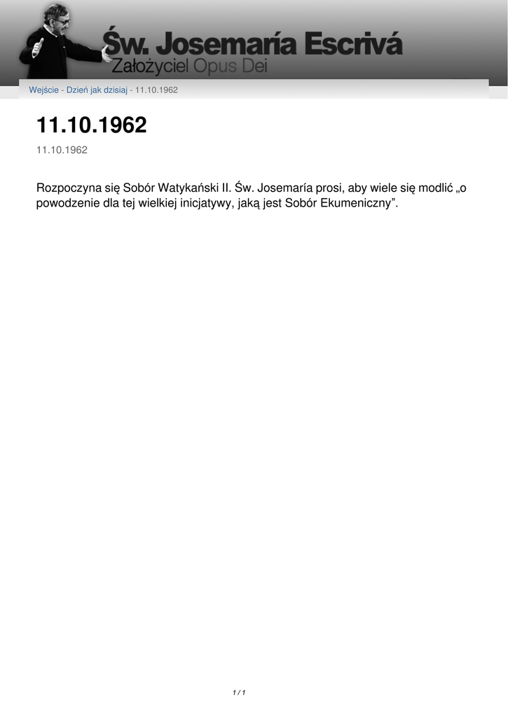 Wejście - Dzień jak dzisiaj - 11.10.1962 11.10.1962 11.10.1962 Rozpoczyna się Sobór Watykański II. Św. Josemaría prosi, aby wiele się modlić „o powodzenie dla tej wielkiej inicjatywy, jaką jest Sobór Ekumeniczny”. 1/1 Powered by TCPDF (www.tcpdf.org)