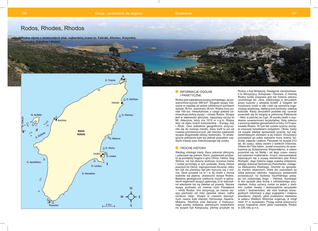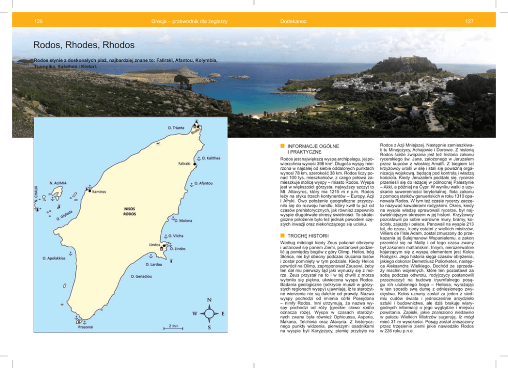 126 Grecja – przewodnik dla żeglarzy Dodekanez 127 Rodos, Rhodes, Rhodos Rodos słynie z doskonałych plaż, najbardziej znane to: Faliraki, Afantou, Kolymbia, Tsampika, Kalathos i Kiotari. n INFORMACJE OGÓLNE I PRAKTYCZNE Rodos jest największą wyspą archipelagu, jej powierzchnia wynosi 398 km2. Długość wyspy mierzona w najdalej od siebie oddalonych punktach wynosi 78 km, szerokość 38 km. Rodos liczy ponad 100 tys. mieszkańców, z czego połowa zamieszkuje stolicę wyspy – miasto Rodos. Wyspa jest w większości górzysta, najwyższy szczyt to Mt. Attavyros, który ma 1215 m n.p.m. Rodos leży na styku trzech kontynentów – Europy, Azji i Afryki. Owo położenie geograficzne przyczyniło się do rozwoju handlu, który kwitł tu już od czasów prehistorycznych, jak również zapewniło wyspie długotrwałe okresy świetności. To strategiczne położenie było też jednak powodem częstych inwazji oraz niekończącego się ucisku. n TROCHĘ HISTORII Według mitologii kiedy Zeus pokonał olbrzymy i ustanowił się panem Ziemi, postanowił podzielić ją pomiędzy bogów z góry Olimp. Helios, bóg Słońca, nie był obecny podczas rzucania losów i został pominięty w tym podziale. Kiedy Helios powrócił na Olimp, zaproponował Zeusowi, żeby ten dał mu pierwszy ląd jaki wynurzy się z morza. Zeus przystał na to i w tej chwili z morza wyłoniła się piękna, ukwiecona wyspa Rodos. Badania geologiczne (odkrycie muszli w górzystych regionach wyspy) ujawniają, iż te starożytne wierzenia nie są dalekie od prawdy. Nazwa wyspy pochodzi od imienia córki Posejdona – nimfy Rodos. Inni utrzymują, że nazwa wyspy pochodzi od róży (greckie słowo rodha oznacza różę). Wyspa w czasach starożytnych zwana była również Ophioussa, Asperia, Makaria, Telchinia oraz Atavyria. Z historycznego punkty widzenia, pierwszymi osadnikami na wyspie byli Karyjczycy, plemię przybyłe na Rodos z Azji Mniejszej. Następnie zamieszkiwali tu Minojczycy, Achajowie i Dorowie. Z historią Rodos ściśle związana jest też historia zakonu rycerskiego św. Jana, założonego w Jeruzalem przez kupców z włoskiej Amalfi. Z biegiem lat krzyżowcy urośli w siłę i stali się poważną organizacją wojskową, będącą pod kontrolą i władzą kościoła. Kiedy Jeruzalem poddało się, rycerze przenieśli się do leżącej w północnej Palestynie – Akki, a później na Cypr. W wyniku walki o uzyskanie suwerenności terytorialnej, flota zakonu z pomocą statków genueńskich w roku 1310 opanowała Rodos. W tym też czasie rycerzy zaczęto nazywać kawalerami rodyjskimi. Okres, kiedy na wyspie władzę sprawowali rycerze, był najświetniejszym okresem w jej historii. Krzyżowcy pozostawili po sobie warowne mury, bramy, kościoły, zajazdy i pałace. Panowali na wyspie 213 lat, do czasu, kiedy ostatni z wielkich mistrzów, Villiers de I’Isle Adam, został zmuszony do przekazania jej Sulejmanowi Wspaniałemu, a zakon przeniósł się na Maltę i od tego czasu zwany był zakonem maltańskim. Innym, nierozerwalnie kojarzącym się z wyspą elementem jest Kolos Rodyjski. Jego historia sięga czasów oblężenia, jakiego dokonał Demetriusz Poliorketes, następca Aleksandra Wielkiego. Dochód ze sprzedaży machin wojennych, które ten pozostawił za sobą podczas odwrotu, rodyjczycy postanowili przeznaczyć na budowę tryumfalnego posągu ich ulubionego boga – Heliosa, wyrażając w ten sposób swą dumę z odniesionego zwycięstwa. Kolos uznany został za jeden z siedmiu cudów świata i jednocześnie arcydzieło sztuki i budownictwa, ale dziś brakuje wiarygodnych informacji o jego wyglądzie i miejscu powstania. Zapiski, jakie znaleziono niedawno w pałacu Wielkich Mistrzów sugerują, iż mógł mieć 31 m wysokości. Posąg został zniszczony przez trzęsienie ziemi jakie nawiedziło Rodos w 226 roku p.n.e.