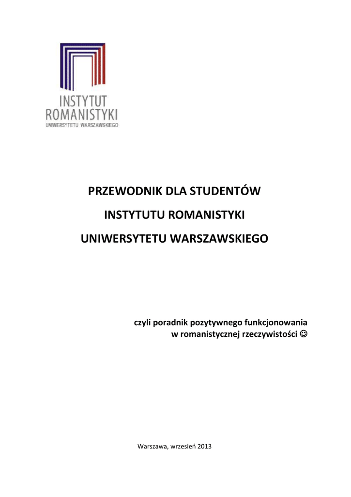 PRZEWODNIK DLA STUDENTÓW INSTYTUTU ROMANISTYKI UNIWERSYTETU WARSZAWSKIEGO czyli poradnik pozytywnego funkcjonowania w romanistycznej rzeczywistości Warszawa, wrzesień 2013 Bienvenue à la Romane ! Na jakie zajęcia mam się zapisać? Co zrobić w przypadku nieobecności na egzaminie? Gdzie znaleźć informacje o Erasmusie? Jaka jest procedura składania podań? Zapewne każdy z nas wiele razy szukał odpowiedzi na te czy inne pytania dotyczące studiowania w Instytucie Romanistyki Uniwersytetu Warszawskiego. Z myślą o wszystkich naszych Koleżankach i Kolegach, zwłaszcza tych, którzy dopiero rozpoczynają swoją przygodę z romanistyką, postanowiliśmy stworzyć studenckie kompendium, w którym będzie można łatwo znaleźć potrzebne informacje, jak i wiele przydatnych rad. Owoc naszej pracy polecamy także wszystkim pracownikom, którzy chcieliby się przekonać, jak wygląda instytutowe życie oczami Ich podopiecznych. Mamy nadzieję, że to opracowanie rozwieje wiele Waszych wątpliwości i znacznie ułatwi Wam funkcjonowanie na Dobrej 55. Poradnik podzieliliśmy na cztery rozdziały: 1. ORGANIZACJA Dowiesz się, jaka jest struktura Instytutu, kto go tworzy, kto jest za co odpowiedzialny i do kogo się zwracać w razie problemów. 2. STUDIOWANIE Upewnisz się, jakie obowiązują Cię programy, zajęcia, praktyki czy egzaminy oraz jak postępować w wyjątkowych sytuacjach, jaką jest na przykład niezaliczenie przedmiotu. 3. NIE TYLKO STUDIOWANIE Odszukasz informacje dotyczące życia akademickiego, widzianego niekoniecznie tylko z perspektywy nauki. 4. LINKI Znajdziesz zbiór stron internetowych przydatnych każdemu studentowi Instytutu Romanistyki. Udanej lektury! Zarząd Samorządu Studentów Instytutu Romanistyki UW 2 SPIS TREŚCI 1. ORGANIZACJA 1.1. Struktura Uczelni ............................................................................................................ 5 1.2. Władze Instytutu i jego struktura ................................................................................... 5 1.3. Ważne organy i postaci Instytutu ................................................................................... 6 1.4. Sekretariaty .................................................................................................................... 7 1.5. Dyżury pracowników ...................................................................................................... 8 1.6. Ośrodek Kultury Francuskiej UW ................................................................................... 8 2. STUDIOWANIE 2.1. Program studiów........................................................................................................... 9 2.1.1. Studia pierwszego stopnia: licencjat ....................................................................... 9 2.1.2. Studia drugiego stopnia: magisterium .................................................................. 13 2.1.3. Studia trzeciego stopnia: doktorat ........................................................................ 16 2.2. Zajęcia spoza Instytutu ................................................................................................. 17 2.2.1. Przedmioty ogólnouniwersyteckie (OGUN-y) ....................................................... 17 2.2.2. Zajęcia WF ............................................................................................................. 17 2.2.3. Lektoraty................................................................................................................ 17 2.2.4. Egzamin certyfikujący ............................................................................................ 18 2.3. Praktyki ......................................................................................................................... 19 2.3.1. Praktyki zawodowe ............................................................................................... 19 2.3.2. Praktyki pedagogiczne ........................................................................................... 20 2.4. Rejestracja na zajęcia ................................................................................................... 20 2.4.1. Rejestracja przez USOSweb ................................................................................... 20 2.4.2. Rejestracja żetonowa przez USOS-UL ................................................................... 21 2.5. Zajęcia - kwestie praktyyczne ....................................................................................... 22 2.5.1. USOS ...................................................................................................................... 22 2.5.2. Czas zajęć ............................................................................................................... 22 2.5.3. Kwadrans akademicki ............................................................................................ 23 2.5.4. Nieobecności ......................................................................................................... 23 2.5.5. Prace zaliczeniowe ................................................................................................ 23 2.5.6. Ankiety................................................................................................................... 24 2.6. Zaliczenie roku .............................................................................................................. 24 2.6.1. Oceny i zaliczenie przedmiotów ............................................................................ 24 2.6.2. Podpięcia ............................................................................................................... 25 2.6.3. Sesja egzaminacyjna .............................................................................................. 25 2.6.4. Indeks, karty egzaminacyjne, rozliczenie roku ...................................................... 25 2.6.5. Absolutorium i 