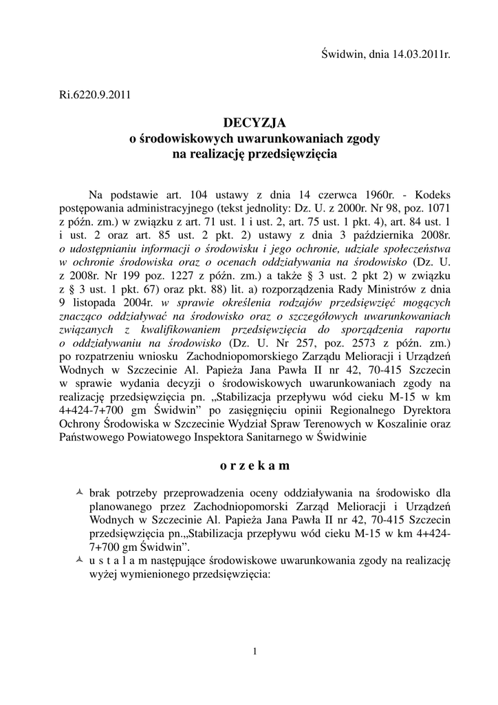 Świdwin, dnia 14.03.2011r. Ri.6220.9.2011 DECYZJA o środowiskowych uwarunkowaniach zgody na realizację przedsięwzięcia Na podstawie art. 104 ustawy z dnia 14 czerwca 1960r. - Kodeks postępowania administracyjnego (tekst jednolity: Dz. U. z 2000r. Nr 98, poz. 1071 z późn. zm.) w związku z art. 71 ust. 1 i ust. 2, art. 75 ust. 1 pkt. 4), art. 84 ust. 1 i ust. 2 oraz art. 85 ust. 2 pkt. 2) ustawy z dnia 3 października 2008r. o udostępnianiu informacji o środowisku i jego ochronie, udziale społeczeństwa w ochronie środowiska oraz o ocenach oddziaływania na środowisko (Dz. U. z 2008r. Nr 199 poz. 1227 z późn. zm.) a także § 3 ust. 2 pkt 2) w związku z § 3 ust. 1 pkt. 67) oraz pkt. 88) lit. a) rozporządzenia Rady Ministrów z dnia 9 listopada 2004r. w sprawie określenia rodzajów przedsięwzięć mogących znacząco oddziaływać na środowisko oraz o szczegółowych uwarunkowaniach związanych z kwalifikowaniem przedsięwzięcia do sporządzenia raportu o oddziaływaniu na środowisko (Dz. U. Nr 257, poz. 2573 z późn. zm.) po rozpatrzeniu wniosku Zachodniopomorskiego Zarządu Melioracji i Urządzeń Wodnych w Szczecinie Al. Papieża Jana Pawła II nr 42, 70-415 Szczecin w sprawie wydania decyzji o środowiskowych uwarunkowaniach zgody na realizację przedsięwzięcia pn. „Stabilizacja przepływu wód cieku M-15 w km 4+424-7+700 gm Świdwin” po zasięgnięciu opinii Regionalnego Dyrektora Ochrony Środowiska w Szczecinie Wydział Spraw Terenowych w Koszalinie oraz Państwowego Powiatowego Inspektora Sanitarnego w Świdwinie orzekam brak potrzeby przeprowadzenia oceny oddziaływania na środowisko dla planowanego przez Zachodniopomorski Zarząd Melioracji i Urządzeń Wodnych w Szczecinie Al. Papieża Jana Pawła II nr 42, 70-415 Szczecin przedsięwzięcia pn.„Stabilizacja przepływu wód cieku M-15 w km 4+4247+700 gm Świdwin”. u s t a l a m następujące środowiskowe uwarunkowania zgody na realizację wyżej wymienionego przedsięwzięcia: 1 I. Rodzaj i miejsce realizacji przedsięwzięcia: Rów M-15 w km 4+424 – 7+700 w m. Bełtno, gm. Świdwin, pow. świdwiński zlokalizowany jest na działkach rolników indywidualnych w obrębie ewidencyjnym Bełtno, gm Świdwin. Działki na których planowana inwestycja jest zlokalizowana: − działka nr 272/1, 283, 284, 270, 269/1, 251, 148, 147, 146, 144, 143, 141, 139, 137, 135, 133, 154/1, 153/1, 125, 124, 122, 120, 307, 152/1, 92, 16, 15, 14/1, 172/1, 53, 52/1, 50/1, 49, 45/1, 46, 47 obręb Bełtno 0026, − działka nr 138/5 obręb Lekowo Ciek o nazwie Rów M-15 stanowi prawobrzeżny dopływ rzeki Mołstowy. Odprowadza on wody powierzchniowe i podrenażowe z gruntów rolnych wsi Rusinowo i Bełtno. Planowane przedsięwzięcie inwestycyjne obejmuje swym zakresem remont (modernizację) koryta Rowu M-15 w km 4+424 – 7+700, poprzez jego pogłębienie (zdjęcie odłożonych warstw namułów), rozbudowę w przekroju poprzecznym poprzez złagodzenie nachylenia skarp celem nadania prawidłowych parametrów hydraulicznych dla zapewnienia swobodnego odpływu wód podrenażowych i przepływu wód powierzchniowych wezbraniowych oraz na przebudowie istniejących zdegradowanych przepustów zlokalizowanych w km cieku: 5+344 – przepust o średnicy 1,2 i długości L=12m 6 +156 – przepust o średnicy 0,4 i długości L=4,0m 6+235 – przepust o średnicy 0,4 i długości L=8,0m 6+493 – przepust o średnicy 0,4 i długości L=8,0m 6+661 – przepust o średnicy 2x0,4 i długości L=6,0m 6+992 – przepust o średnicy 0,4 i długości L=4,0m 7+141 – przepust o średnicy 0,4 i długości L=4,0m 7+195 – przepust o średnicy 0,4 i długości L=4,0m 7+354 – przepust o średnicy 0,4 i długości L=4,0m Wykonanie tej inwestycji zapewni odpływ wód ze zdrenowanych gruntów rolnych wsi Bełtno, które w chwili obecnej są często podtapiane. II. Warunki wykorzystania terenu w fazie realizacji i eksploatacji, ze szczególnym uwzględnieniem konieczności ochrony cennych wartości przyrodniczych, zasobów naturalnych i zabytków oraz ograniczenia uciążliwości dla terenów sąsiednich: roboty budowlane w zakresie związanym z realizacją przedsięwzięcia należy wykonywać tylko w porze dziennej w godzinach 6ºº-22ºº i przy użyciu sprawnego sprzętu, 2 w trakcie prac budowlanych należy zapewnić prawidłową gospodarkę paliwową i przeciwdziałać ewentualnym wyciekom substancji ropopochodnych do środowiska gruntowo-wodnego, prowadzić selektywną zbiórkę powstałych odpadów w wydzielonych i przystosowanych miejscach w warunkach chroniących środowisko przed przedostawaniem się do niego substancji szkodliwych i sukcesywnie przekazywać je wyspecjalizowanym jednostkom posiadającym stosowne zezwolenia w zakresie godpodarki odpadami, odpady w postaci gleby i ziemi w miarę możliwości wykorzystać we własnym zakresie lub przekazać uprawnionym odbiorcom, zagospodarowywać odpady powstające w trakcie robót ziemnych tylko wtedy, gdy nie będą zanieczyszczone substancjami niebezpiecznymi. III. Wymagania dotyczące ochrony środowiska konieczne do uwzględnienia w projekcie budowlanym: inwestycja na etapie realizacji powinna minimalnie wpływać na stan środowiska, w procesie budowy postępować zgodnie z obowiązującymi w tym zakresie przepisami; teren budowy po wykonaniu prac doprowadzić do stanu pierwotnego. IV. Wymogi w zakresie przeciwdziałania skutkom awarii przemysłowych w odniesieniu do przedsięwzięć zaliczanych do zakładów stwarzających zagrożenie wystąpienia poważnych awarii. Przedmiotowe przedsięwzięcie nie spełnia warunków, o których mowa w rozporządzeniu Ministra Gospodarki z dnia 9 kwietnia 2002r. w sprawie rodzajów i ilości substancji niebezpiecznych, których znajdowanie się w zakładzie decyduje o zaliczeniu go do zakładu o zwiększonym ryzyku, albo zakładu o dużym ryzyku wystąpienia poważnej awarii przemysłowej (Dz. U. Nr 58, poz. 535 z późn. zm.). V. Wymogi w za