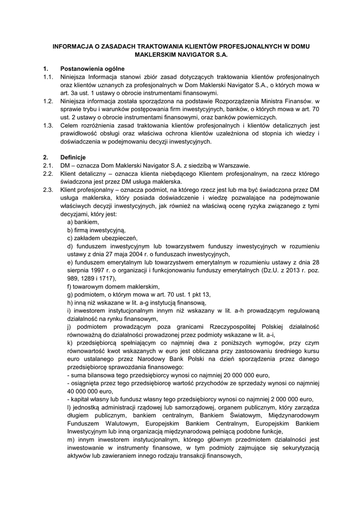 INFORMACJA O ZASADACH TRAKTOWANIA KLIENTÓW PROFESJONALNYCH W DOMU MAKLERSKIM NAVIGATOR S.A. 1. 1.1. 1.2. 1.3. 2. 2.1. 2.2. 2.3. Postanowienia ogólne Niniejsza Informacja stanowi zbiór zasad dotyczących traktowania klientów profesjonalnych oraz klientów uznanych za profesjonalnych w Dom Maklerski Navigator S.A., o których mowa w art. 3a ust. 1 ustawy o obrocie instrumentami finansowymi. Niniejsza informacja została sporządzona na podstawie Rozporządzenia Ministra Finansów. w sprawie trybu i warunków postępowania firm inwestycyjnych, banków, o których mowa w art. 70 ust. 2 ustawy o obrocie instrumentami finansowymi, oraz banków powierniczych. Celem rozróżnienia zasad traktowania klientów profesjonalnych i klientów detalicznych jest prawidłowość obsługi oraz właściwa ochrona klientów uzależniona od stopnia ich wiedzy i doświadczenia w podejmowaniu decyzji inwestycyjnych. Definicje DM – oznacza Dom Maklerski Navigator S.A. z siedzibą w Warszawie. Klient detaliczny – oznacza klienta niebędącego Klientem profesjonalnym, na rzecz którego świadczona jest przez DM usługa maklerska. Klient profesjonalny – oznacza podmiot, na którego rzecz jest lub ma być świadczona przez DM usługa maklerska, który posiada doświadczenie i wiedzę pozwalające na podejmowanie właściwych decyzji inwestycyjnych, jak również na właściwą ocenę ryzyka związanego z tymi decyzjami, który jest: a) bankiem, b) firmą inwestycyjną, c) zakładem ubezpieczeń, d) funduszem inwestycyjnym lub towarzystwem funduszy inwestycyjnych w rozumieniu ustawy z dnia 27 maja 2004 r. o funduszach inwestycyjnych, e) funduszem emerytalnym lub towarzystwem emerytalnym w rozumieniu ustawy z dnia 28 sierpnia 1997 r. o organizacji i funkcjonowaniu funduszy emerytalnych (Dz.U. z 2013 r. poz. 989, 1289 i 1717), f) towarowym domem maklerskim, g) podmiotem, o którym mowa w art. 70 ust. 1 pkt 13, h) inną niż wskazane w lit. a-g instytucją finansową, i) inwestorem instytucjonalnym innym niż wskazany w lit. a-h prowadzącym regulowaną działalność na rynku finansowym, j) podmiotem prowadzącym poza granicami Rzeczypospolitej Polskiej działalność równoważną do działalności prowadzonej przez podmioty wskazane w lit. a-i, k) przedsiębiorcą spełniającym co najmniej dwa z poniższych wymogów, przy czym równowartość kwot wskazanych w euro jest obliczana przy zastosowaniu średniego kursu euro ustalanego przez Narodowy Bank Polski na dzień sporządzenia przez danego przedsiębiorcę sprawozdania finansowego: - suma bilansowa tego przedsiębiorcy wynosi co najmniej 20 000 000 euro, - osiągnięta przez tego przedsiębiorcę wartość przychodów ze sprzedaży wynosi co najmniej 40 000 000 euro, - kapitał własny lub fundusz własny tego przedsiębiorcy wynosi co najmniej 2 000 000 euro, l) jednostką administracji rządowej lub samorządowej, organem publicznym, który zarządza długiem publicznym, bankiem centralnym, Bankiem Światowym, Międzynarodowym Funduszem Walutowym, Europejskim Bankiem Centralnym, Europejskim Bankiem Inwestycyjnym lub inną organizacją międzynarodową pełniącą podobne funkcje, m) innym inwestorem instytucjonalnym, którego głównym przedmiotem działalności jest inwestowanie w instrumenty finansowe, w tym podmioty zajmujące się sekurytyzacją aktywów lub zawieraniem innego rodzaju transakcji finansowych, n) podmiotem innym niż wskazane w lit. a-m, który na swój wniosek został przez firmę inwestycyjną uznany za klienta profesjonalnego na podstawie art. 3a ust. 1 Ustawy chyba, że Klient profesjonalny został inaczej określony w przepisach prawa powszechnie obowiązującego. W takim przypadku przez Klienta profesjonalnego rozumie się podmiot określony w tych przepisach. 2.4. Rozporządzenie – oznacza rozporządzenie Ministra Finansów w sprawie trybu i warunków postępowania firm inwestycyjnych, banków, o których mowa w art. 70 ust. 2 ustawy o obrocie instrumentami finansowymi, oraz banków powierniczych (tj. Dz.U. z 2015 r. poz. 878). 2.5. Ustawa – oznacza ustawę z dnia 29 lipca 2005 roku o obrocie instrumentami finansowymi (tj. Dz.U. z 2014 r. poz. 94). 2.6. zmiana kategoryzacji – oznacza dokonaną zgodnie z art. 3a Ustawy na wniosek Klienta zmianę zasad traktowania go przez DM. 3. 3.1. 3.2. 3.3. 3.4. 3.4.1. 3.4.2. 3.4.3. 3.4.4. 3.4.5. 3.4.6. 3.4.7. 3.4.8. 3.4.9. Zasady traktowania klientów profesjonalnych Klient profesjonalny zobowiązany jest do przekazywania do DM informacji o zmianie danych, które mają wpływ na możliwość traktowania go jako Klienta profesjonalnego. Klienci profesjonalni ze względu na posiadane doświadczenie i wiedzę pozwalające na podejmowanie właściwych decyzji inwestycyjnych oraz na właściwą ocenę ryzyka związanego z tymi decyzjami podlegają mniejszej w stosunku do Klientów detalicznych ochronie. Przed zawarciem umowy z Klientem profesjonalnym DM informuje go o określonych w niniejszym dokumencie zasadach traktowania Klientów profesjonalnych oraz o możliwości złożenia wniosku o zmianę kategoryzacji. DM jest zwolniony w stosunku do Klienta profesjonalnego od obowiązku: przekazania szczegółowych informacji dotyczących reklamy i promocji (§9 ust 2 – 8 Rozporządzenia), przekazania szczegółowej informacji dotyczącej DM (§10 Rozporządzenia) w tym kosztów i opłat związanych z usługami maklerskimi świadczonymi przez DM, przekazania informacji na temat ustalania sposobu oceny efektywności świadczonej usługi zarządzania portfelem (§12 ust. 2 Rozporządzenia), powiadomienia o zasadach i sposobach, a także ryzykach wiążących się z usługą przechowywania lub rejestrowania instrumentów finansowych lub prowadzenia rachunków pieniężnych, o ile DM świadczy usługę przechowywania lub rejestrowania instrumentów finansowych lub prowadzenia rachunków pieniężnych (§14 ust. 1 Rozporządzenia), przekazania informacji dotyczących zobowiązań i zakresu odpowi