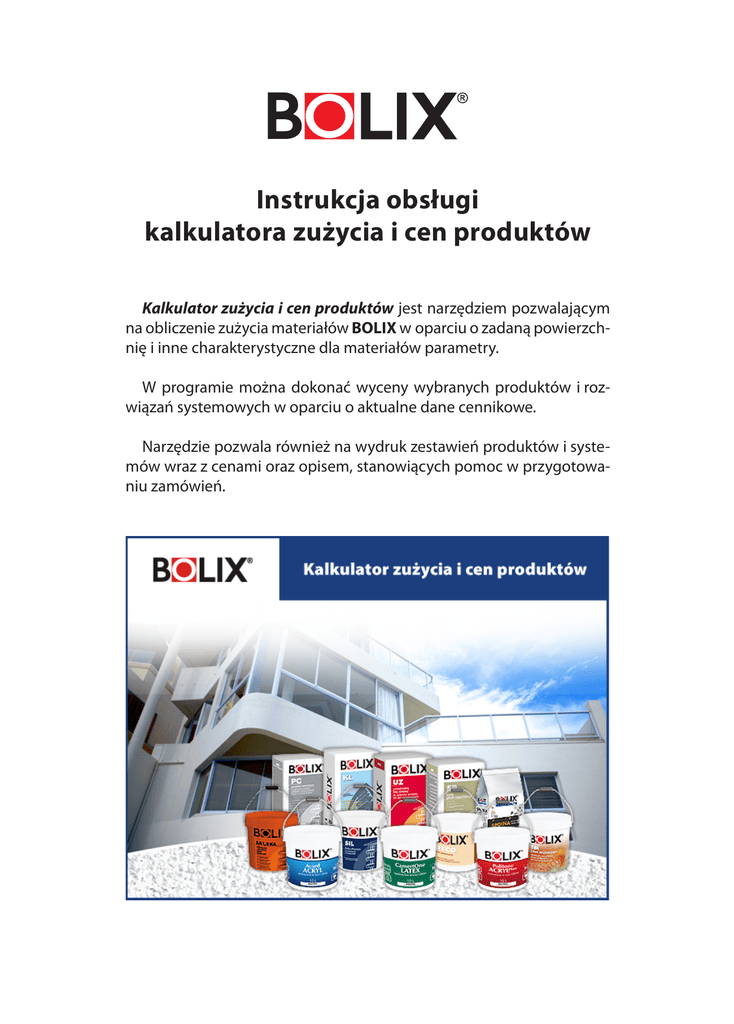 Instrukcja obsługi kalkulatora zużycia i cen produktów Kalkulator zużycia i cen produktów jest narzędziem pozwalającym na obliczenie zużycia materiałów BOLIX w oparciu o zadaną powierzchnię i inne charakterystyczne dla materiałów parametry. W programie można dokonać wyceny wybranych produktów i rozwiązań systemowych w oparciu o aktualne dane cennikowe. Narzędzie pozwala również na wydruk zestawień produktów i systemów wraz z cenami oraz opisem, stanowiących pomoc w przygotowaniu zamówień. Wskazywanie produktów Po uruchomieniu kalkulatora pojawia się okno graficzne, na którym widoczna jest po lewej stronie kolumna opisana „Produkty”. W tej kolumnie znajduje się drzewo produktów usystematyzowane zgodnie z ofertą firmy. Każdy produkt znajduje się w odpowiedniej grupie produktowej itd. Wyszukiwanie produktów, w ramach drzewa produktów, odbywa się poprzez klikanie na jego poszczególne elementy. Po kliknięciu na produkt z prawej strony ekranu, w oknie edycyjnym, pojawia się informacja o cechach produktu. Wskazywanie systemów W celu ułatwienie pracy użytkownikom, autorzy kalkulatora przygotowali gotowe zestawienia produktów, które oferowane są w formie systemów / rozwiązań budowlanych. Wskazywanie systemu odbywa się analogicznie do wskazywania produktu. W zakładce „Systemy” użytkownik wskazuje szukany system a następnie definiuje jego parametry. Wskazywanie i definiowanie parametrów produktów / systemów Kliknięcie na nazwę produktu na drzewie produktów powoduje włączenie się po prawej stronie ekranu okna właściwości produktu. Okno właściwości produktu posiada pola edycyjne charakterystyczne dla danego produktu np. kolor, rodzaju zużycia itp. Użytkownik ustawia w tym oknie parametry interesującego go produktu wraz z podaniem wielkości powierzchni, na której ma on być zastosowany. Wszystkie właściwości określa się poprzez klikanie bądź wpisywanie wartości. Dla części produktów zostały przygotowane karty techniczne w *.pdf, które można pobrać klikając na link pod nazwą produktu. Dodatkowo użytkownik może zdefiniować planowany do uzyskania rabat oraz zobaczyć, u dołu ekranu, koszt związany ze zużyciem danego produktu na planowanej powierzchni. Dodawanie produktu lub systemu do zakładki „Zestawienie elementów” Po poprawnym ustaleniu parametrów produktu lub systemu oraz powierzchni, na której ma on być zastosowany, użytkownik klikając na przycisk „dodaj do zestawienia”, znajdujący się u dołu ekranu, przenosi produkt do zakładki „zestawienie elementów”. W zakładce znajdują się wszystkie wskazane przez użytkownika produkty i systemy. Zakładka „Zestawienie sumaryczne / Wydruk” W tej zakładce znajduje się zestawienie wszystkich produktów wybranych przez użytkownika (w tym również pochodzących z wybranych przez użytkownika systemów). Z uwagi na fakt, iż systemy składają się z produktów zakładka „zestawienie sumaryczne” rozkłada systemy na poszczególne produkty tak, aby umożliwić użytkownikowi najbardziej optymalny zakup materiałów BOLIX. Po włączeniu opcji „optymalizuj opakowania”, użytkownik zestawia produkty wg najbardziej efektywnego, z punktu ceny danej wielkości opakowania, rozkładu. Gotowe zestawienie można wydrukować po kliknięciu na przycisk „drukuj”. Przycisk „Kontakt” Po kliknięciu na przycisk „Kontakt” użytkownik otrzymuje informacje teleadresowe w celu uzyskania kontaktu z najbliższym przedstawicielem BOLIX.