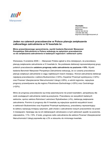 Kontakt: Dagmara Bałusz Manpower +48 22 504 08 52 +48 608 480 596 [email protected] Jeden na czterech pracodawców w Polsce planuje zwiększenie całkowitego zatrudnienia w IV kwartale br. Mimo przewidywanego spowolnienia, wyniki badania Barometr Manpower Perspektyw Zatrudnienia w Polsce wskazują na optymizm pracodawców co do zwiększania zatrudnienia w badanych regionach i sektorach rynku Warszawa, 9 września 2008 r. – Manpower Polska ogłosił w dniu dzisiejszym, Ŝe pracodawcy planują zwiększanie zatrudnienia w IV kwartale br. Na podstawie deklaracji reprezentatywnej grupy polskich pracodawców ustalono prognozę netto zatrudnienia na poziomie +19%. Wyniki badania Barometr Manpower Perspektyw Zatrudnienia wskazują, Ŝe co czwarty pracodawca planuje zwiększyć zatrudnienie w ciągu najbliŜszych trzech miesięcy. Wzrost zatrudnienia deklaruje najwięcej pracodawców z sektora Budownictwo (+34%), Kopalnie/ Przemysł wydobywczy (+32%) oraz Finanse/ Ubezpieczenia/ Nieruchomości/ Usługi (+29%), a wśród regionów, najwyŜsze prognozy przewidywane są dla regionu Południowo-Zachodniego (+25%) oraz Centralnego (+22%). Mimo Ŝe prognozy pracodawców są mniej optymistyczne niŜ przed kwartałem, perspektywy dla osób szukających zatrudnienia nadal są pozytywne. Pracodawcy ze wszystkich badanych sektorów, oprócz sektora Rolnictwo/ Leśnictwo/ Rybołówstwo (-4%), deklarują zwiększanie zatrudnienia. Pomimo iŜ prognozy dla IV kwartału są najwyŜsze spośród wszystkich branŜ w sektorach Budownictwo oraz Kopalnie/ Przemysł wydobywczy, pracodawcy reprezentujący te sektory wykazują mniejszy optymizm, jeśli chodzi o zatrudnienie nowych pracowników niŜ przed 3 miesiącami. Opierając się na ich deklaracjach odnotowano w tych sektorach spadki na poziomie, odpowiednio, 11% i 15%. Z kolei, prognoza netto zatrudnienia dla sektora Finanse/ Ubezpieczenia/ Nieruchomości/ Usługi poprawiła się o 2% w stosunku do minionego kwartału. 1 Pracodawcy ze wszystkich badanych regionów Polski oceniają plany wzrostu zatrudnienia w IV kwartale br. optymistycznie. Najwięcej pracodawców deklaruje zwiększenie zatrudnienia w regionie Południowo-Zachodnim (+25%) oraz Centralnym (+22%). W pozostałych 4 regionach przedsiębiorcy wydają się być bardziej ostroŜni, jeśli chodzi o optymizm związany z zatrudnianiem nowych pracowników, jednak takŜe planują zwiększanie zatrudnienia w najbliŜszym kwartale. W regionie Południowo-Zachodnim prognoza netto zatrudnienia obniŜyła się w stosunku do minionego kwartału o 1, a w regionie Centralnym o 12 punktów procentowych. „Barometr Manpower Perspektyw Zatrudnienia pełni funkcję barometru polskiej gospodarki. Obserwujemy, Ŝe kilka sektorów dynamicznie rośnie, podczas gdy inne zwalniają tempo rozwoju w IV kwartale br.” zauwaŜa Iwona Janas, Dyrektor Generalna Manpower Polska. „Prognoza netto zatrudnienia dla Polski sugeruje pozytywny trend na polskim rynku pracy i wskazuje, Ŝe polscy pracodawcy są w grupie wykazującej się największym optymizmem co do zwiększania zatrudnienia spośród przedsiębiorców z 33 badanych krajów. Mimo Ŝe wartości są niŜsze niŜ przed kwartałem, prognoza nadal jest pomyślna. Konsultanci Manpower w ponad 30 miastach takŜe w całym kraju cały czas obserwują duŜe zapotrzebowanie na pracowników”, dodaje Iwona Janas z Manpower. Większość pracodawców w badaniu globalnym deklaruje zmniejszenie tempa zatrudnienia – w 25 krajach prognoza netto zatrudnienia jest niŜsza w porównaniu z III kwartałem br. Ze wszystkich badanych krajów, najbardziej optymistyczne plany na IV kwartał br. deklarują pracodawcy z Indii (+43%), Kostaryki i Peru (+29%). Na podstawie deklaracji pracodawców z Singapuru, Tajwanu, Kolumbii, Rumunii, Polski, Argentyny, Australii i Republiki Południowej Afryki ustalono prognozy netto zatrudnienia w przedziale 25% - 17%. Dla kontrastu, przedstawiciele firm badanych we Włoszech, w Irlandii i Hiszpanii planują zatrudnienie w najbliŜszym kwartale najmniej pozytywnie (odpowiednio -2%, -3%, - 5%). Pesymizm respondentów z Hiszpanii jest największy od 2003 r., czyli od kiedy badanie jest w tym kraju przyprowadzane. W regionie Europa, Bliski Wschód, Afryka, pracodawcy ze wszystkich krajów, oprócz Włoch, Irlandii i Hiszpanii, planują zwiększenie zatrudnienia w IV kwartale br. Najbardziej optymistyczne prognozy są dla Rumunii (+21%), Polski (+19%) i Grecji (+12%) – krajów, które dołączyły do badania w II kwartale 2008 r. Prognozy dla Austrii, Belgii, Francji i Holandii pozostają na tym samym poziomie lub nieznacznie poprawiają się w stosunku do III kwartału 2008 r. Barometr Manpower Perspektyw Zatrudnienia dla IV kwartału 2008 r. został opracowany 1 Regiony Polski według podziału Eurostatu: Centralny (łódzkie, mazowieckie), Południowo-Zachodni (dolnośląskie, opolskie), Południowy (małopolskie, śląskie), Północno-Zachodni (wielkopolskie, zachodniopomorskie, lubuskie), Północny (kujawsko-pomorskie, warmińsko-mazurskie, pomorskie), Wschodni (lubelskie, podkarpackie, świętokrzyskie, podlaskie). na podstawie wywiadów indywidualnych obejmujących grupę 759 pracodawców reprezentującą 2 10 sektorów z 6 regionów Polski. Prognoza netto zatrudnienia to wynik analizy danych, jakie otrzymywane są z odpowiedzi na jedno pytanie: „Jakie są przewidywania dotyczące całkowitego zatrudnienia firmy w Pana/ Pani oddziale w ciągu trzech miesięcy, do końca grudnia w porównaniu do obecnego kwartału?”. Prognoza netto zatrudnienia to róŜnica pomiędzy procentem pracodawców przewidujących wzrost całkowitego zatrudnienia a procentem pracodawców deklarujących spadek całkowitego zatrudnienia w ich oddziale w najbliŜszym kwartale. Wynik ze znakiem dodatnim wskazuje planowany wzrost zatrudnienia, ze znakiem ujemnym – jego redukcję. Barometr Manpower Perspektyw Zatrudnienia to kwartalne badanie, które przeprowadzone zostało po