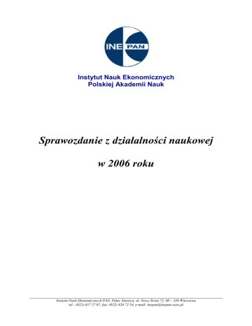 Instytut Nauk Ekonomicznych Polskiej Akademii Nauk Sprawozdanie z działalności naukowej w 2006 roku Instytut Nauk Ekonomicznych PAN, Pałac Staszica, ul. Nowy Świat 72, 00 – 330 Warszawa tel.: (022) 657 27 07, fax: (022) 826 72 54, e-mail: [email protected] Sprawozdanie z działalności INE PAN w 2006 roku SPRAWOZDANIE Z DZIAŁALNOŚCI INE PAN W 2006 ROKU 2 Sprawozdanie z działalności INE PAN w 2006 roku SPRAWOZDANIE Z DZIAŁALNOŚCI INSTYTUTU NAUK EKONOMICZNYCH PAN W 2006 ROKU DYREKTOR: Prof. dr hab. Leszek Jasiński PRZEWODNICZĄCY RADY NAUKOWEJ: Prof. dr hab. Cezary Józefiak Instytut posiada uprawnienia do nadawania stopnia naukowego doktora i doktora habilitowanego oraz do wnioskowania o nadawanie tytułu naukowego profesora nauk ekonomicznych. W roku sprawozdawczym w INE PAN nadano jeden stopień doktora nauk ekonomicznych. ZATRUDNIENIE Zatrudnienie średnioroczne w przeliczeniu na pełne etaty, zgodnie z obowiązującymi przepisami GUS wyniosło w 2006 roku 26,40 pracowników, w tym 18,88 naukowych. DZIAŁALNOŚĆ NAUKOWA Opublikowano łącznie 153 prace, wśród nich 13 monografii i opracowań indywidualnych, 39 fragmentów publikacji podręcznikowych, 32 publikacje w recenzowanych czasopismach naukowych oraz 69 innych publikacji. W 2006 roku działalność INE PAN koncentrowała się na następujących problemach badawczych: − determinanty konkurencyjności gospodarki, − uwarunkowania stabilizacji i rozwoju gospodarki polskiej, − relacje państwa i rynku we współczesnej gospodarce, − wpływ członkostwa w Unii Europejskiej na gospodarkę Polski, − determinanty zachowań polskich przedsiębiorstw, − prognozowanie bieŜącej sytuacji gospodarczej Polski. W ramach tej problematyki wykonano w Instytucie 32 prace statutowe. Realizowano 3 granty indywidualne sponsorowane przez Ministerstwo Nauki i Szkolnictwa WyŜszego: − Restrukturyzacja podmiotów działających w sferze kultury i źródeł ich finansowania, − Pierwsze doświadczenia adaptacji polskich przedsiębiorstw do zintegrowanego rynku Unii Europejskiej, − Narodowy Program Foresight „Polska 2020”. Realizowano 2 granty promotorskie: − Kapitał ludzki a transfer wiedzy technicznej poprzez zagraniczne inwestycje pośrednie, − Droga liberalizmu gospodarczego w koncepcjach ekonomistów Szkoły Krakowskiej. Wykonywano równieŜ prace przy 3 projektach finansowanych ze środków spoza puli znajdującej się w dyspozycji Ministerstwa Nauki i Szkolnictwa WyŜszego: − Raport o innowacyjności polskiej gospodarki, − Lista 500 największych polskich przedsiębiorstw, − Wartość dodana Wspólnej Polityki Rolnej dla UE i Polski. 3 Sprawozdanie z działalności INE PAN w 2006 roku W 2006 roku rozpoczęto równieŜ realizację 2 projektów finansowanych z funduszy strukturalnych Unii Europejskiej w ramach działania 1.4.5 Sektorowego Programu Operacyjnego „Wzrost Konkurencyjności Przedsiębiorstw”: − System Monitorowania i scenariusze rozwoju technologii medycznych w Polsce, − Scenariusze rozwoju technologii nowoczesnych materiałów metalicznych, ceramicznych i kompozytowych. W 2006 roku kontynuowano prace nad Raportem INE PAN Gospodarka Polski – Prognozy i Opinie. Raport przedstawia sytuację gospodarczą Polski, zawiera analizy kondycji poszczególnych sektorów tworzących dochód narodowy, między innymi: gospodarstw domowych, przedsiębiorstw, sektora rządowego i instytucji finansowych, jak równieŜ analizy międzynarodowych uwarunkowań wzrostu gospodarczego Polski oraz ocenę poświęconą polskiemu członkostwu w Unii Europejskiej. Istotnym elementem występującym w raporcie są krótkookresowe prognozy najwaŜniejszych wskaźników makroekonomicznych. W roku sprawozdawczym wydano dwie publikacje z tej serii, a ich promocja i upowszechnienie spotkało się z wysoką oceną praktyki gospodarczej i środowisk akademickich. Podobnie jak w latach poprzednich Instytut prowadził aktywną działalność seminaryjną. Odbyło się 13 spotkań, w których uczestniczyło ponad 500 przedstawicieli środowiska naukowego, praktyków gospodarczych, studentów, pracowników administracji państwowej oraz dziennikarzy. NaleŜy szczególną uwagę zwrócić na następujące spotkania: − „Perspektywy dla wzrostu gospodarczego w Polsce w 2006 roku”, Rafał Antczak, Witold Orłowski, Andrzej Sadowski, Bogdan WyŜnikowski, Marek Zuber, Zbigniew Hockuba, 19 stycznia 2006 r.; − „Rynek pracy we Francji” – Henryk Dunajewski, „The future of STI indicators and the challenges implied” – Fred Gault, 25 maja 2006 r.; − “PołoŜenie Polski – szanse i zagroŜenia”, Urszula Grzelońska, Krystyna Woźniak – Trzosek, Zbigniew Hockuba, Piotr Woźniak, Paweł Szałamacha, Adam Szejnfeld, Jacek Piechota, Rafał Wittmann, Jan Macieja, Igor Chalupec, Paweł Olechnowicz, Leszek Stokłosa, Marek Gorywoda, Dariusz Fajkowski, Robert Gwiazdowski, Jacek Wróblewski, debata gospodarcza, 21 czerwca 2006 r.; − “Wpływ wydarzeń politycznych na wahania kursów walutowych” – Christian Fahrholz, „Oczekiwane perspektywy rozwoju społeczno – gospodarczego Rosji” – Lev Vasilievich Nikiforow, Dmitri Sorokin, 31 października 2006 r. W roku sprawozdawczym odbywały się równieŜ seminaria mające charakter warsztatów naukowych poświęconych prezentacji najwaŜniejszych wyników prac statutowych prowadzonych w Instytucie. Warto podkreślić, iŜ w ramach prac o charakterze mikroekonomicznym przeprowadzono kolejną edycję monitoringu zmian efektywności funkcjonowania największych przedsiębiorstw produkcyjnych, usługowych i finansowych oraz przygotowano wspólnie z miesięcznikiem „Polish Market” ranking polskich przedsiębiorstw „Perły Polskiej Gospodarki”. Ogłoszenie wyników oraz wręczenie nagród wyróŜnionym firmom w rankingu „Perły Polskiej Gospodarki” odbyło się na Gali jubileuszowej 10-lecia miesięcznika Polish Market. Pod patronatem honorowym Ministerstw