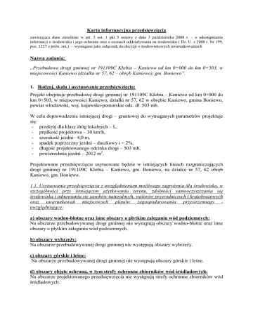 Karta informacyjna przedsięwzięcia zawierająca dane określone w art. 3 ust. 1 pkt 5 ustawy z dnia 3 października 2008 r. – o udostępnianiu informacji o środowisku i jego ochronie oraz o ocenach oddziaływania na środowisko ( Dz. U. z 2008 r. Nr 199, poz. 1227 z późn. zm.) – wymagana jako załącznik do decyzji o środowiskowych uwarunkowaniach Nazwa zadania: „Przebudowa drogi gminnej nr 191109C Kłobia – Kaniewo od km 0+000 do km 0+503, w miejscowości Kaniewo (działka nr 57, 62 – obręb Kaniewo), gm. Boniewo”. 1. Rodzaj, skala i usytuowanie przedsięwzięcia: Projekt obejmuje przebudowę drogi gminnej nr 191109C Kłobia – Kaniewo od km 0+000 do km 0+503, w miejscowości Kaniewo, działki nr 57, 62 w obrębie Kaniewo, gmina Boniewo, powiat włocławski, woj. kujawsko-pomorskie odc. dł. 503 mb. W celu doprowadzenia istniejącej drogi – gruntowej do wymaganych parametrów projektuje się: - przekrój dla klasy dróg lokalnych – L, - prędkość projektowa – 30 km/h, - szerokość jezdni– 4,0 m, - spadek poprzeczny jezdni – daszkowy i = 2%, - długość projektowanego odcinka drogi – 503 mb, - powierzchnia jezdni – 2012 m2. Projektowane przedsięwzięcie usytuowane będzie w istniejących liniach rozgraniczających drogi gminnej nr 191109C Kłobia – Kaniewo, gm. Boniewo, na działce nr 57, 62 obręb Kaniewo, gm. Boniewo. 1.1. Usytuowanie przedsięwzięcia z uwzględnieniem możliwego zagrożenia dla środowiska, w szczególności przy istniejącym użytkowaniu terenu, zdolności samooczyszczania się środowiska i odnawiania się zasobów naturalnych, walorów przyrodniczych i krajobrazowych oraz uwarunkowań miejscowych planów zagospodarowania przestrzennego uwzględniające: a) obszary wodno-błotne oraz inne obszary o płytkim zaleganiu wód podziemnych: Na obszarze przebudowywanej drogi gminnej nie występują obszary wodno-błotne oraz inne obszary o płytkim zaleganiu wód podziemnych. b) obszary wybrzeży: Na obszarze przebudowywanej drogi gminnej nie występują obszary wybrzeży. c) obszary górskie i leśne: Na obszarze przebudowywanej drogi gminnej nie występują obszary górskie i leśne. d) obszary objęte ochroną, w tym strefy ochronne zbiorników wód śródlądowych: Na obszarze projektowanego przedsięwzięcia nie występują strefy ochronne zbiorników wód śródlądowych. e) obszary wymagającej specjalnej ochrony ze względu na występowanie gatunków roślin i zwierząt lub innych siedlisk przyrodniczych objętych ochroną, w tym obszary natury 2000 oraz pozostałe formy ochrony przyrody: Na obszarze projektowanego przedsięwzięcia nie występują obszary wymagające specjalnej ochrony ze względu na występowanie gatunków roślin i zwierząt lub ich siedlisk lub siedlisk przyrodniczych objętych ochroną, w tym obszary Natury 2000. f) obszary, na których standardu jakości środowiska zostały przekroczone: W związku z projektowanym przedsięwzięciem nie występują przekroczenia standardów jakości środowiska w stosunku do stanu istniejącego. g) obszary o krajobrazie mającym znaczenie historyczne, kulturowe lub architektoniczne: Na obszarze projektowanego przedsięwzięcia nie występują obszary o krajobrazie mającym znaczenie historyczne, kulturowe lub architektoniczne. h) gęstość zaludnienia: Na terenie projektowanego przedsięwzięcia występują budynki jednorodzinne i gospodarcze. i) obszary przylegające do jezior: -nie występują j) uzdrowiska i obszary ochrony uzdrowiskowej: -nie występują Projektowana przebudowa drogi gminnej nie wpłynie na pogorszenie środowiska, pozostanie również bez wpływu na kryterium wykorzystania przylegających terenów. Projektowana inwestycja nie zmienia sposobu zagospodarowania terenu. 2. Powierzchnia zajmowanej nieruchomości, obiektu budowlanego oraz dotychczasowy sposób wykorzystywania i pokrycia szatą roślinną: Inwestycja prowadzona będzie w ciągu drogi gminnej, w obrębie działki nr 57 i 62 z obrębu Kaniewo, gm. Boniewo. Długość przebudowywanego odcinka drogi wynosi 503 m, a szacowana zajętość terenu w granicach pasa drogowego wynosi ok. 2012 m2. 2.1. Dotychczasowy sposób wykorzystania terenu (istniejące zagospodarowanie): Dotychczasowy sposób wykorzystania odcinka drogi Kłobia-Kaniewo jako drogi gminnej nie ulega zmianie. Przedmiotowa droga o nawierzchni gruntowej, obsługuje ruch lokalny miejscowości i łączy drogę powiatową nr 2914C Lubraniec – Boniewo – Cetty poprzez drogę gminną Kłobia – Nowa Kłobia w zarządzie gminy Lubraniec z drogą powiatową nr 2923C Kłobia - Szczytno tworząc ciąg komunikacyjny Lubraniec - Chodecz. Jezdnia drogi jest usytuowana w pasie drogowym o szerokości od 5.5 do 6,0 m. Korona drogi posiada jedną jezdnię o nawierzchni gruntowej o szerokości 4,0m, brak chodników oraz odwodnienia drogi. 2 Dotychczasowy sposób wykorzystania drogi jako drogi gminnej nie ulegnie zmianie. Wzdłuż granicy pasa drogowego na fragmentach rosną drzewa i zakrzaczenia. Nie przewiduje się usunięć drzew. Do nieruchomości zlokalizowanych przy drodze istnieją zjazdy, niektóre utwardzone różnymi materiałami, wykonane przez właścicieli przyległych posesji. Powierzchnia zajmowanego terenu nie ulegnie zmianie podczas budowy i dalszej eksploatacji. Forma użytkowania drogi nie ulegnie zmianie. Odwodnienie jezdni drogi odbywa się za pomocą spadków podłużnych i poprzecznych na istniejące pobocza gruntowe. 2.2. Obszary chronione: Projektowana przebudowa drogi gminnej nie jest objęta w obszarze chronionym. Teren przedsięwzięcia nie jest objęty ochroną konserwatora zabytków. 3. Rodzaj technologii: Zgodnie z informacją uzyskaną od projektanta dla całej szerokości jezdni projektuje się: - podwójne powierzchniowe utrwalanie nawierzchni grysem i emulsją, wgłębne spryskanie górnej warstwy podbudowy emulsją asfaltową, górna podbudowa z kruszywa łamanego uziarnienie od 5-31,5mm gr. 8 cm, dolna podbu