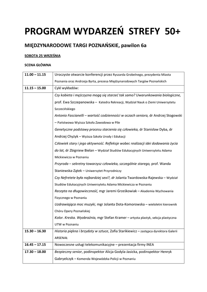 PROGRAM WYDARZEŃ STREFY 50+ MIĘDZYNARODOWE TARGI POZNAŃSKIE, pawilon 6a SOBOTA 25 WRZEŚNIA SCENA GŁÓWNA 11.00 – 11.15 Uroczyste otwarcie konferencji przez Ryszarda Grobelnego, prezydenta Miasta Poznania oraz Andrzeja Byrta, prezesa Międzynarodowych Targów Poznańskich 11.15 – 15.00 Cykl wykładów: Czy kobieta i mężczyzna mogą się starzeć tak samo? Uwarunkowania biologiczne, prof. Ewa Szczepanowska – Katedra Rekreacji, Wydział Nauk o Ziemi Uniwersytetu Szczecińskiego Antonio Fascianelli – wartość codzienności w oczach seniora, dr Andrzej Stogowski – Państwowa Wyższa Szkoła Zawodowa w Pile Genetyczne podstawy procesu starzenia się człowieka, dr Stanisław Dyba, dr Andrzej Chyżyk – Wyższa Szkoła Urody i Edukacji Człowiek stary i jego aktywność. Refleksje wobec realizacji idei dodawania życia do lat, dr Zbigniew Bielan – Wydział Studiów Edukacyjnych Uniwersytetu Adama Mickiewicza w Poznaniu Przyroda – sekretny towarzysz człowieka, szczególnie starego, prof. Wanda Staniewska-Zątek – Uniwersytet Przyrodniczy Czy Nefretete była najbardziej sexi?, dr Jolanta Twardowska-Rajewska – Wydział Studiów Edukacyjnych Uniwersytetu Adama Mickiewicza w Poznaniu Recepta na długowieczność, mgr Jaremi Grześkowiak – Akademia Wychowania Fizycznego w Poznaniu Uzdrawiająca moc muzyki, mgr Jolanta Dota-Komorowska – wieloletni kierownik Chóru Opery Poznańskiej Kolor. Kreska. Wyobraźnia, mgr Stefan Kramer – artysta plastyk, sekcja plastyczna UTW w Poznaniu 15.30 – 16.30 Historia piękna i brzydoty w sztuce, Zofia Starikiewicz – zastępca dyrektora Galerii ARSENAŁ 16.45 – 17.15 Nowoczesne usługi telekomunikacyjne – prezentacja firmy INEA 17.30 – 18.00 Bezpieczny senior, podinspektor Alicja Godyla-Jasicka, podinspektor Henryk Gabryelczyk – Komenda Wojewódzka Policji w Poznaniu SALE WARSZTATOWE 11.30 – 13.00 Sala 1 Warsztaty teatralne, Dom Bretanii 11.30-12.15 12.45-13.30 13.30 – 15.30 Warsztaty fotograficzne, Galeria Miejska „Arsenał” 14.00-14.45 16.00 – 17.45 Odkryj nadzieje i marzenia – wyrzeźb, namaluj to, czego pragniesz, Ośrodek Psychoterapii i Pomocy Psychologicznej „Rozmowa” 15.15-16.00 16.30-17.30 Sala 2 Internet dla seniora, Stowarzyszenie Wielkopolskich Doradców Kariery "WiDoK" Komórka dla seniora, Stowarzyszenie Wielkopolskich Doradców Kariery "WiDoK" Odkrywamy swoje talenty, szacujemy zasoby, Stowarzyszenie Wielkopolskich Doradców Kariery "WiDoK" Senior. Bezpieczeństwo osobiste, Wydział Zarządzania Kryzysowego i Bezpieczeństwa Urzędu Miasta Poznania Emerycie, kochaj życie!, Centrum Radości Życia Zgłoszenia na warsztaty przyjmowane są przed salami warsztatowymi w dniach targowych lub telefonicznie w Centrum Inicjatyw Senioralnych - 618472111. Zapisy prowadzone są do wyczerpania limitu miejsc. SCENA SPORTOWA 11.30 – 12.00 Joga dla seniorów, Centrum Radości Życia 12.15-12.45 Qigong leczniczy – starochińskie ćwiczenia usprawniające, Centrum Radości Życia 13.00 – 13.20 Choreoterapia – pokaz tańca terapeutycznego, Stowarzyszenie Integracja przez Ruch i Stowarzyszenie Ludzi III Wieku „Świerczewski Krąg” 13.30 – 13.45 Gimnastyka dla seniora, Stowarzyszenie Integracja przez Ruch 14.00 – 14.30 Nordic walking, instruktorzy: Marcin Szulc, Helena Brzozowska 14.40 – 15.00 Tai chi, Stowarzyszenie Taoistycznego Tai Chi Oddział Poznań 15.15 – 15.45 Ergometry rowerowe, Wielkopolskie Towarzystwo Krzewienia Kultury Fizycznej 16.00 – 16.30 Ćwiczenia siłowe, Wielkopolskie Towarzystwo Krzewienia Kultury Fizycznej 16.40 – 17.10 Ćwiczenia z pałeczkami, Wielkopolskie Towarzystwo Krzewienia Kultury Fizycznej Aerobik, Wielkopolskie Towarzystwo Krzewienia Kultury Fizycznej 17.20 – 17.50 SPEED BADMINTON PARK 10.00 – 18.00 Speedminton® Show: prezentacja sprzętu do gry, pokazy gry, konkurs „Zagraj z nami” 11:00 – 17:00 Akademia Speedbadminton.pl NIEDZIELA 26 WRZEŚNIA SCENA GŁÓWNA Cykl prelekcji: 11.00 – 11.30 Płaszczyzna „Forum 50+” – działania na rzecz i praca z osobami starszymi, Hanna Nowakowska – Forum 50+ 11.45 – 12.20 Seniorzy w akcji – Beata Tokarz-Kamińska, Towarzystwo Inicjatyw Twórczych „ę” 12.30 – 13.00 Bank Czasu – Małgorzata Kamińska, Stowarzyszenie „Lepszy Świat” 13.15 – 13.45 Nowoczesne technologie – w jaki sposób mogą być użyteczne dla seniorów – INTERSENIOR Gazeta Internetowa 14.00 – 14.50 MyPhone – oferta handlowa 15.00 – 15.45 Seksualność w jesieni życia – Izabela Turbaczewska-Brakoniecka, Ośrodek Psychoterapii i Pomocy Społecznej „Rozmowa” SALE WARSZTATOWE 11.00 – 12.00 12.30 – 13.30 14.00 – 16.00 Sala 1 Tanecznym krokiem po świecie – tańce w kręgu prowadzi Danuta Trzebińska-Kapczyńska Tanecznym krokiem po świecie – malowanie mandali prowadzi Danuta Trzebińska-Kapczyńska Warsztaty operowe, 11.00-13.00 Sala 2 Hobby Złotego Wieku - warsztaty malarskie, Centrum Radości Życia 13.30-14.15 Senior. Bezpieczeństwo osobiste, Wydział Zarządzania Kryzysowego i Bezpieczeństwa Urzędu Miasta Poznania 14.45-17.45 Marsz po zdrowie zespół „Diapazon” 16.30 – 17.30 Teatr Seniora – warsztat pracy z lalką, Fundacja ARS - instruktaż nordic walking, prowadzenie: Marcin Szulc, Helena Brzozowska Zgłoszenia na warsztaty przyjmowane są przed salami warsztatowymi w dniach targowych lub telefonicznie w Centrum Inicjatyw Senioralnych - 618472111. Zapisy prowadzone są do wyczerpania limitu miejsc. SCENA SPORTOWA 11.00 – 11.30 Ćwiczenia siłowe, Wielkopolskie Towarzystwo Krzewienia Kultury Fizycznej 11.40 – 12.10 Aerobik, Wielkopolskie Towarzystwo Krzewienia Kultury Fizycznej 12.20 – 12.50 Ćwiczenia z pałeczkami, Wielkopolskie Towarzystwo Krzewienia Kultury Fizycznej 13.00 – 13.30 Ergometry rowerowe, Wielkopolskie Towarzystwo Krzewienia Kultury Fizycznej 13.45 – 14.15 Nordic walking, instruktorzy: Marcin Szulc, Helena Brzozowska 14.30 – 14.50 Joga dla senioró