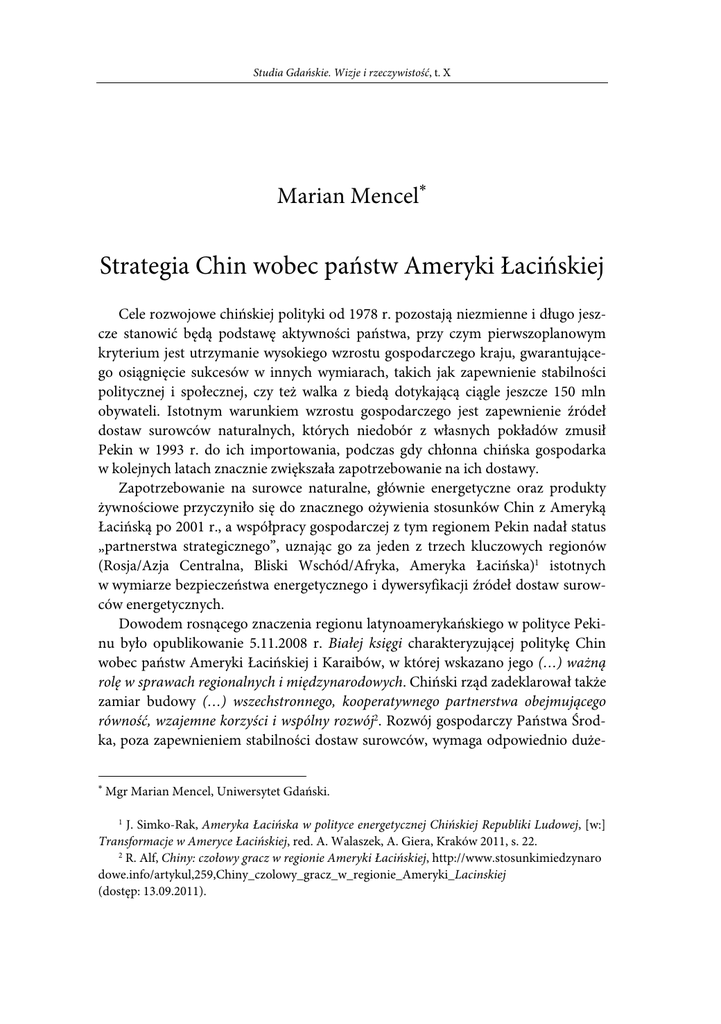Studia Gdańskie. Wizje i rzeczywistość, t. X Marian Mencel∗ Strategia Chin wobec państw Ameryki Łacińskiej Cele rozwojowe chińskiej polityki od 1978 r. pozostają niezmienne i długo jeszcze stanowić będą podstawę aktywności państwa, przy czym pierwszoplanowym kryterium jest utrzymanie wysokiego wzrostu gospodarczego kraju, gwarantującego osiągnięcie sukcesów w innych wymiarach, takich jak zapewnienie stabilności politycznej i społecznej, czy też walka z biedą dotykającą ciągle jeszcze 150 mln obywateli. Istotnym warunkiem wzrostu gospodarczego jest zapewnienie źródeł dostaw surowców naturalnych, których niedobór z własnych pokładów zmusił Pekin w 1993 r. do ich importowania, podczas gdy chłonna chińska gospodarka w kolejnych latach znacznie zwiększała zapotrzebowanie na ich dostawy. Zapotrzebowanie na surowce naturalne, głównie energetyczne oraz produkty żywnościowe przyczyniło się do znacznego ożywienia stosunków Chin z Ameryką Łacińską po 2001 r., a współpracy gospodarczej z tym regionem Pekin nadał status „partnerstwa strategicznego”, uznając go za jeden z trzech kluczowych regionów (Rosja/Azja Centralna, Bliski Wschód/Afryka, Ameryka Łacińska)1 istotnych w wymiarze bezpieczeństwa energetycznego i dywersyfikacji źródeł dostaw surowców energetycznych. Dowodem rosnącego znaczenia regionu latynoamerykańskiego w polityce Pekinu było opublikowanie 5.11.2008 r. Białej księgi charakteryzującej politykę Chin wobec państw Ameryki Łacińskiej i Karaibów, w której wskazano jego (…) ważną rolę w sprawach regionalnych i międzynarodowych. Chiński rząd zadeklarował także zamiar budowy (…) wszechstronnego, kooperatywnego partnerstwa obejmującego równość, wzajemne korzyści i wspólny rozwój2. Rozwój gospodarczy Państwa Środka, poza zapewnieniem stabilności dostaw surowców, wymaga odpowiednio duże∗ Mgr Marian Mencel, Uniwersytet Gdański. 1 J. Simko-Rak, Ameryka Łacińska w polityce energetycznej Chińskiej Republiki Ludowej, [w:] Transformacje w Ameryce Łacińskiej, red. A. Walaszek, A. Giera, Kraków 2011, s. 22. 2 R. Alf, Chiny: czołowy gracz w regionie Ameryki Łacińskiej, http://www.stosunkimiedzynaro dowe.info/artykul,259,Chiny_czolowy_gracz_w_regionie_Ameryki_Lacinskiej (dostęp: 13.09.2011). Strategia Chin wobec państw Ameryki Łacińskiej go i stale rosnącego rynku zbytu. Popyt wewnętrzny, pomimo stałego wzrostu stymulowanego przez pekiński rząd działaniami ekonomiczno-motywującymi nie zapewnia odbioru całego wolumenu produkcji chińskiej gospodarki. Przeciwnie, eksport ciągle jeszcze jest głównym źródłem dochodów państwa, a wymiana handlowa – ważnym źródłem akumulacji państwowych rezerw finansowych. Zatem polityka zagraniczna ukierunkowana jest na utrzymanie i pozyskiwanie kolejnych rynków zbytu i dotyczy w znacznej mierze także państw regionu Ameryki Łacińskiej, których znaczenie wpisuje się w międzynarodową politykę ekonomiczną nowych władz z Xi Jinpingiem na czele. Nowy przywódca KPCh i prezydent ChRL na przełomie maja i czerwca 2013 r. odwiedził Republikę Trynidadu i Tobago, Kostarykę i Meksyk3, poniekąd „przy okazji” wizyty w Stanach Zjednoczonych, podczas gdy faktycznym powodem wizyty były działania zmierzające do pogłębienia współpracy z państwami latynoamerykańskimi zasobnymi w surowce naturalne, głównie energetyczne, niezbędne do utrzymania dalszego wzrostu gospodarki Chin4. Aktywność ChRL w stosunkach z państwami latynoamerykańskimi przejawia się także na płaszczyźnie politycznej, szczególnie w związku z dążeniem Pekinu do ograniczania strefy wpływów i formalnych stosunków międzynarodowych Chińskiej Republiki na Tajwanie. Spośród 23 państw uznających Tajwan, aż 12 znajduje się w tym właśnie regionie. W 2007 r. Hu Jintao wizytę w Ameryce Łacińskiej rozpoczął od Kostaryki, która w czerwcu tego roku zerwała stosunki dyplomatyczne z Tajwanem i nawiązała je z ChRL5. Uwarunkowania chińskiej ekspansji gospodarczej w Ameryce Łacińskiej Ameryka Łacińska (Iberoameryka) to termin obejmujący 20 krajów i dziewięć autonomii Ameryki Południowej i Ameryki Środkowej, w których powszechnie używa się języków romańskich, głównie hiszpańskiego, portugalskiego lub francuskiego. Termin ten, po raz pierwszy pojawił się w 1856 r. w pismach kolumbijskiego pisarza i publicysty żyjącego i tworzącego na emigracji w Paryżu Jose Marii Torresa Caicedo. Niemal równocześnie zaczął używać takiej nazwy pisarz chilijski Francisco Bilbao6. Ameryka Łacińska zajmuje obszar ponad 21 mln km2, liczy 549 mln mieszkańców, a gęstość zaludnienia wynosi tam 26 osób na km2. Większość mieszkańców należy do kościoła katolickiego, który liczy 432 mln wyznawców (78,7% całej populacji)7. 3 http://polish.cri.cn/561/2013/05/21/242s117189.htm (dostęp: 11.09.2013). Por. http://www.rp.pl/artykul/1029165.html?print=tak&p=0 (dostęp: 20.10.2013). 5 Ibidem. 6 http://pl.wikipedia.org/wiki/Ameryka_%C5%81aci%C5%84ska (dostęp: 13.02.2013=. 7 Ibidem. 4 303 Marian Mencel Kraje Ameryki Łacińskiej posiadają bogate złoża wielu surowców. Zasoby ropy naftowej oceniane są na 8,5 mld ton (6,4% światowych zasobów), a gazu ziemnego na 6,3 bln m3 (4,3%), z czego 70% złóż ropy i 65% gazu zlokalizowanych jest w Wenezueli. Ponadto znajduje się tu ponad 1/3 światowych zasobów miedzi zlokalizowanych głównie w Chile. Znaczne zasoby złóż obejmują także rudy cyny i wolframu, rudy litu, cyny oraz berylu. Zasoby litu na terenie Chile stanowią blisko 60% zasobów światowych. W Brazylii złoża niobu szacowane są na 78% globalnych, a berylu na 40%. Istotne znaczenie dla gospodarki regionu mają także znaczne zasoby rud niklu i kobaltu na Kubie, złoża boksytów na Jamajce, w Surinamie, Gujanie, Wenezueli i Brazylii, a także rud żelaza w Brazylii. Ponadto region ten jest bogaty w złoża rud 