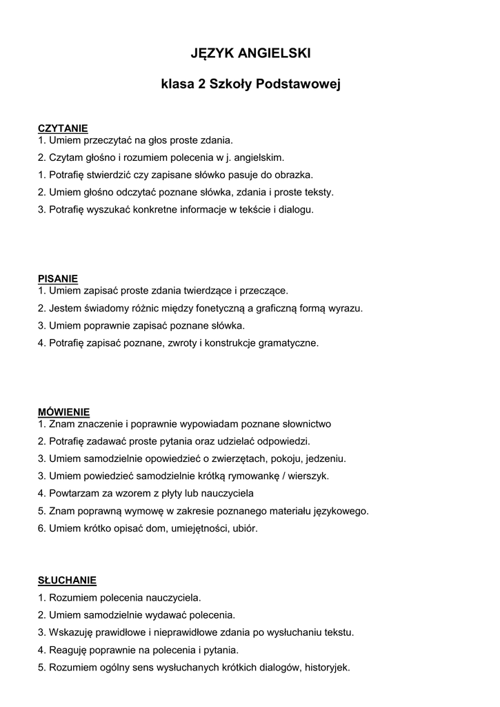 JĘZYK ANGIELSKI klasa 2 Szkoły Podstawowej CZYTANIE 1. Umiem przeczytać na głos proste zdania. 2. Czytam głośno i rozumiem polecenia w j. angielskim. 1. Potrafię stwierdzić czy zapisane słówko pasuje do obrazka. 2. Umiem głośno odczytać poznane słówka, zdania i proste teksty. 3. Potrafię wyszukać konkretne informacje w tekście i dialogu. PISANIE 1. Umiem zapisać proste zdania twierdzące i przeczące. 2. Jestem świadomy różnic między fonetyczną a graficzną formą wyrazu. 3. Umiem poprawnie zapisać poznane słówka. 4. Potrafię zapisać poznane, zwroty i konstrukcje gramatyczne. MÓWIENIE 1. Znam znaczenie i poprawnie wypowiadam poznane słownictwo 2. Potrafię zadawać proste pytania oraz udzielać odpowiedzi. 3. Umiem samodzielnie opowiedzieć o zwierzętach, pokoju, jedzeniu. 3. Umiem powiedzieć samodzielnie krótką rymowankę / wierszyk. 4. Powtarzam za wzorem z płyty lub nauczyciela 5. Znam poprawną wymowę w zakresie poznanego materiału językowego. 6. Umiem krótko opisać dom, umiejętności, ubiór. SŁUCHANIE 1. Rozumiem polecenia nauczyciela. 2. Umiem samodzielnie wydawać polecenia. 3. Wskazuję prawidłowe i nieprawidłowe zdania po wysłuchaniu tekstu. 4. Reaguję poprawnie na polecenia i pytania. 5. Rozumiem ogólny sens wysłuchanych krótkich dialogów, historyjek. GRAMATYKA 1. Zwroty: I am, I’m, He is, He’s, She is, She’s, 2. Zwroty: I’m not, He isn’t, She isn’t 3. Pytanie: Have you got? Has he/she got...? 4. Zwrot: I’ve got... I haven’t got 5. Zwroty: He /she/it has got…, He/She/ it hasn’t got 6. Przyimki: in, on, under. 7. Pytania: Is it on the ....? Is it under the ...? 8. Pytania: Can you...? Can he/she/ it ...? 9. Zwroty: I can/ can’t... 10. Zwroty: She likes .../ He likes ... She doesn’t like / He doesn’t like. 11. Pytanie: How many...? 6. Pytanie: Do you like...? 10. Zwrot: She’s / he’s wearing...... SŁOWNICTWO 1. My favourite things. Ulubione przedmioty i zabawki. 2. My family. Rodzina 3. My body and face. Części twarzy i ciała. 4. My room. Części domu i meble. 5. Liczebniki 1- 20. 6. Umiejętności i zwierzęta. 7. Nazwy produktów spożywczych. Nazwy posiłków. 8. Geografia. Środowisko naturalne 9. Środki transportu. 10. Clothes. Nazwy ubrań 11. Kultura i zwyczaje krajów anglojęzycznych.