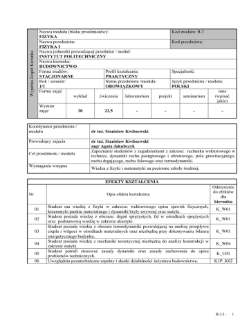 Wypełnia Zespół Kierunku Nazwa modułu (bloku przedmiotów): Kod modułu: B.3 FIZYKA Nazwa przedmiotu: Kod przedmiotu: FIZYKA I Nazwa jednostki prowadzącej przedmiot / moduł: INSTYTUT POLITECHNICZNY Nazwa kierunku: BUDOWNICTWO Forma studiów: Profil kształcenia: Specjalność: STACJONARNE PRAKTYCZNY Rok / semestr: Status przedmiotu /modułu: Język przedmiotu / modułu: 1/1 OBOWIĄZKOWY POLSKI Forma zajęć inne wykład ćwiczenia laboratorium projekt seminarium (wpisać jakie) Wymiar zajęć 30 22,5 - Koordynator przedmiotu / modułu Prowadzący zajęcia Cel przedmiotu / modułu Wymagania wstępne dr inż. Stanisław Kwitnewski dr inż. Stanisław Kwitnewski mgr Agata Jakubczyk Zapoznanie studentów z zagadnieniami z zakresu: rachunku wektorowego w technice, dynamiki ruchu postępowego i obrotowego, pola grawitacyjnego, ruchu drgającego, ruchu falowego oraz termodynamiki. Wiedza z fizyki i matematyki na poziomie szkoły średniej. EFEKTY KSZTAŁCENIA Opis efektu kształcenia Nr 01 02 03 04 05 06 Student ma wiedzę z fizyki w zakresie: wektorowego opisu zjawisk fizycznych, kinematyki punktu materialnego i dynamiki bryły sztywnej oraz statyki. Student posiada wiedzę z obszaru: drgań sprężystych, fal w ośrodkach sprężystych oraz podstawową wiedzę w zakresie akustyki. Student posiada wiedzę z obszaru termodynamiki pozwalającej na analizę przepływu ciepła i wilgoci w ośrodkach materialnych oraz niezbędną przy dokonywaniu bilansu energetycznego budynku. Student posiada wiedzę z mechaniki teoretycznej niezbędną do analizy konstrukcji w zakresie statyki. Student potrafi stosować zasady dynamiki oraz zasady zachowania do opisu problemów technicznych. Uwzględnia pozatechniczne aspekty i skutki działalności inżyniera budownictwa. Odniesienie do efektów dla kierunku K_W01 K_W01 K_W01 K_W04 K_U01 K1P_K02 B.3.I - 1 TREŚCI PROGRAMOWE Wykład Opis układu jednostek S.I. Wielkości wektorowe i skalarne, algebra wektorów. Opis ruchu, podstawy kinematyki ruchu postępowego i obrotowego. Dynamika ruchu punktu materialnego i układu oddziaływujących ze sobą ciał punktowych, podstawy statyki. Dynamika bryły sztywnej. Zasady zachowania energii, pole sił grawitacyjnych, zasada zachowania pędu, momentu pędu, zderzenia, maszyny proste. Elementy mechaniki teoretycznej. Ruch drgający harmoniczny i tłumiony, ruch drgający wymuszany – rezonans. Elementy akustyki: procesy falowe, zjawiska falowe na granicy dwóch środowisk, skala decybelowa dźwięku, efekt Dopplera i jego zastosowania w technice, fale uderzeniowe i ich zastosowania. Wybrane zagadnienia z termodynamiki opisowej: stany skupienia materii, zasady termodynamiki, procesy cykliczne odwracalne, procesy cykliczne nieodwracalne, cykl Carnot, sprawność silników termodynamicznych, odwrotny cykl Carnot – pompy cieplne, podstawy praw przepływu cieczy, równanie Bernouliego. Ćwiczenia Podczas ćwiczeń student wyrabia umiejętności zastosowania praktycznego uzyskanej w czasie wykładów wiedzy fizycznej. Rozwiązywanie zadań z zakresu: Kinematyki ruchów postępowego i obrotowego. Dynamiki, równania ruchu, warunki równowagi, maszyny proste. Mechaniki teoretycznej. Ruchu drgającego, drgającego wymuszanego i rezonansu. Literatura podstawowa Literatura uzupełniająca Metody kształcenia Bobrowski C.: Fizyka - krótki kurs. Jaworski B., Dietłaff A.: Kurs fizyki, PWN, Warszawa,1976 Massalski J., Masalska M.: Fizyka dla inżynierów. Resnick R., Halliday D.: Fizyka, PWN, Warszawa, 1994 Skrypt opracowany do uczenia fizyki w PWSZ Elbląg forma elektroniczna autor J.Tyrzyk 2. Skrypt – zbiór zadań z komentarzami i rozwiązaniami opracowany do uczenia fizyki w PWSZ Elbląg forma elektroniczna autor J.Tyrzyk 3. Skrypt zestawy tematyczne zadań do samodzielnego rozwiązywania. Opracowanie do zajęć z fizyki w PWSZ Elbląg Autor J.Tyrzyk. Forma elektroniczna 1. 2. 3. 4. 1. Wykład, prezentacja multimedialna, przykładowe doświadczenia. Ćwiczenia: rozwiązywania zadań rachunkowych o tematyce przedstawionej na wykładzie. Metody weryfikacji efektów kształcenia Egzamin pisemny Kolokwium zaliczające Forma i warunki zaliczenia Nr efektu kształcenia 01, 02, 03, 06 04, 05 Ćwiczenia: 2 kolokwia Wykład: egzamin pisemny (i/lub) ustny B.3.I - 2 NAKŁAD PRACY STUDENTA Udział w wykładach Samodzielne studiowanie tematyki wykładów Udział w ćwiczeniach audytoryjnych, laboratoryjnych, projektowych i seminariach Samodzielne przygotowywanie się do ćwiczeń* Przygotowanie projektu / eseju / itp. * Przygotowanie się do egzaminu / zaliczenia Udział w konsultacjach Inne ŁĄCZNY nakład pracy studenta w godz. Liczba punktów ECTS za przedmiot Liczba godzin 30 10 22,5 10 25 5 102,5 4 Liczba p. ECTS związana z zajęciami praktycznymi* Liczba p. ECTS za zajęciach wymagające bezpośredniego udziału nauczycieli akademickich 2,2 B.3.I - 3