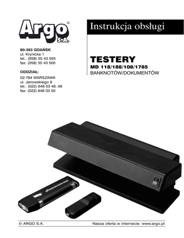 Instrukcja obsługi 80-393 GDAŃSK ul. Krynicka 1 tel.: (058) 55 43 555 fax: (058) 55 43 500 TESTERY ODDZIAŁ: MD 118/188/108/1785 BANKNOTÓW/DOKUMENTÓW 02-784 WARSZAWA ul. Janowskiego 9 tel.: (022) 648 03 48..49 fax: (022) 648 03 50 © ARGO S.A. Nasza oferta w internecie: www.argo.pl Testery sprawdzaja autentyczność banknotów na trzy różne sposoby, w różnych kombinacjach w zależności od modelu: - z wykorzystaniem światła UV do sprawdzania elementów fluorescencyjnych - światła białego do znaków wodnych - głowicy magnetycznej do badania znaczników magnetycznych. DANE TECHNICZNE POSZCZEGÓLNYCH MODELI MD 118 - Tester banknotów MD 118 posiada: - Świetlówkę ultrafioletową (4W) połączoną z tradycyjną latarką. - Zasilanie bateryjne – cztery baterie - „paluszki”. - Klips mocujący MD 188 - Tester banknotów MD 188 posiada: - Świetlówkę ultrafioletową (4W) - Trawała i masywna obudowa - Osłona zabezpieczająca MD 108 - Tester banknotów MD 108 jest najpopularniejszym modelem handlowym i posiada: - Świetlówkę ultrafioletową (4W) - Trawała i masywna obudowa - Osłona zabezpieczająca MD 1785 Tester banknotów MD 1785 dzięki sile emitowanego światła pozwala na stosowanie tego modelu w dowolnych warunkach otoczenia. Jest to profesjonalny tester banknotów używany głównie w bankach. Posiada: - dwie świetlówki podwyższonej mocy – po 6 W: a) ultrafioletową b) białą do sprawdzania znaków wodnych - trawała i masywna obudowa - osłona zabezpieczająca BANKNOTY ZE ZNAKAMI FLUORESCENCYJNYMI Banknot umieszczony pod światłem "UV" testera ukaże znak fluorescencyjny lub rysunek. Banknoty bez znaków fluorescencyjnych umieszczone w testerze nie pokażą żadnych zauważalnych zmian w kolorze, czy też teksturze. Znak wodny nie będzie widoczny. Metaliczny pasek pokaże się jako linia punktowana na froncie banknotu ale nie będzie widoczna na jego rewersie. UWAGA: Jeśli urządzenie posiada zamontowane zarówno światło "UV" jak i zwykłe światło, banknot powinien być najpierw sprawdzony pod lampą "UV", a dopiero później pod zwykłą aby sprawdzić znak wodny. © ARGO S.A. Nasza oferta w internecie: www.argo.pl BANKNOTY ZE ZNACZNIKAMI MAGNETYCZNYMI Tester (MD118) należy przyłożyć głowicą do banknotu. Następnie lekko przycisnąć i szybko pocierać fragment banknotu, w którym znajdują się znaczniki magnetyczne. W trakcie pocierania głowica musi być równo i dokładnie przyłożona do banknotu. Zapalająca się i mrugająca podczas pocierania banknotu, czerwona lampka testera, sygnalizuje istnienie znaczników magnetycznych. Różne waluty posiadają w rózny sposób rozmieszczone znaczniki magnetyczne. Optymalne miejsce testowania na banknocie należy dobrać doświadczalnie ( w polskich banknotach optymalne miejsce znajduje się w okolicach numeru seryjnego). FAŁSZYWE BANKNOTY Umieszczone pod testerem natychmiast ukażą intensywnie niebieski kolor. Znak wodny będzie dobrze widoczny a metaliczny pasek będzie można zobaczyć z obydwu stron banknotu jako linię ciągłą. Nie wszystkie fałszywe banknoty będą fluoryzowały, jeśli masz wątpliwości, sprawdź znak wodny, metaliczny pasek, druk, który powinien być czysty z wyraźnie zarysowanymi kolorami, jeśli banknot jest jeszcze w dobrym stanie, papier powinien być lekko chropowaty i wybrzuszony w obszarach gęsto zadrukowanych. Banknot nie powinien być giętki, błyszczący, bądź śliski. Jeśli banknot jest prawdziwy, znak wodny i metaliczny pasek będa widoczne na nim tak, jak opisano powyżej. SPRAWDZANIE DOKUMENTÓW Większość czeków bankowych/ kart kredytowych/ dokumentów/ biletów wejściowych posiada fluoryzujące rysunki lub wzory. Ukażą się one pod światłem „UV“. OSTRZEŻENIE! Tester wyposażony jest w świetlówkę ultrafioletową „UW“, która umieszczona jest w plastikowej obudowie. Nie używać urządzenia na wysokości wzroku, gdy emituje światło „UV“, ponieważ wystawienie oka wprost na działanie tego rodzaju światła może je uszkodzić. Średnia trwałość lampy „UV“ wynosi od 2000 do 4000 godzin ciągłego świecenia. Włączanie i wyłączanie świetlówki zmniejsza jej trwałość. UWAGA! Gwarancją objęty jest sam tester. Gwarancja nie obejmuje świetlówek i żarówek. © ARGO S.A. Nasza oferta w internecie: www.argo.pl
