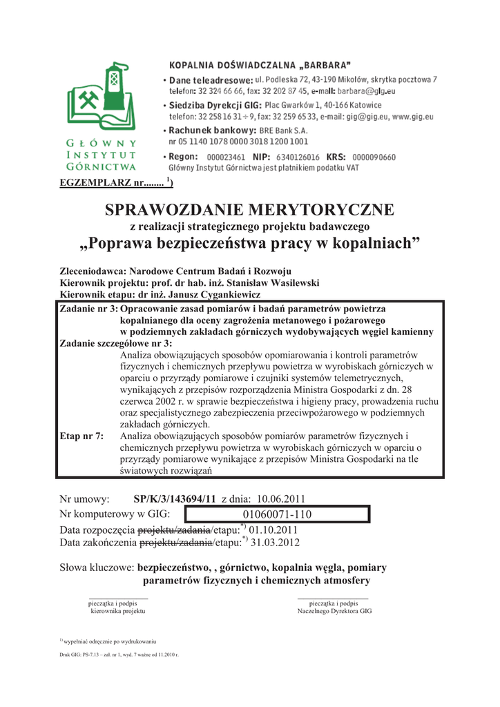 EGZEMPLARZ nr........ 1) SPRAWOZDANIE MERYTORYCZNE z realizacji strategicznego projektu badawczego „Poprawa bezpieczeĔstwa pracy w kopalniach” Zleceniodawca: Narodowe Centrum BadaĔ i Rozwoju Kierownik projektu: prof. dr hab. inĪ. Stanisáaw Wasilewski Kierownik etapu: dr inĪ. Janusz Cygankiewicz Zadanie nr 3: Opracowanie zasad pomiarów i badaĔ parametrów powietrza kopalnianego dla oceny zagroĪenia metanowego i poĪarowego w podziemnych zakáadach górniczych wydobywających wĊgiel kamienny Zadanie szczegóáowe nr 3: Analiza obowiązujących sposobów opomiarowania i kontroli parametrów fizycznych i chemicznych przepáywu powietrza w wyrobiskach górniczych w oparciu o przyrządy pomiarowe i czujniki systemów telemetrycznych, wynikających z przepisów rozporządzenia Ministra Gospodarki z dn. 28 czerwca 2002 r. w sprawie bezpieczeĔstwa i higieny pracy, prowadzenia ruchu oraz specjalistycznego zabezpieczenia przeciwpoĪarowego w podziemnych zakáadach górniczych. Etap nr 7: Analiza obowiązujących sposobów pomiarów parametrów fizycznych i chemicznych przepáywu powietrza w wyrobiskach górniczych w oparciu o przyrządy pomiarowe wynikające z przepisów Ministra Gospodarki na tle Ğwiatowych rozwiązaĔ Nr umowy: SP/K/3/143694/11 z dnia: 10.06.2011 Nr komputerowy w GIG: 01060071-110 *) Data rozpoczĊcia projektu/zadania/etapu: 01.10.2011 Data zakoĔczenia projektu/zadania/etapu:*) 31.03.2012 Sáowa kluczowe: bezpieczeĔstwo, , górnictwo, kopalnia wĊgla, pomiary parametrów fizycznych i chemicznych atmosfery 1) __________ ____________ pieczątka i podpis kierownika projektu pieczątka i podpis Naczelnego Dyrektora GIG wypeániaü odrĊcznie po wydrukowaniu Druk GIG: PS-7.13 – zaá. nr 1, wyd. 7 waĪne od 11.2010 r. Zespóá realizujący badania: stopieĔ - imiĊ i nazwisko dr. inĪ. Janusz CYGANKIEWICZ dr inĪ. Józef KNECHTEL, mgr inĪ. Dariusz GapiĔski mgr inĪ. Lucjan ĝwierczek mgr inĪ. Marek WiĊckowski Abstrakt: (minimum 500 znaków – maksimum 1000 znaków) W sprawozdaniu zamieszczono omówienie prac wykonanych w ramach etapu nr 7 zadania nr 3 Projektu. W trakcie pracy poddano analizie dotychczas stosowane metody pomiarów przyrzĊdami przenoœnymi parametrów fizycznych i chemicznych atmosfery wykonywane w z zwiĊzku z ocenĊ stanu zagroůenia poůarowego w kopalniach węgla kamiennego. Analizie poddano równieů obowiĊzujĊce przepisy regulujĊce bezpieczeľstwo pracy w górnictwie w zakresie wykonywania ww pomiarów i interpretacji ich wyników dla optymalnej oceny stanu zagroůenia poůarami endogenicznymi. Wnioski z tej analizy skonfrontowano z dotychczasowymi doœwiadczeniami Zakâadu Aerologii Górniczej GIG dla oceny zasadnoœci wprowadzenia do przepisów górniczych nowych uregulowaľ, dla lepszej oceny stanu zagroůenia poůarowego. Podano propozycje umieszczenia w przepisach górniczych szczegóâowych zapisów regulujĊcych następujĊce zagadnienia: dokâadnoœý pomiaru, kalibracja przyrządów, wyznaczanie lokalizacji punktów pomiaru, liczby punktów pomiarowych w danym rejonie, częstotliwoœý pomiaru, sposób interpretacji wyniku. Zaproponowano opracowanie przyrzĊdów umoůliwiajĊcych zintegrowany pomiar parametrów fizycznych i chemicznych powietrza kopalnianego dla szybkiej oceny zagroůenia poprzez automatyzację wyznaczania wartoœci wskaŭników poůarowych. StopieĔ ochrony sprawozdania merytorycznego:*) OgólnodostĊpne Do wykorzystania za zgodą kierownika jednostki/ komórki organizacyjnej GIG wiodącej w pracy Do wykorzystania za zgodą Naczelnego Dyrektora GIG lub ZastĊpcy Naczelnego Dyrektora ds. BadaĔ i WdroĪeĔ Do wykorzystania za zgodą Wnioskodawcy**) Zaáączniki (publikacje, zeszyty, páyty CD itp. w sposób trwaáy zawarte we wspólnym opakowaniu): 1. 2. Srawozdanie merytoryczne otrzymali: 1. Archiwum Dokumentacji Prac Naukowo-Badawczych w NCS-1 GIG, egz. nr 1 - kat. arch. „A” 2. Zleceniodawca, 3. Jednostka/komórka organizacyjna GIG, egz. nr 2, 3 4. Wnioskodawca,**) Wypeánia NCS-1 GIG: Nr inwentarzowy: Sygnatura: *) niepotrzebne skreĞliü **) dotyczy projektów celowych Strategiczny projekt badawczy „Poprawa bezpieczeĔstwa pracy w kopalniach” Zadanie szczegóáowe nr 3.Etap 7 Spis treĞci WstĊp I Analiza przepisów w zakresie pomiarów prowadzonych dla oceny zagroĪenia poĪarowego II Analiza Ğwiatowych rozwiązaĔ w zakresie prowadzonych pomiarów przez sáuĪby kopalniane III Propozycje zmian dotychczas obowiązujących sposobów pomiarów parametrów fizycznych i chemicznych powietrza przepáywającego przez wyrobiska górnicze ujĊtych w przepisach Ministra Gospodarki Wnioski Literatura WstĊp Opracowanie nowych zasad pomiarów stanu powietrza kopalnianego w celu oceny zagroůenia poůarowego wymaga analizy dotychczas stosowanych metod oceny zagroůenia poůarowego wynikajĊcych z aktualnych przepisów. Warunki prowadzenia dziaâalnoœci górniczej w kopalniach węgla kamiennego w okresie kilkudziesięciu ostatnich lat ulegây zasadniczej zmianie w stosunku do okresu tworzenia systemów eksploatacji. Wzrost gâębokoœci eksploatacji, koncentracja wydobycia oraz wzrost zagroůeľ naturalnych wymuszajĊ koniecznoœý podjęcia badaľ nad dostosowaniem sposobów pomiaru parametrów wentylacyjnych do zmieniajĊcych się warunków otoczenia górniczego. Pomiary przyrzĊdami przenoœnymi parametrów fizycznych dotyczĊ gâównie prĊdów obiegowych - z powodu ograniczonej dostępnoœci zrobów oraz stref zaizolowanych dla takich pomiarów. Natomiast parametry chemiczne – skâad atmosfery – mogĊ byý mierzone praktycznie w kaůdym miejscu kopalni za pomocĊ przyrzĊdów przenoœnych po zastosowaniu węůy lub rurek próbobiorczych oraz odpowiednich pomp. W poniůszej tabeli zestawiono róůnice w sposobach i zakresie pomiaru parametrów wentylacyjnych za pomocĊ przyrzĊdów przenoœnych i za pomocĊ telemetrii. Strona 1 Strategiczny projekt badawczy „Poprawa bezpieczeĔstwa pracy w kopalniac