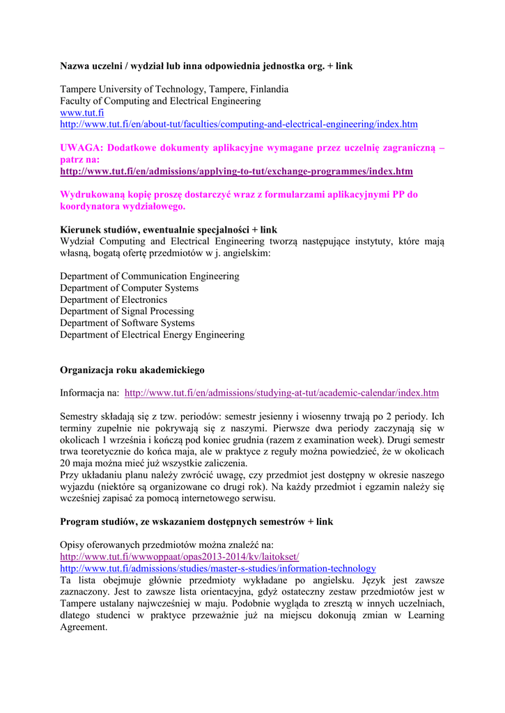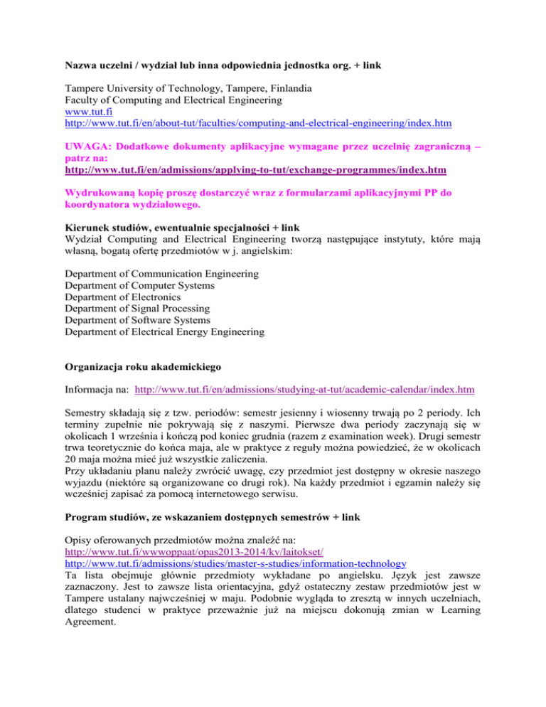 Nazwa uczelni / wydział lub inna odpowiednia jednostka org. + link Tampere University of Technology, Tampere, Finlandia Faculty of Computing and Electrical Engineering www.tut.fi http://www.tut.fi/en/about-tut/faculties/computing-and-electrical-engineering/index.htm UWAGA: Dodatkowe dokumenty aplikacyjne wymagane przez uczelnię zagraniczną – patrz na: http://www.tut.fi/en/admissions/applying-to-tut/exchange-programmes/index.htm Wydrukowaną kopię proszę dostarczyć wraz z formularzami aplikacyjnymi PP do koordynatora wydziałowego. Kierunek studiów, ewentualnie specjalności + link Wydział Computing and Electrical Engineering tworzą następujące instytuty, które mają własną, bogatą ofertę przedmiotów w j. angielskim: Department of Communication Engineering Department of Computer Systems Department of Electronics Department of Signal Processing Department of Software Systems Department of Electrical Energy Engineering Organizacja roku akademickiego Informacja na: http://www.tut.fi/en/admissions/studying-at-tut/academic-calendar/index.htm Semestry składają się z tzw. periodów: semestr jesienny i wiosenny trwają po 2 periody. Ich terminy zupełnie nie pokrywają się z naszymi. Pierwsze dwa periody zaczynają się w okolicach 1 września i kończą pod koniec grudnia (razem z examination week). Drugi semestr trwa teoretycznie do końca maja, ale w praktyce z reguły można powiedzieć, że w okolicach 20 maja można mieć już wszystkie zaliczenia. Przy układaniu planu należy zwrócić uwagę, czy przedmiot jest dostępny w okresie naszego wyjazdu (niektóre są organizowane co drugi rok). Na każdy przedmiot i egzamin należy się wcześniej zapisać za pomocą internetowego serwisu. Program studiów, ze wskazaniem dostępnych semestrów + link Opisy oferowanych przedmiotów można znaleźć na: http://www.tut.fi/wwwoppaat/opas2013-2014/kv/laitokset/ http://www.tut.fi/admissions/studies/master-s-studies/information-technology Ta lista obejmuje głównie przedmioty wykładane po angielsku. Język jest zawsze zaznaczony. Jest to zawsze lista orientacyjna, gdyż ostateczny zestaw przedmiotów jest w Tampere ustalany najwcześniej w maju. Podobnie wygląda to zresztą w innych uczelniach, dlatego studenci w praktyce przeważnie już na miejscu dokonują zmian w Learning Agreement. Do kogo skierowana jest propozycja Wyjazd na III, IV roku (VIII sem.) studiów inżynierskich lub na I-II roku studiów mgr. 4 studentów na 1-2 semestry. Możliwa długość pobytu 1 lub 2 semestry. Wymagania językowe, certyfikaty Średnio zaawansowana znajomość j. angielskiego. Uczelnia nie wymaga od naszych studentów certyfikatów językowych. Możliwość udziału kursach językowych Więcej informacji na http://www.tut.fi/wwwoppaat/opas2013-2014/kv/laitokset/Kielikeskus/index.html Warto zapisać się na takie kursy wcześniej, bo często brakuje miejsc. Ważna informacja: niestety punkty ECTS za kursy językowe za granicą nie są uznawane przez PP! Warunki i możliwość uzyskania dyplomu Nie ma możliwości uzyskania dyplomu podczas 1-lub 2-sem. pobytu. Wymaga to przedłużenia pobytu o następny rok, poza Erasmusem. Link (na stronach partnerów) do: ECTS Information Package / Inf. for Foreign Students itp. www.tut.fi > Studies i dalsze linki INFORMACJE PRAKTYCZNE Jak dostać się do Tampere? Najtańsza, a zarazem najlepsza, opcja to skorzystanie z linii WizzAir. Jest to przelot z Gdańska do Turku za ok. 100 zł + bagaż rejestrowany do 32 kg. Ta niska cena będzie rosnąć im dłużej się będzie zwlekać z rezerwacją biletu. Następnie z Turku należy dostać się na stację kolejową korzystając z lokalnej sieci komunikacyjnej (autobus nr 1 odjeżdża prosto z lotniska). Dojście z centrum do stacji kolejowej zajmuje ~15 minut. W Finlandii jest tylko jeden przewoźnik, VR. Ich strona to http://www.vr.fi/en/index.html Rezerwację biletu najlepiej zrobić co najmniej tydzień przed jego datą, wtedy bilet jest tańszy (około 25 euro). Kolej fińska nie honoruje polskiej legitymacji studenckiej, więc bilet należy kupić normalny. Inne opcje dotarcia do Tampere to korzystanie z linii BalticAir, AirBerlin bądź Lufthansa, ale ceny są kilka(naście) razy większe. Bilet autobusowy to 2,5 euro. Otrzymanie TUTora (przewodnika) Każdy student otrzymuje dwóch przewodników, tzw. Tutorów, przydzielanych przez TUT. Taka osoba odzywa się przeważnie w czerwcu/lipcu bądź w grudniu (w przypadku przyjazdu na semestr letni). Mają oni pomagać studentom, którzy niedługo przyjadą do Tampere i również po przyjeździe. Warto ich pytać mailami, ponieważ od tego właśnie oni są. Ich pomoc jest różna. Niektórzy są pomocni, inni wręcz przeciwnie. Warto do takiej osoby zagadać, aby odebrała klucz do mieszkania od TOAS (zajmują się zakwaterowaniem). Zakwaterowanie (akademik, mieszkanie) Miejscami w domach studenckich zajmuje się firma TOAS, która nie podlega uczelni w żadnym wypadku. http://www.toas.fi/en Po wejściu na stronę zawsze można się dowiedzieć kiedy będzie przebiegać kolejna rekrutacja (warto się tym zainteresować w dość wczesnym etapie planowania podróży). Istnieją 2 główne budynki, do których studenci z PP będą przydzieleni: Mikontalo oraz Paawola. Przy składaniu wniosku o zakwaterowanie można się zdecydować na pokój własny bądź dzielony z inną osobą (co czyni zakwaterowanie znacznie tańszym). Niestety w praktyce wygląda to zupełnie inaczej, ponieważ TOAS otrzymuje więcej aplikacji niż jest w stanie pomieścić studentów w mieszkaniach, więc sytuacja wygląda tak, że kto pierwszy ten lepszy. Są trzy różne rodzaje mieszkań, w których można mieszka. 6-osobowe, 3-osobowe oraz 2osobowe. Pierwsze z nich kosztuje 130 euro, druga opcja natomiast 260, a ostatnia 330. Mieszkania w Paawoli pozostawiają trochę do życzenia, z tego względu, że nie były one gruntownie remontowane od dość dawna. Natomiast te w Mikontalo w