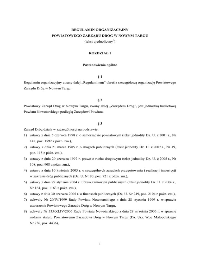 REGULAMIN ORGANIZACYJNY POWIATOWEGO ZARZĄDU DRÓG W NOWYM TARGU (tekst ujednolicony*) ROZDZIAŁ I Postanowienia ogólne §1 Regulamin organizacyjny zwany dalej „Regulaminem” określa szczegółową organizację Powiatowego Zarządu Dróg w Nowym Targu. §2 Powiatowy Zarząd Dróg w Nowym Targu, zwany dalej „Zarządem Dróg”, jest jednostką budżetową Powiatu Nowotarskiego podległą Zarządowi Powiatu. §3 Zarząd Dróg działa w szczególności na podstawie: 1) ustawy z dnia 5 czerwca 1998 r. o samorządzie powiatowym (tekst jednolity Dz. U. z 2001 r., Nr 142, poz. 1592 z późn. zm.), 2) ustawy z dnia 21 marca 1985 r. o drogach publicznych (tekst jednolity Dz. U. z 2007 r., Nr 19, poz. 115 z późn. zm.), 3) ustawy z dnia 20 czerwca 1997 r. prawo o ruchu drogowym (tekst jednolity Dz. U. z 2005 r., Nr 108, poz. 908 z późn. zm.), 4) ustawy z dnia 10 kwietnia 2003 r. o szczególnych zasadach przygotowania i realizacji inwestycji w zakresie dróg publicznych (Dz. U. Nr 80, poz. 721 z późn. zm.), 5) ustawy z dnia 29 stycznia 2004 r. Prawo zamówień publicznych (tekst jednolity Dz. U. z 2006 r., Nr 164, poz. 1163 z późn. zm.), 6) ustawy z dnia 30 czerwca 2005 r. o finansach publicznych (Dz. U. Nr 249, poz. 2104 z późn. zm.), 7) uchwały Nr 20/IV/1999 Rady Powiatu Nowotarskiego z dnia 28 stycznia 1999 r. w sprawie utworzenia Powiatowego Zarządu Dróg w Nowym Targu, 8) uchwały Nr 335/XLIV/2006 Rady Powiatu Nowotarskiego z dnia 28 września 2006 r. w sprawie nadania statutu Powiatowemu Zarządowi Dróg w Nowym Targu (Dz. Urz. Woj. Małopolskiego Nr 736, poz. 4436), 1 9) uchwały Nr 131/XIX/2004 Rady Powiatu Nowotarskiego z dnia 29 czerwca 2004 r. w sprawie ustalenia wysokości stawek opłat za zajęcie pasa drogowego dróg powiatowych, 10) Regulaminu. §4 Siedzibą Zarządu Dróg jest Miasto Nowy Targ. §5 Zasięg działania Zarządu Dróg obejmuje drogi na obszarze Powiatu Nowotarskiego według wykazu dróg stanowiącego z a ł ą c z n i k nr 1 do niniejszego Regulaminu. ROZDZIAŁ II Przedmiot i zakres działania §6 Przedmiotem działalności Zarządu Dróg jest wykonywanie obowiązków: 1) Zarządcy Drogi tj. Zarządu Powiatu Nowotarskiego, 2) Organu zarządzającego ruchem na drogach powiatowych i gminnych tj. Starosty Nowotarskiego, 3) Starosty Nowotarskiego w zakresie wydawania decyzji o ustaleniu lokalizacji drogi w odniesieniu do dróg powiatowych i gminnych, w rozumieniu ustawy z dnia 10 kwietnia 2003 r. o szczególnych zasadach przygotowania i realizacji inwestycji w zakresie dróg publicznych. §7 Zarząd Dróg wykonuje swoje obowiązki w zakresie przewidzianym w szczególności w: 1) przepisach o których mowa w § 3 Regulaminu, 2) ustawie z dnia 6 września 2001 r. o transporcie drogowym (tekst jednolity Dz. U. z 2004 r. Nr 2004, poz. 2088 z późn. zm.), 3) ustawie z dnia 7 lipca 1994 r. Prawo budowlane (tekst jednolity Dz. U. z 2006 r. Nr 156, poz. 1118 z późn. zm.), 4) rozporządzeniu Ministra Infrastruktury z dnia 23 września 2003 r. w sprawie szczegółowych warunków zarządzania ruchem na drogach oraz wykonywania nadzoru nad tym zarządzaniem (Dz. U. Nr 177, poz. 1729), 5) rozporządzeniu Rady Ministrów z dnia 1 czerwca 2004 r. w sprawie określenia warunków udzielania zezwoleń na zajęcie pasa drogowego (Dz. U. Nr 140, poz. 1481), 2 6) rozporządzeniu Ministra Transportu i Gospodarki Morskiej z dnia 2 marca 1999 r. w sprawie warunków technicznych, jakim powinny odpowiadać drogi publiczne i ich usytuowanie (Dz. U. Nr 43, poz. 430), 7) rozporządzeniu Ministra Transportu i Gospodarki Morskiej z dnia 30 maja 2000 r. w sprawie warunków technicznych, jakim powinny odpowiadać drogowe obiekty inżynierskie i ich usytuowanie (Dz. U. Nr 63, poz. 735), 8) rozporządzeniu Ministra Transportu i Gospodarki Morskiej z dnia 26 lutego 1996 r. w sprawie warunków technicznych, jakim powinny odpowiadać skrzyżowania linii kolejowych z drogami publicznymi i ich usytuowanie (Dz. U. Nr 33, poz. 144 z późn. zm.), 9) rozporządzeniu Ministra Infrastruktury z dnia 16 lutego 2005 r. w sprawie trybu sporządzania informacji oraz gromadzenia i udostępniania danych o sieci dróg publicznych, obiektach mostowych, tunelach oraz promach (Dz. U. Nr 67, poz. 583), 10) rozporządzeniu Ministra Infrastruktury z dnia 16 lutego 2005 r. w sprawie sposobu numeracji i ewidencji dróg publicznych, obiektów mostowych, tuneli, przepustów i promów oraz rejestru numerów nadanych drogom, obiektom mostowym i tunelom (Dz. U. Nr 67, poz. 582), 11) rozporządzeniu Ministra Spraw Wewnętrznych i Administracji z dnia 30 grudnia 2002 r. w sprawie kontroli ruchu drogowego (Dz. U. z 2003 r., Nr 14, poz. 144 z późn. zm.), 12) innych przepisach szczególnych. §8 Do zadań Zarządu Dróg należy w szczególności: 1. W zakresie planowania, budowy, przebudowy, remontu, utrzymania i ochrony dróg, tj. w zakresie kompetencji zarządcy drogi: 1) opracowywanie projektów planów rozwoju sieci drogowej oraz bieżące informowanie o tych planach organów właściwych do sporządzania miejscowych planów zagospodarowania przestrzennego, 2) opracowywanie projektów planów finansowania budowy, przebudowy, remontu, utrzymania i ochrony dróg oraz drogowych obiektów inżynierskich, 3) pełnienie funkcji inwestora w procesach budowlanym na drogach, o których mowa w § 5 Regulaminu, w tym składanie oświadczeń o posiadanym prawie do dysponowania nieruchomościami w pasie drogowym na cele budowlane, 4) utrzymanie nawierzchni drogi, chodników, drogowych obiektów inżynierskich, urządzeń zabezpieczających ruch i innych urządzeń związanych z drogą, 5) realizacja zadań w zakresie inżynierii ruchu, 6) przygotowywanie infrastruktury drogowej dla potrzeb obronnych oraz wykonywanie innych zadań na rzecz obronności kraju, 7) koordynacja robót w pasie drogowym, 3 8) wydawanie zezwoleń na zajęcie pasa drogowego, i zjazdy z dróg oraz pobieranie opłat i kar pieniężnych, 9) prowadzenie ewide