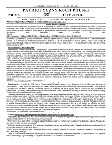 „PATRIOTYCZNY RUCH POLSKI” NR 215, 15 KWIECIEŃ 2009 R. 1 PATRIOTYCZNY RUCH POLSKI NR 215 15 IV 2009 R . ----------------------------------------------------------------------------------------------------------------------------------------------------------------- NOWY JORK, CHICAGO, TORONTO, BERLIN, WARSZAWA. P ATRIOTYCZNY R UCH P OLSKI W INTERNECIE : www.wicipolskie.org Drodzy Czytelnicy i Sympatycy! W naszym biuletynie zamieszczamy teksty różnych autorów, tak „z pierwszej ręki” jak i przedruki, traktujące o najistotniejszych problemach Polski i Świata. Kluczem doboru publikowanych treści, nie jest zgodność poglądów Autorów publikacji z poglądami redakcji lecz decyduje imperatyw ważnością tematu. Poglądy prezentowane przez Autorów tekstów, nie zawsze podzielamy. Uznając jednak że wszelka wymiana poglądów i wiedzy, jest pożyteczna dla życia publicznego - prezentujemy nawet kontrowersyjne opinie, pozostawiając naszym czytelnikom ich osąd. Redakcja Adres kontaktowy Redakcji PRP: PO Box 1602, Cranford NJ 07016 i internetowy: [email protected] W numerze: 1) Wiadomości; 2) Sobór Watykański II - rewolucja kopernikańska w Kościele; 3) Brednie sponsorowane; 4) To nie Bractwo stanowi problem - II; 5) Pod okupacją zbrodniarzy dokonywane są zbrodnie; 6) Czy leci z nami pilot?; 7) Drenaż kapitału z Polski, to nic nowego; 8) Nikczemność; 9) Raport większości; 10) Przechodzenie międzynarodowej lichwy w rząd światowy - I; 11) Czy Madoff kradł dla dobra Izraela?; 12) Religia holocaustu - XIV; Głupota owszem – ale nie wyłącznie Premier Donald Tusk jest szefem jednego z konstytucyjnych organów władzy wykonawczej, której zadaniem jest wykonywanie ustaw. Tymczasem premier Donald Tusk wydał zaskakujące oświadczenie, że za swoje zadanie uważa ochronę kultu Lecha Wałęsy. Lech Wałęsa być może ma swoich wyznawców, zarówno permanentnych, jak i koniunkturalnych, ale kult jego osoby w żadnym wypadku nie jest i nie może być uznany za religię państwową, już choćby z uwagi na konstytucyjny rozdział wszystkich wyznań od państwa. Poza tym, o ile wiadomo, Lech Wałęsa nie jest nawet santo subito - chyba żeby razwiedka z jakichś powodów postanowiła go w ten sposób awansować. Tego rodzaju deklaracji, ze strony premiera Tuska, nie można kłaść na karb głupoty, a w każdym razie - nie wyłącznie. Premier Tusk bowiem zagroził represjami wobec Instytutu Pamięci Narodowej, chociaż instytucja ta - co ponad wszelką wątpliwość wyjaśnił prezes Kurtyka - nie miała nic wspólnego z książką Pawła Zyzaka, która przez Lecha Wałęsę oraz jego wyznawców została uznana za bluźnierczą. Już mniejsza o te oskarżenia wobec książki, miotane przez osoby, które zawsze znajdują słowa usprawiedliwienia wobec publikacji rażąco obrażających chrześcijańskie uczucia religijne, bo ważniejsze są pogróżki pod adresem IPN, w których basują premierowi Tuskowi zarówno szubrawe kreatury z jego partii, jak i z Sojuszu Lewicy Demokratycznej. W przypadku SLD sprawa jest jasna; partia ta zawsze była polityczną ekspozyturą komunistycznych tajnych służb, w których żywotnym interesie leży likwidacja IPN. Natomiast premier Tusk, ciułający sobie każdy okruszek popularności na przyszłoroczne wybory prezydenckie, pogróżkami wobec IPN najwyraźniej próbuje zaskarbić sobie przychylność zarówno razwiedki, jak i wpływowego i ekumenicznego zakonu Ojców Konfidencjałów. Ciekawe, czy w ich imieniu odezwie się publicznie jakiś „Filozof”, czy obietnica rewanżowego poparcia zostanie udzielona dyskretnie. --------------------------------------------------------------------------------------------------------------------------------------------------------------------------------------------------------------------------------------------------------------------------------------------------------------------------------------------------------------------------------------------------------------------------------------------------------------------------------------------------------------------------------------------------------------------------------------------------------------------------------------------------------------------------------------------------------------------------------- St. Michalkiewicz, www.michalkiewicz.pl („Dziennik Polski” 2009-04-01 # # # Zagadkowe lęki - W „Dzienniku 1954” Leopold Tyrmand zapisał historyjkę o słynnym locie z Warszawy do, bodajże Szczecina. Kiedy samolot wystartowawszy z Okęcia, nabrał wysokości przelotowej, z kabiny pilotów wyszedł do pasażerów ZMP-owiec w czerwonym krawacie i rzekł: obywatele - gratuluję wam! Ten samolot reakcyjni inżynierowie przeznaczyli do kasacji, ale nasza brygada ZMP w czynie społecznym postanowiła go wyremontować i oto, lecimy! Wśród pasażerów wybuchł nieopisany lament, kobiety zaczęły mdleć, a obecny na pokładzie wysoki dygnitarz partyjny, zawołał: dość tych błazeństw! Natychmiast lądować! Ta historia jest znakomitą ilustracją tzw podwójnego myślenia, które było powszechne zarówno wtedy, jak i teraz. Ulegają mu ludzie skrępowani strachem. Ludzie, którzy się nie boją, ludzie naprawdę wolni, mówią to, co myślą. Biorąc pod uwagę to kryterium, niewątpliwie wolnym krajem, który nie boi się niczego, jest Izrael. Świadczy o tym nominacja Awigdora Liebermana na stanowisko ministra spraw zagranicznych. Ten urodzony w Kiszyniowie polityk, głosi hasło „Izrael dla Żydów” i wszystkich Palestyńczyków w najlepszym razie powyrzucałby za granicę. Warto też przypomnieć, że oficjalną ideologią polityczną Izraela jest syjonizm, a więc żydowska wersja nacjonalizmu, który w innych krajach, np. w Polsce, jest bardzo krytykowany m.in. przez środowiska żydowskie. Nie bardzo wiadomo dlaczego, bo nacjonalizm jest poglądem, według którego każda wspólnota etniczna powinna 