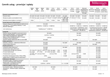 Cennik usług – prowizje i opłaty Konto 360° Otwarcie i prowadzenie konta1) Otwarcie konta Miesięczna opłata za prowadzenie konta Minimalna kwota środków na rachunku 28) Konto 360° Student Konto 360° Junior Dobre Konto Konto Osobiste Premium Konto Osobiste bez opłat bez opłat bez opłat bez opłat bez opłat bez opłat Konto Walutowe bez opłat 05)/1 GBP/1 EUR 0 /8 PLN bez opłat bez opłat 0 /7 PLN 0 /15 PLN 0 /7,99 PLN /2 CHF/2 USD 1 GBP/1 EUR/ 8 PLN 7 PLN 15 PLN 7 PLN 2 CHF/2 USD 2) 3) 4) 4) Konto Osobiste Prestige Konto Rachunek Konto Konto Konto Osobiste oszczędnościowo- Bankowości Bankowości Bankowości rozliczeniowy w Prywatnej Prywatnej w Prestige Prywatnej walucie obcej JR (Junior) walucie obcej Junior (Prestige) bez opłat bez opłat 6) 7) 0 /70 PLN 0 /7 PLN - - bez opłat bez opłat bez opłat bez opłat bez opłat bez opłat bez opłat bez opłat - - - - 8) Kanały Bankowości Elektronicznej Dostęp do obsługi przez Kanały Bankowości Elektronicznej Limit główny9)/ Limit Aplikacji Mobilnej10)/ Limit Millenetu Mobilnego10) bez opłat bez opłat bez opłat 50 000 PLN / 10 000 PLN / 10 000 PLN 50 000 PLN / 10 000 PLN / 10 000 PLN 50 000 PLN / 10 000 PLN / 10 000 PLN TeleMillennium11): 30 000 PLN Linia Prestige11): 200 000 PLN, numer dedykowany do obsługi telefonicznej w placówce12): 200 000 PLN Linia Bankowości Prywatnej11): 200 000 PLN, numer dedykowany do obsługi telefonicznej w placówce12): 200 000 PLN bez opłat bez opłat bez opłat 0,25 PLN / 0,30 PLN bez opłat bez opłat 2,99 PLN - - Limit telefoniczny: Usługi SMS Wysłanie jednego H@słaSMS do autoryzacji zleceń Wysłanie jednego MilleSMS’a na krajowy/zagraniczny numer telefonu (powiadomienia i zapytania)13) Opłata za Pakiet MilleSMS (20 smsów w miesiącu na krajowe numery telefonów)14) Wysłanie jednego doładowania SMS na numer 8058 Wpłaty gotówkowe Gotówką w placówce / wpłatomacie Millennium Czekiem Banku Millennium Wypłaty gotówkowe W placówce Banku Millennium15) W bankomatach Banku Millennium W bankomatach BZ WBK oraz Cash4You W innych bankomatach W bankomatach za granicą W punktach akceptujących kartę w Polsce (POS) Wypłata dewiz w walucie innej niż waluta konta15) Podstawowe informacje Sprawdzenie salda /10 ostatnich transakcji na ekranie bankomatu Banku Millennium Wydruk salda / 10 ostatnich transakcji w bankomacie Banku Millennium Polecenie zapłaty (usługa dla strony dłużnika) Uruchomienie usługi / Realizacja przelewu Aktualizacja / Odwołanie zgody, pojedynczego przelewu Obowiązuje od dnia 31.05.2014 bez opłat - bez opłat 0,10 PLN bez opłat - bez opłat bez opłat 02)/1 PLN 016)/1 PLN 016)/1 PLN 03)/1 PLN bez opłat 1 PLN 02)/ 5 PLN 016)/ 5 PLN 03)/ 5 PLN bez opłat 5 PLN 02)/2,5% 016)/ 2,5% min 9 PLN 2,5% min 9 PLN min 9 PLN 6 PLN 10 PLN bez opłat 0,2 EUR 1,5 EUR 2 EUR 1,5 EUR bez opłat 0,50 PLN / 1,50 PLN 0,1 / 0,5 EUR bez opłat - bez opłat bez opłat bez opłat - bez opłat bez opłat bez bez bez bez opłat opłat opłat opłat 2,5% min 9 PLN bez bez bez bez 2 EUR - opłat opłat opłat opłat bez opłat bez opłat bez opłat bez opłat bez opłat bez opłat bez opłat bez opłat bez opłat bez opłat - bez opłat - bez opłat - bez opłat - 3 PLN - 3 PLN - bez opłat - bez opłat - strona 1 / 5 Konto 360° Zlecenia stałe / Płatności na rachunki zdefiniowane17) Zdefiniowanie / modyfikacja Realizacja na rachunek w Banku Millennium Realizacja na rachunek w innym banku Przelewy Przelew jednorazowy wewnętrzny: - pomiędzy rachunkami tego samego Posiadacza w ramach bankowości detalicznej Banku Millennium - pozostałe przelewy wewnętrzne: - w placówce Banku Millennium - przez Millenet/Aplikację Mobilną/Aplikację na tablet/Millenet Mobilny/telefon/MilleSMS Przelew na doładowanie telefonu komórkowego przez Millenet/Aplikację Mobilną/Aplikację na tablet/ Millenet Mobilny/MilleSMS/bankomat Przelew krajowy w PLN: - w placówce Banku Millennium - przez Millenet/Aplikację Mobilną/Aplikację na tablet/Millenet Mobilny - przez TeleMillennium: IVR / Konsultant - przez MilleSMS - natychmiastowy przez Millenet/Aplikację Mobilną /Aplikację na tablet18) - na email/telefon przez Millenet/Aplikację Mobilną/Aplikację na tablet19) Przelewy zagraniczne (w walutach obcych i w złotych wysyłanych do banków zagranicznych oraz w walutach obcych wysyłanych do banków krajowych)20): - przelew w trybie standardowym - przelew w trybie pilnym/ekspres (dodatkowo) - opłata dodatkowa, gdy wszystkie koszty przelewu pokrywa Zleceniodawca - przelew SEPA w EUR w Millenet / placówce Wystawienie potwierdzenia dokonania przelewu Konto 360° Student Konto 360° Junior Dobre Konto Konto Osobiste Premium Konto Osobiste Konto Walutowe Konto Osobiste Prestige Konto Rachunek Osobiste oszczędnościow o-rozliczeniowy Prestige w walucie obcej Junior (Prestige) bez opłat bez opłat Konto Konto Konto Bankowości Bankowości Bankowości Prywatnej Prywatnej w Prywatnej JR (Junior) walucie obcej bez opłat bez opłat bez opłat bez opłat bez opłat bez opłat bez opłat bez opłat bez opłat 5 PLN bez opłat bez opłat bez opłat bez opłat bez opłat bez opłat bez opłat bez opłat 7,99 PLN bez opłat bez opłat bez opłat bez opłat bez opłat 0,50 PLN bez opłat 0,10 EUR 0,50 PLN 0,50 PLN / 2 PLN bez opłat bez opłat 0,50 PLN / 2 PLN - 5 PLN bez opłat 0,50 PLN bez opłat bez opłat - bez opłat bez opłat - - 5 PLN - bez opłat - - bez opłat - bez opłat - 0,5% min 20 PLN max 125 PLN 25 PLN / 50 PLN 0,5% min 20 PLN max 125 PLN 25 PLN / 50 PLN bez opłat bez opłat 60 PLN 60 PLN bez opłat 5 PLN / 10 PLN21) 3 PLN 5 PLN / 10 PLN21) bez opłat bez opłat bez opłat 28) Wyciągi / zestawienia (bez opłat dla Posiadaczy rachunków Prestige oraz Bankowości Prywatnej) Konto Lokacyjne Wyciąg miesięczny w formie elektronicznej bez opłat Wyciąg miesięczny w formie papierowej: - dla Klientów korzystających z Millenet (w przypadku rachunków Konto 360°, 5 PLN Konto 360° 