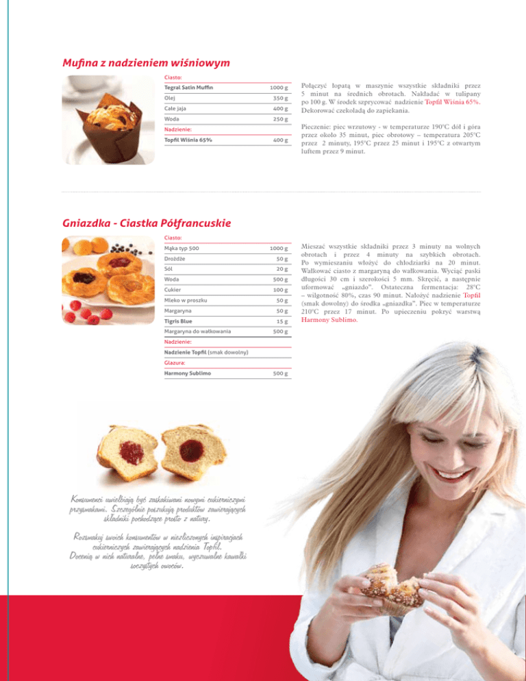 Mufina z nadzieniem wiśniowym Ciasto: Tegral Satin Muffin Olej Całe jaja Woda 1000 g 350 g 400 g 250 g Nadzienie: Topfil Wiśnia 65% Połączyć łopatą w maszynie wszystkie składniki przez 5 minut na średnich obrotach. Nakładać w tulipany po 100 g. W środek szprycować nadzienie Topfil Wiśnia 65%. Dekorować czekoladą do zapiekania. 400 g Pieczenie: piec wrzutowy - w temperaturze 190°C dół i góra przez około 35 minut, piec obrotowy – temperatura 205°C przez 2 minuty, 195°C przez 25 minut i 195°C z otwartym luftem przez 9 minut. Gniazdka - Ciastka Półfrancuskie Ciasto: Mąka typ 500 Drożdże 1000 g 50 g Sól 20 g Woda 500 g Cukier 100 g Mleko w proszku 50 g Margaryna 50 g Tigris Blue 15 g Margaryna do wałkowania 500 g Nadzienie: Nadzienie Topfil (smak dowolny) Glazura: Harmony Sublimo Konsumenci uwielbiają być zaskakiwani nowymi cukierniczymi przysmakami. Szczególnie poszukują produktów zawierających składniki pochodzące prosto z natury. Rozsmakuj swoich konsumentów w niezliczonych inspiracjach cukierniczych zawierających nadzienia Topfil. Docenią w nich naturalne, pełne smaku, wyczuwalne kawałki soczystych owoców. 500 g Mieszać wszystkie składniki przez 3 minuty na wolnych obrotach i przez 4 minuty na szybkich obrotach. Po wymieszaniu włożyć do chłodziarki na 20 minut. Wałkować ciasto z margaryną do wałkowania. Wyciąć paski długości 30 cm i szerokości 5 mm. Skręcić, a następnie uformować „gniazdo”. Ostateczna fermentacja: 28°C – wilgotność 80%, czas 90 minut. Nałożyć nadzienie Topfil (smak dowolny) do środka „gniazdka”. Piec w temperaturze 210°C przez 17 minut. Po upieczeniu pokryć warstwą Harmony Sublimo. Topfil – różnorodność smaków! Pomarańczowe Czerwone Wiśnie 65% Wiśnie 80% Żurawina 60% Malina 60% Malina 20% Truskawka 60% Morele 60% Brzoskwinie 54% Zielone Kiwi 35% Czarne Czarne porzeczki 60% Specyfikacja techniczna: • Opakowania: wiadra 14 kg • Termin przydatności: 6 miesięcy w nieotwartym opakowaniu 9 miesięcy dla nadzień z 20% zawartością owoców 5°C - 25°C • Przechowywanie: www.puratos.pl Dział Sprzedaży: region Wschód - tel. 61 657 63 67, region Północ - tel. 61 657 63 66, region Południe - tel. 61 657 63 92 Puratos Polska Sp. z o.o. - ul. Żniwna 2, 62-025 Kostrzyn Tel.: +48 61 657 63 63 - Fax: +48 61 657 90 70 Topfil Poczuj smak świeżych owoców Dlaczego nadzienia Topfil są takie unikalne ? Nadzienia Topfil są pełne owoców zawierają ich nawet do 90%. APLIKACJE CECHY Głęboki, naturalny smak, apetyczny wygląd i zawartość całych kawałków owoców - to cechy wyróżniające nadzienia Topfil. Różnorodność smaków, szerokie możliwości zastosowania oraz łatwość użycia nadzień Topfil docenią nawet najbardziej wymagający profesjonaliści. Gotowe do użycia Stabilne podczas zapieku Odporne na zamrażanie Szerokie możliwość zastosowania nadzień: - aplikacje świeże i mrożone; - aplikacje z ciasta francuskiego (zamknięte i otwarte); - ciasta deserowe, muffiny, desery; - ciasta drożdżowe, brioszki, drożdżówki; - ciasta z blachy, wyroby typu crumble; „Owoce leśne mają orzeźwiający, przyjemnie kwaskowy smak. Niektóre zaskakują nas wytrawnością, inne zaś delikatną nutką słodyczy. Nadzienia Topfil nodadzą charakteru tradycyjnym wyrobom cukierniczym i podkreślą ich smak”. Juris, Puratos Fruit Expert Topfil – to takie łatwe ! Mon Cherry receptura na formę średnicy 16 cm Ciasto: Tegral Satin Creme Cake Całe jaja Olej Woda 500 g 175 g 150 g 100 g Wymieszać wszystkie składniki z wyjątkiem Vivafil Cherry 1870 przez 5 minut na średnich obrotach. Wałkować do odpowiedniej grubości i umieścić w formie, wysmarować cienką warstwą Vivafil Cherry 1870. Zapiekać w temperaturze 180°C. Vivafil Cherry 1870 Ciemny mus: Kremówka Mleko Żółtka Cukier Belcolade Noir Kremówka + Montamix 50 g 50 g 125 g Połączyć żółtka, mleko i kremówkę. Wlewać powoli do roztopionej czekolady Belcolade Noir. Przy temperaturze 35°C dodać ubitą śmietanę Montamix z kremówką. 20 g 235 g 225 g + 225g Nadzienie owocowe: Nałożyć nadzienie Topfil Wiśnia 80% do formy o średnicy 16 cm i zamrozić. Topfil Wiśnia 80% Wykończenie: wyłożyć mus do okrągłej formy. Przełożyć warstwą zamrożonego wcześniej nadzienia Topfil Wiśnia 80% i wykończyć warstwą musu. Całość włożyć do zamrażarki. Dekorować żelem Magnifier. Mus Marakuja Ciasto: Tegral Satin Creme Cake Całe jaja Olej Woda 500 g 175 g 150 g Połączyć wszystkie składniki i miksować przez 5 minut na średnich obrotach. Rozprowadzić cienką warstwę na blaszce, piec w temperaturze 180°C około 10-12 minut. 112 g Mus marakuja: Kremówka 125 g Mleko 125 g Żółtka Belcolade White 60 g 350 g Żelatyna 15 g Woda do żelatyny 70 g Połączyć żółtka, mleko i kremówkę. Dodać żelatynę i pastę Classic Marakuja. Wlewać powoli do roztopionej czekolady do uzyskania ganażu. Przy temperaturze 40°C dodać ubitą śmietanę Montamix z kremówką. Wlać do foremki, zakończyć upieczonym uprzednio ciastem. Zamrozić. Kremówka 500 g Montamix 500 g Pasta Classic Marakuja 70 g Polewa biało - zielona: Belcolade White Selection 250 g Masło kakaowe 250 g Połączyć czekoladę Belcolade White Selection, masło kakaowe i barwniki. Barwnik biały i zielony Wykończenie: kiedy mus jest już zamrożony spryskać go dwiema warstwami polewy, wykończyć paskiem z Topfil Żurawina 60%. Truskawkowe Cremble receptura na formę średnicy 18 cm Ciasto półkruche: Tegral Babka Mąka pszenna Margaryna Całe jaja 500 g 500 g Mieszać wszystkie składniki do uzyskania jednolitej masy. Wałkować do odpowiedniej grubości i umieścić w formie. 425 g 100 g Nadzienie: Topfil Truskawka 60% 200 g Tegral Satin Creme Cake - receptura: Olej 150 g Całe jaja 175 g Woda 110 g Nałożyć 200 g Topfil Truskawka 60% na wyłożone do formy, niewypieczone ciasto. Miksować wszystkie składnik