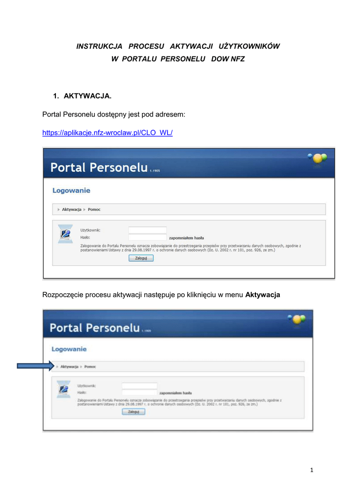 INSTRUKCJA PROCESU AKTYWACJI UŻYTKOWNIKÓW W PORTALU PERSONELU DOW NFZ 1. AKTYWACJA. Portal Personelu dostępny jest pod adresem: https://aplikacje.nfz-wroclaw.pl/CLO_WL/ Rozpoczęcie procesu aktywacji następuje po kliknięciu w menu Aktywacja 1 Po wybraniu menu Aktywacja, użytkownik zostaje przekierowany do formatki aktywacyjnej. Jest to pierwsza część dwustopniowej rejestracji, na tym etapie następuje weryfikacja danych podanych przez użytkownika z danymi zawartymi w systemie DOW NFZ. Przypominamy, że rejestracja powiedzie się tylko i wyłącznie w przypadku, gdy lekarz posiada zawartą z DOW NFZ ważną umowę upoważniającą do wystawiania recept refundowanych. W polu Zawód należy poprzez kliknięcie na symbol lupy wybrać ze słownika wykonywaną specjalizację (w przypadku, gdy jest ich kilka, należy wybrać jedną), w przypadku braku specjalizacji należy w linii wyszukiwania wpisać słowo lekarz i wybrać kategorie LEKARZE (grupa zawodowa) o kodzie 2231 oraz w rubryce kod specjalizacji wybrać opcje brak specjalizacji – działanie to dezaktywuje rubrykę – data uzyskania specjalizacji. 2 W przypadku posiadania specjalizacji należy określić jej stopień w polu kod specjalizacji, a następnie uzupełnić rubrykę: Data uzyskania specjalizacji. Wybór daty ułatwi kalendarz dostępny po naciśnięciu ikony W polu Prawo wykonywania zawodu należy podać siedmiocyfrowy numer uprawnienia, a następnie w kolejnej rubryce organ wydający, wybrać ze słownika właściwy organ wydający prawo wykonywania zawodu. Wejście do słownika oznaczone jest ikonką 3 W polu Numer umowy upoważniającej należy wpisać 9 cyfrowy kod nadany przez NFZ na wystawianie recept refundowanych zaczynający się od cyfr 9801_ _ _ _ _. W kolejnych polach należy wpisywać wymagane dane kontaktowe. Szczególnie ważne jest podanie poprawnego adresu poczty elektronicznej email, ponieważ na ten adres zostanie przesłany email pozwalający na dokończenie procesu rejestracji. Wpisywane hasła muszą mieć co najmniej 8 znaków (w tym: małe i duże litery oraz cyfry). Po zakończeniu wypełniania rubryki należy wydrukować, wypełnić i podpisać umowę na korzystanie z Portalu Narodowego Funduszu Zdrowia oraz zapoznać się z treścią regulaminu. Naciśnięcie na pogrubione pole Regulamin umożliwi jego otwarcie, zapisanie lub wydrukowanie. 4 Akceptacja regulaminu odbywa się poprzez zaznaczenie kwadracika (checkboxu) w punkcie 5 i jest elementem niezbędnym do zakończenia pierwszego etapu rejestracji. Ostatnim krokiem pierwszego etapu rejestracji jest poprawne przepisanie tekstu widocznego na obrazku i przejście do góry dokumentu gdzie znajduje się przycisk Zatwierdź. Po naciśnięciu przycisku Zatwierdź, system dokona weryfikacji podanych danych, następnie pojawi się informacja o treści: Na podany adres mailowy został wysłany mail z linkiem pozwalającym na potwierdzenie wniosku. Po wyświetleniu takiego komunikatu automatycznie generowana jest wiadomość na wskazany wcześniej adres email użytkownika, potwierdzająca rejestrację do Portalu NFZ. W treści wiadomości znajduje się link do potwierdzenia wniosku. Ważne! Użytkownik ma 7 dni na potwierdzenie wskazanego w wiadomości linka, po tym czasie wniosek jest automatycznie usuwany. 5 Po kliknięciu na załączony w treści wiadomości link (w przypadku gdyby link się nie otwierał prosimy o przekopiowanie jego treści do paska adresu wyszukiwarki internetowej), nastąpi przekierowanie do witryny DOW NFZ. Użytkownik znajdzie tutaj pełną treść formularza aktywacyjnego, uzupełnioną o dane, które wprowadził w pierwszej fazie rejestracji. Ze względów bezpieczeństwa i konieczności weryfikacji, wymaganym jest po wydrukowaniu formularza dopisanie odręcznie – adresu zamieszkania oraz obywatelstwa. Po zapoznaniu się z treścią i zaakceptowaniu warunków określonych w formularzu aktywacyjnym należy nacisnąć przycisk Zatwierdź i Drukuj. Wydrukowany, podpisany i opieczętowany formularz (wraz z dwoma egzemplarzami podpisanej umowy na korzystanie z Portalu Narodowego Funduszu Zdrowia) należy przesłać do Wydziału Gospodarki Lekami DOW NFZ na adres: 50-525 Wrocław, ul. Joannitów 6 Po otrzymaniu formularza aktywacyjnego przez DOW NFZ (oraz 2 egzemplarzy umowy na korzystanie z Portalu NFZ) i jego pozytywnej weryfikacji użytkownik otrzyma na wskazany w formularzu aktywacyjnym adres email potwierdzenie rozpatrzenia wniosku. Po kliknięciu na załączony w treści wiadomości link (w przypadku gdyby link się nie otwierał prosimy o przekopiowanie jego treści do paska adresu wyszukiwarki internetowej) można się już logować do portalu personelu DOW NFZ. Przypominamy, że loginem w Portalu Personelu jest numer PESEL, hasłem – hasło wpisane przez użytkownika w formularzu aktywacyjnym. Ze względów bezpieczeństwa Pierwsze zalogowanie do portalu wymusza zmianę tego hasła! 6