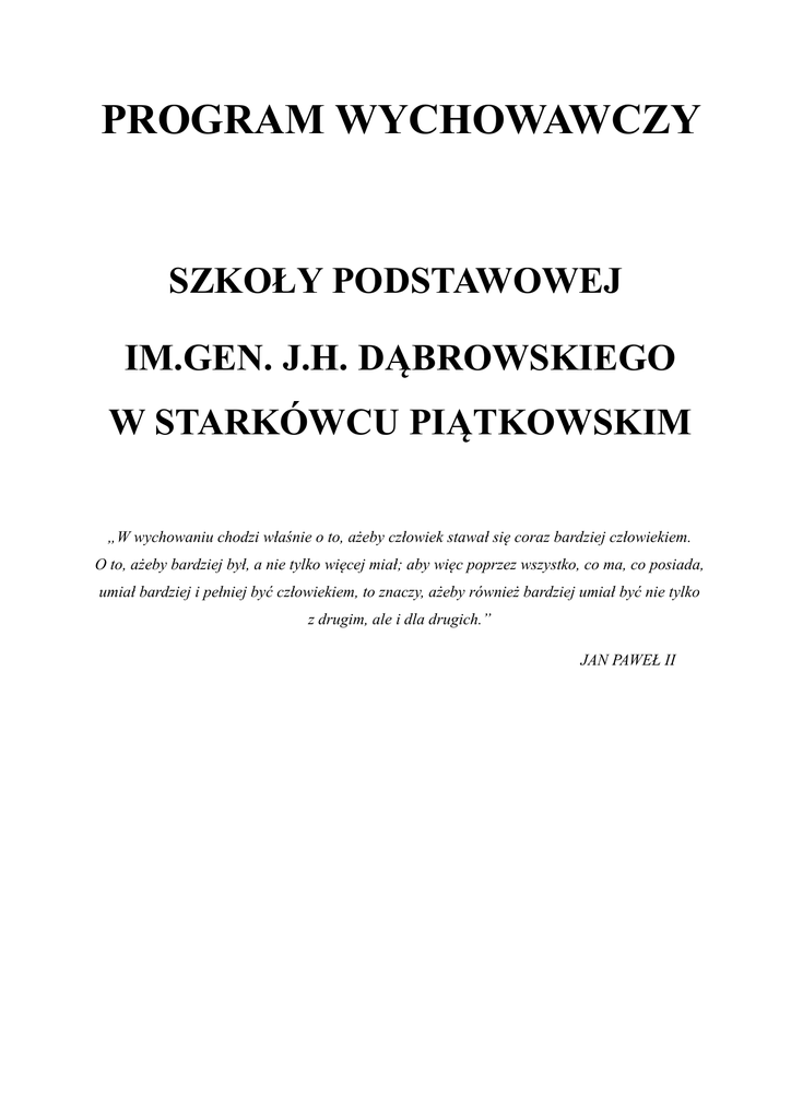 PROGRAM WYCHOWAWCZY SZKOŁY PODSTAWOWEJ IM.GEN. J.H. DĄBROWSKIEGO W STARKÓWCU PIĄTKOWSKIM „W wychowaniu chodzi właśnie o to, ażeby człowiek stawał się coraz bardziej człowiekiem. O to, ażeby bardziej był, a nie tylko więcej miał; aby więc poprzez wszystko, co ma, co posiada, umiał bardziej i pełniej być człowiekiem, to znaczy, ażeby również bardziej umiał być nie tylko z drugim, ale i dla drugich.” JAN PAWEŁ II Podstawą prawną programu wychowawczego są następujące dokumenty: 1. Konstytucja Rzeczpospolitej Polskiej uchwalona przez Zgromadzenie Narodowe 2 kwietnia 1997r. 2. Powszechna Deklaracja Praw Człowieka. 3. Konwencja o prawach dziecka, uchwalona przez Zgromadzenie Ogólne Narodów Zjednoczonych 29 listopada 1989 r., ratyfikowana przez Polskę 30 kwietnia 1991 r.- art. 3, 19, 28, 33 4. Ustawa o Systemie Oświaty. 5. Karta Nauczyciela. 6. Rozporządzenie Ministra Edukacji Narodowej z dnia 23 grudnia 2008 r. w sprawie podstawy programowej wychowania przedszkolnego oraz kształcenia ogólnego w poszczególnych typach szkół. 7. Statut Szkoły. Program Wychowawczy Szkoły został opracowany po wcześniejszym rozpoznaniu potrzeb uczniów, oczekiwań rodziców oraz nauczycieli. Został on oparty na misji i wizji szkoły. Misja szkoły: Nasza szkoła jest placówką, której celem jest stworzenie takich warunków, aby każdy uczeń czuł się dobrze, miał możliwość rozwoju swojej osobowości uzdolnień, miał poczucie bezpieczeństwa, a szkoła cieszyła się zaufaniem dzieci i rodziców oraz, żeby była postrzegana i ceniona w środowisku lokalnym. Wizja szkoły: Chcemy być szkołą przyjazną, zapewniającą dobrą atmosferę do harmonijnego rozwoju osobowości i uzdolnień naszych uczniów, którym zaoferujemy atrakcyjne zajęcia lekcyjne i pozalekcyjne. Dzięki temu będą oni mogli zdobywać wiedze i umiejętności, umożliwiające im potencjalny sukces w dalszej edukacji i życiu. Dążąc do pełnego rozwoju naszych uczniów, ze szczególną troską chcemy pochylać się nad problemem wyrównywania szans oraz pragniemy stworzyć jak najlepsze warunki do zdobywania sukcesów edukacyjnych i sportowych. Absolwenta naszej szkoły cechuje: samodzielność, zarówno w domu, jak i w szkole uczciwość – mówi prawdę, szanuje cudzą własność, dotrzymuje słowa odpowiedzialność jest gotów ponosić konsekwencje swoich czynów, jeżeli trzeba zwraca się o pomoc do osób z najbliższego otoczenia; działając w grupie poczuwa się do odpowiedzialności za efekty jej pracy, postępuje zgodnie z zasadami bezpieczeństwa i higieny ciekawość – chęć zdobywa wiedzę i umiejętności korzystając z różnych źródeł tolerancyjność – rozumie różnice między ludźmi, w każdym stara się dostrzec coś dobrego szacunek – jest zawsze grzeczny w stosunku do innych osób, nie stosuje przemocy, nie wyśmiewa się ze słabszych obowiązkowość i punktualność – dotrzymuje terminów, przestrzega statutu i regulaminów szkoły. Cele ogólne: 1. Wspomaganie wszechstronnego i harmonijnego rozwoju ucznia. 2. Przygotowanie ucznia do funkcjonowania w grupie szkolnej i efektywnego w niej działania. 3. Umacnianie wiary dziecka we własne siły i zdolności osiągania wartościowych i trudnych celów. 4. Przygotowanie do życia w ustawicznie zmieniającym się w świecie. 5. Rozbudzenie i rozwijanie wrażliwości estetycznej i moralnej dziecka oraz jego indywidualnych zdolności twórczych. Główne cele wychowawcze szkoły: 1. Kształtowanie motywacji do zdobywania wiedzy . 2. Kształtowanie postaw świadomego i aktywnego uczestnictwa w życiu społecznym (w rodzinie, w szkole, w społeczności lokalnej) ze szczególnym uwzględnieniem współudziału w rozwoju najbliższej okolicy. 3. Motywowanie uczniów do przyjmowania odpowiedzialności za swoje zachowanie nie tylko w szkole, ale i poza szkołą. 4. Promowanie zdrowego stylu życia, rozwijanie różnorodnych zainteresowań oraz zachęcanie uczniów do popularyzowania takiego stylu życia w swoim najbliższym otoczeniu. 5. Budowanie szacunku do symboli narodowych, historii i dziedzictwa kulturowego Polski. Do najważniejszych umiejętności zdobywanych przez ucznia w trakcie kształcenia: myślenie matematyczne, czytanie, myślenie naukowe, umiejętność komunikowania się w języku ojczystym i w języku obcym, zarówno w mowie, jak i w piśmie, umiejętność posługiwania się nowoczesnymi technologiami informacyjno – komunikacyjnymi, w tym także dla wyszukiwania i korzystania z informacji, umiejętność uczenia się jako sposób zaspokajania naturalnej ciekawości świata, odkrywania swoich zainteresowań i przygotowania do dalszej edukacji, umiejętność pracy zespołowej. ZADANIA WYCHOWAWCZE SZKOŁY Cel wychowania 1. Organizacja zespołu klasowego 2. Poznawanie i przestrzeganie norm dobrego zachowania w środowisku szkolnym i rodzinnym. 3. Kształcenie umiejętności zachowania się w sytuacjach trudnych. 4. Poznawanie i wyrażanie własnych uczuć i emocji. 5. Przekazywanie wiedzy na temat troski o własne zdrowie i bezpieczeństwo 6. Opracowanie obowiązujących w klasie, w szkole i poza szkołą norm oraz reguł zachowania. 7. Uczenie nawyków dobrego zachowania i porozumiewania się z ludźmi. 8. Organizowanie sytuacji sprzyjających podnoszeniu wiary we własne możliwości. Sposoby realizacji wybór samorządu klasowego, zabawy integrujące zespół klasowy, organizowanie imprez szkolnych i klasowych (ślubowanie klas pierwszych, zabawa andrzejkowa, Mikołajki, Wigilia, Bal Karnawałowy, Powitanie Wiosny) i uroczystości klasowych oraz wycieczek turystyczno - krajoznawczych po najbliższej okolicy. podejmowanie tematyki na zajęciach integracyjnych poprzez opowiadania, scenki rodzajowe, dramę, rozmowę, prezentacja symboli narodowych i godnego zachowania się wobec nich; nauka Hymnu Państwowego, postawy i szacunku wobec Hymnu, Flagi i Godła Państwowego, zapoznanie uczniów 