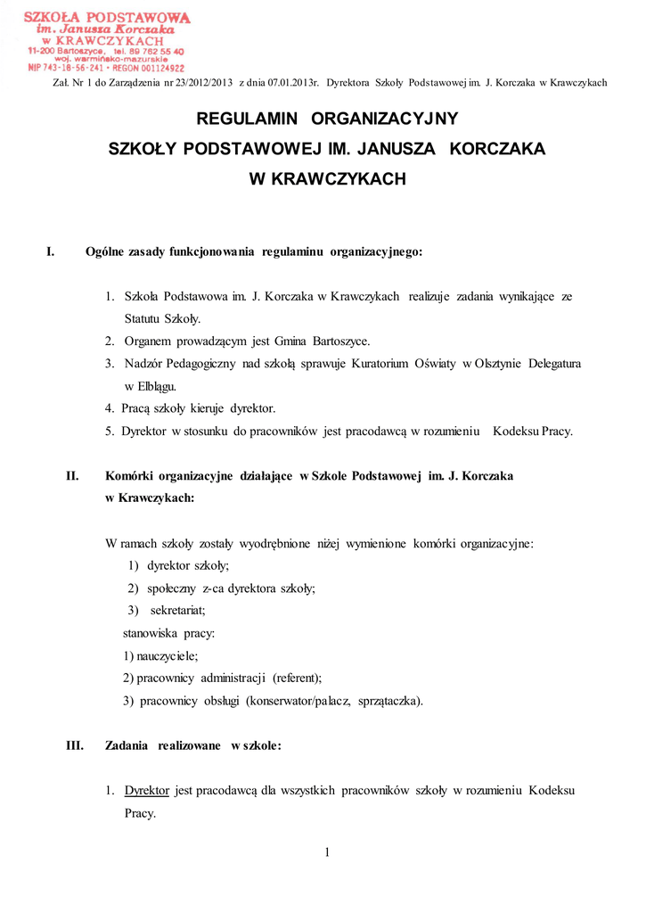 Zał. Nr 1 do Zarządzenia nr 23/2012/2013 z dnia 07.01.2013r. Dyrektora Szkoły Podstawowej im. J. Korczaka w Krawczykach REGULAMIN ORGANIZACYJNY SZKOŁY PODSTAWOWEJ IM. JANUSZA KORCZAKA W KRAWCZYKACH Ogólne zasady funkcjonowania regulaminu organizacyjnego: I. 1. Szkoła Podstawowa im. J. Korczaka w Krawczykach realizuje zadania wynikające ze Statutu Szkoły. 2. Organem prowadzącym jest Gmina Bartoszyce. 3. Nadzór Pedagogiczny nad szkołą sprawuje Kuratorium Oświaty w Olsztynie Delegatura w Elblągu. 4. Pracą szkoły kieruje dyrektor. 5. Dyrektor w stosunku do pracowników jest pracodawcą w rozumieniu Kodeksu Pracy. II. Komórki organizacyjne działające w Szkole Podstawowej im. J. Korczaka w Krawczykach: W ramach szkoły zostały wyodrębnione niżej wymienione komórki organizacyjne: 1) dyrektor szkoły; 2) społeczny z-ca dyrektora szkoły; 3) sekretariat; stanowiska pracy: 1) nauczyciele; 2) pracownicy administracji (referent); 3) pracownicy obsługi (konserwator/palacz, sprzątaczka). III. Zadania realizowane w szkole: 1. Dyrektor jest pracodawcą dla wszystkich pracowników szkoły w rozumieniu Kodeksu Pracy. 1 2. Dyrektor szkoły w zakresie działalności organizacyjnej w szkole poprzez swoich pracowników realizuje następujące zadania: 1) organizuje i realizuje całokształt prac zgodnie z założeniami Statutu; 2) egzekwuje od pracowników szkoły realizację przydzielonych czynności organizacyjnych, dydaktycznych, wychowawczych i innych związanych z działalnością statutową szkoły; 3) ustala regulaminy pracy szkoły; 4) opracowuje projekt arkusza organizacyjnego szkoły; 5) ustala zakresy czynności dla pracowników nie będących nauczycielami; 6) kieruje całokształtem planowania dydaktyczno-wychowawczej i opiekuńczej pracy szkoły; 7) organizuje i przygotowuje posiedzenia rady pedagogicznej; 8) zapewnia warunki bezpieczeństwa uczniów i pracowników na terenie szkoły, jak również w czasie zajęć organizowanych przez szkołę poza terenem szkoły; 9) kształtuje właściwą atmosferę i dyscyplinę pracy. 3. Dyrektor szkoły w zakresie spraw kadrowych: 1) kieruje całokształtem polityki kadrowej w szkole; 2) zatrudnia pracowników i rozwiązuje stosunek pracy zgodnie z przepisami; 3) udziela urlopów płatnych i bezpłatnych pracownikom. 4. Społeczny zastępca dyrektora w zakresie działalności organizacyjnej, dydaktyczno – wychowawczej i opiekuńczej w przypadku nieobecności dyrektora: 1) zastępuje dyrektora;; 2) uczestniczy w naradach organizowanych przez organ nadzorujący lub prowadzący szkołę; 3) układa zastępstwa za nieobecnych nauczycieli; 4) jest obecny przy kontrolach przeprowadzanych przez jednostki z zewnątrz: Sanepid, Straż Pożarna, itp. 5) kontroluje pracę nauczycieli i innych pracowników szkoły; 6) zawiadamia odpowiednie służby o zaistniałych awariach. 2 5. Zadania nauczyciela: 1) nauczanie i wychowanie powierzonych jego opiece uczniów; 2) realizacja w toku zajęć dydaktycznych obowiązujących programów nauczania; 3) stosowanie właściwych metod nauczania; 4) opieka nad powierzonymi mu organizacjami na terenie szkoły; 5) opieka nad uczniami w organizowanych przez szkołę imprezach, wyjazdach i wycieczkach; 6) udział w posiedzeniach rady pedagogicznej, zespołów przedmiotowych i innych; 7) udział w konferencjach i kursach organizowanych przez ośrodki metodyczne i władze szkolne; 8) odpowiedzialność za pomoce dydaktyczne i sprzęt powierzony jego opiece; 9) czuwanie nad frekwencją uczniów; 10) systematyczne i sumienne prowadzenie dokumentacji pedagogicznej. Szczegółowy zakres obowiązków, odpowiedzialności i uprawnień nauczyciela Szkoły Podstawowej Janusza Korczaka w Krawczykach zapisany jest w Statucie szkoły, którego nauczyciel jest zobowiązany przestrzegać. 6. Zadania nauczyciela bibliotekarza: 1) z biblioteki mogą korzystać uczniowie, nauczyciele i inni pracownicy szkoły; 2) udostępnianie zbiorów bibliotecznych; 3) poradnictwo w wyborach czytelniczych; 4) zakup, gromadzenie, ewidencja zbiorów; 5) organizacja udostępniania zbiorów; 6) komputeryzacja biblioteki; 7) wykonywanie innych zadań zleconych przez dyrektora szkoły. IV. Pracownicy administracji i obsługi. Pracownicy zatrudnieni w Szkole Podstawowej im. Janusza Korczaka w Krawczykach na umowę o pracę są pracownikami samorządowymi i podlegają regulacjom ustawy o pracownikach samorządowych. 1. Do podstawowych obowiązków pracownika samorządowego należy w szczególności: 1) przestrzeganie Konstytucji Rzeczypospolitej Polskiej i innych przepisów prawa; 2) wykonywanie zadań sumiennie, sprawnie i bezstronnie; 3 3) udzielanie informacji organom, instytucjom i osobom fizycznym oraz udostępnianie dokumentów znajdujących się w posiadaniu jednostki, w której pracownik jest zatrudniony, jeżeli prawo tego nie zabrania; 4) dochowanie tajemnicy ustawowo chronionej; 5) zachowanie uprzejmości i życzliwości w kontaktach z obywatelami, zwierzchnikami, podwładnymi oraz współpracownikami; 6) zachowanie się z godnością w miejscu pracy i poza nim; 7) stałe podnoszenie umiejętności i kwalifikacji zawodowych; 8) sumienne i staranne wykonywanie poleceń przełożonego; 9) złożenie oświadczenia przez pracowników na stanowiskach urzędniczych o prowadzeniu działalności gospodarczej, zgodnie z wymogami ustawy. 2. Do zadań referenta szkoły należy: 1) prowadzenie na bieżąco dokumentacji szkoły: a) księgi uczniów i księgi ewidencji dzieci wg roczników; b) nadzorowanie wypełniania obowiązku szkolnego przez dzieci zamieszkałe w obwodzie szkoły; c) wysyłanie i przyjmowanie korespondencji; d) prowadzenie książki korespondencyjnej; e) prowadzenie dokumentacji związanej z ruchem uczniów i powszechnością nauczania; f) wykonywanie sprawozdań GUS i sprawozdawczości szkolnej; g) nadzorowanie prawidłowego prowadzenia dokumentacji przez nauczycieli prawidłowego wykorzystania druków szkolnych; 2) prowadzenie