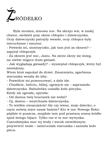 Ź RÓDEŁKO Była mroźna, zimowa noc. Na skraju wsi, w małej chatce, siedzieli przy oknie chłopiec i dziewczynka. Oczy dziewczynki patrzyły wesoło, oczy chłopca były nieruchome i smutne. - Powiedz mi, siostrzyczko, jak tam jest za oknem? – zapytał chłopczyk. - Za oknem jest noc, Jasiu. Na ziemi skrzy się śnieg, na niebie migoce dużo gwiazd. - Jak wyglądają gwiazdy? – wyszeptał chłopczyk, który był niewidomy. Wtem ktoś zapukał do drzwi. Zmarznięta, zgarbiona staruszka weszła do izby. - Pozwólcie mi przenocować, z dala idę. - Chodźcie, babciu, bliżej, ogrzejcie się – zapraszała dziewczynka. Babuleńka usiadła koło piecyka. Kiedy się ogrzała, spytała: - Od dawna twój braciszek nie widzi? - Oj, dawno – westchnęła dziewczynka. - To wielkie nieszczęście! Ale czy wiesz, moje dziecko, o czym mówią stare nasze baśnie? Kto w noc Nowego Roku pójdzie w puszczę, znajdzie tam pod prastarą sosną źródło spod śniegu bijące. Tylko raz w tę noc wytryska. Czarodziejska moc tej wody i wzrok niewidomym przywrócić może – zamruczała staruszka i zasnęła koło pieca. Dziewczynka tej nocy nie mogła zasnąć. Jutro Nowy Rok – myślała. Choć bardzo to straszno iść w nocy do puszczy, ale może baśń prawdę mówi? Może Jaś ujrzałby wtedy gwiazdy i śnieg i cały piękny świat? Cichutko wstała z łóżka, włożyła ciepły kożuszek, chustę i rękawice i wymknęła się z domu. Wrócę, zanim rodzice przyjadą do domu od chorej cioci – pomyślała. Śnieg skrzypiał pod nogami, mróz szczypał w policzki, ale dziewczynka nie zważała na nic. Szła w stronę puszczy. Na brzegu lasu rósł duży krzak głogu. - On pewnie coś wie o najstarszej sośnie w puszczy? Ale krzak nie chciał jej powiedzieć. - Powiem ci, lecz oddaj mi swoje czerwone korale. Dziewczynka bez wahania zdjęła z szyi swoje ulubione korale i zawiesiła na gałązce. - Jeśli chcesz trafić pod prastarą sosnę, usiądź przy mnie. Dzisiejszej nocy będą szły tędy do źródła zwierzęta. Pójdziesz ich śladem i trafisz na pewno. Usiadła dziewczynka i czeka. Otuliła się szczelniej kożuszkiem, cieplej jej się zrobiło i usnęła. Tymczasem koło krzaczka pokicał kulawy zajączek. Szedł do źródła uleczyć chorą nóżkę, ale dziewczynka spała i nie widziała zajączka. Za zajączkiem szła wrona ze złamanym skrzydłem i wyrwanym ogonem, lecz dziewczynka spała. Za wroną przemknął chyłkiem bury wilk z oberwaną skórą na grzbiecie, a dziewczynka wciąż spała. Szedł też obok drogi siwy mróz. Zdziwił się, że taka mała dziewczynka śpi spokojnie na śniegu. Rozgniewało go to bardzo. - Zamrożę ją! – zawołał i zaczął dmuchać jej prosto w twarz. - Nie rusz jej – szeptała zielona choinka, rosnąca obok krzaka głogu. Ona szuka drogi do źródła pod prastarą sosną, aby przynieść wody dla małego, niewidomego brata. - Wstań, dziewczynko, zbudź się! – I dobra choinka dotknęła oszronioną gałązką czoła śpiącej. Dziewczynka zerwała się przerażona. Zamiast chorych zwierzątek, ujrzała groźną twarz siwego mroza. - Gdzie mieszkasz? – zapytał mróz. - Tu niedaleko, w chacie na skraju wsi – wyszeptała ze strachem. Czy chore zwierzęta już tędy szły? - Zwierzęta poszły, kiedy smacznie spałaś. - Co ja teraz pocznę? – dziewczynka załamała rączki. - Pomóż jej, siwy mrozie – zaszemrała zielona choinka. Patrz, jaka ona zmartwiona. - Pomóż jej – powiedział krzak głogu. - Pomóż jej – szumiały drzewa. Wówczas mróz skinął dłonią. Przed zdumioną dziewczynką zjawiła się dziwna postać w rozwianym płaszczu. Był to wiatr. - Ach, to ty, dziewczynko, co umiesz tak pięknie śpiewać! Nieraz siedzę koło komina i słucham twoich piosenek. Jeśli mnie nauczysz tej o koziołku i babuleńce, pomogę ci. Dziewczynka kiwnęła głową, a wiatr pochwycił ją za rękę i dużymi krokami popędził między drzewa, ledwo dziewczynka mogła za nim nadążyć. Stara bajka mówi, że dziewczynka znalazła sosnę i źródełko. Nabrała wody i zaniosła braciszkowi. Gdy chłopczyk przemył oczka, zobaczył piękny świat, śmiał się i cieszył, rzucał kulami ze śniegu, a wiosną biegał po łąkach i gonił motyle, jak wszystkie dzieci. Byli bardzo szczęśliwi. A w zimowe wieczory siadali koło komina i śpiewali piękne, mazurskie piosenki, a najczęściej tę o koziołku, właśnie tę, której chciał się nauczyć zimowy wiatr.