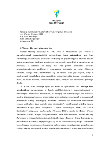 Jaskinia zapomnianych snów (Cave of Forgotten Dreams) reż. Werner Herzog, 2010 zdj. Peter Zeitlinger muz. Ernst Reijeseger technologia 3D 1. Werner Herzog i kino autorskie Werner Herzog, urodzony w 1942 roku w Monachium, jest jednym z najważniejszych przedstawicieli europejskiego kina autorskiego. Idea kina autorskiego, wykształcona pierwotnie we Francji lat pięćdziesiątych, zakłada, że kino jest równorzędnym środkiem artystycznej wypowiedzi autorskiej w stosunku np. do powieści, a zarazem, że lepiej niż ona potrafi przekazać aktualne (dwudziestowieczne) problemy i współczesne spojrzenie na świat. Głównym autorem, którego wizja uzewnętrznia się za sprawą kina, jest reżyser, który w modelowych przykładach kina autorskiego często jest także twórcą scenariusza, a bywa, że także aktorem, (współ)autorem zdjęć, muzyki czy narratorem gotowego dzieła. W historii kina Herzoga łączy się także ze zjawiskiem tzw. nowego kina niemieckiego, powstającego w latach sześćdziesiątych i siedemdziesiątych w ówczesnych Niemczech Zachodnich, w opozycji do dominującego tam wówczas modelu kina rozrywkowego, konserwatywnego, unikającego palących współczesnych problemów. Grupę debiutującą wcześniej (fenomen ich twórczości analizowano czasem oddzielnie, jako „młode kino niemieckie”) współtworzyli między innymi Aleksander Kluge (autor Pożegnania z dniem wczorajszym, 1966) czy Volker Schlöndorff (Niepokoje wychowanka Törlessa, 1966), młodsi to Rainer Werner Fassbinder, Ulrike Ottinger, Margarethe von Trotta, Wim Wenders i Werner Herzog. Zwłaszcza w twórczości tej ostatniej dwójki krytycy i historycy filmu doszukują się podobieństw: wskazują na pojawiające się w ich filmach motywy drogi i wędrówki, kłopotliwego, niemieckiego dziedzictwa kulturowego, romantycznego poszukiwania siebie i własnej tożsamości, a także wątki międzynarodowe – filmy obu autorów dość 1 wcześnie zaczęły powstawać poza granicami Niemiec. Werner Herzog zarówno swoimi filmami, jak i biografią (w której pojawiają się takie wątki, jak oddalone od jakiejkolwiek cywilizacji dzieciństwo w bawarskiej wsi czy wyprawa na piechotę do Paryża, celem odwiedzenia chorej historyczki filmu, Lotte Eisner) współtworzy własny mit romantycznego artysty-outsidera, wiecznego wędrowca, który za pomocą swojej bezkompromisowej sztuki i życia próbuje odpowiedzieć na nurtujące go pytania. Herzog jest autorem znaczących filmów fabularnych: Aguirre, gniew boży (1972), Nosferatu-wampir (1979), Woyzeck (1979), Fitzcarraldo (1982) czy Cobra Verde (1987). W wymienionych utworach główną rolę grał charyzmatyczny aktor Klaus Kinski, znany z wybuchowego temperamentu i ekstremalnych zachowań. Kinski, oskarżony przez własną córkę o molestowanie seksualne (autobiografia Poli Kinski ukazała się dopiero w roku 2013, ponad dwadzieścia lat po śmierci aktora), był postacią kontrowersyjną, jednak jego współpraca z Herzogiem doprowadziła do powstania dzieł ekscentryków, zdobywających światowe uznanie; portretów szaleńców i rzucających wyzwanie światu całemu i często tragicznie przegrywających. Współpracę z Kinskim Herzog upamiętnił w filmie dokumentalnym Mój ukochany wróg (1999). Werner Herzog współpracował również z niemieckim aktorem-naturszczykiem, Brunem S., który do filmu przyszedł – jako kloszard – wprost z ulicy. Bruno S. zagrał główne role w filmach Herzoga Zagadka Kaspara Hausera (1974) oraz Stroszek (1976), pokazujących losy jednostek nieprzystosowanych do życia zgodnie ze społecznymi konwencjami. Ponadto Herzog jest jeszcze autorem między innymi takich utworów, jak Nawet karły były kiedyś małe (1970), Szklane serce (1976), Tam, gdzie śnią zielone mrówki (1984) czy Krzyk kamienia (1991). Jego bardzo różnorodna twórczość powraca często do pytań o najbardziej pierwotne i szalone składniki ludzkiej duszy, o relacje człowieka i natury, o spotkania i sytuacje ekstremalne. 2. Jaskinia zapomnianych snów – autorski dokument Jednak od samego początku swojej twórczości Werner Herzog jest również autorem filmów dokumentalnych. Reżyser m.in. Wielkiej ekstazy snycerza Steinera (1974), Rekolekcji na temat mroku (1991), Otchłani. Opowieści o życiu i śmierci (2011) czy Spotkań na krańcach świata (2007) wyznaje jednak szczególną teorię dokumentu. Film jest jego zdaniem prawdziwy nie wtedy, gdy jego reżyser – zgodnie z ideą cinéma vérité – stara się powstrzymać od jakiejkolwiek interwencji czy 2 komentarza, zdając się na obiektywizm rejestrującej wydarzenia, neutralnej kamery, lecz wówczas, gdy filtruje obraz świata przez własną wrażliwość, temperament i koncepcję autorską. Herzog nie waha się przed prowadzeniem pierwszoosobowej narracji zza kadru, inscenizowaniem poszczególnych scen czy przed własną oceną obserwowanych zjawisk. Właśnie jaskinia, wypełniona tajemniczymi prehistorycznymi malowidłami, jest doskonałym przykładem środowiska rozpiętego między zewnętrznością a światem wewnętrznym. Jaskinię Chauveta odkryto w latach 90. ubiegłego stulecia, w regionie Ardeche, w południowej części doliny Rodanu. W środku znaleziono naskalne obrazy sprzed ok. 32 tysięcy lat - a więc najstarsze z dotychczas znanych. W swoim filmie Herzog, wraz z niewielką ekipą, wkracza do zazwyczaj zamkniętych dla osób z zewnątrz jaskiń i filmuje swoje - współczesnego człowieka - spotkanie z prehistorycznymi malunkami. Przygląda się okolicy i rozmawia z badaczami paleolitu na temat znaczenia odnalezionych malowideł i przedmiotów sprzed dziesiątek tysięcy lat, oraz sposobu, w jaki żyli ludzie w okresie ich powstania. Jak zwykle niemiecki reżyser podchodzi do swojego zadania ogromnie serio, ilustrując obrazy z jaskini podniosłą muzyką i dając nam poczucie obcowania z tajemnicą i świętością; i także jak zwykle puentuje wiele konstatacji h