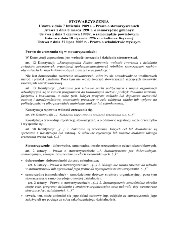 STOWARZYSZENIA Ustawa z dnia 7 kwietnia 1989 r. - Prawo o stowarzyszeniach Ustawa z dnia 8 marca 1990 r. o samorządzie gminnym Ustawa z dnia 5 czerwca 1998 r. o samorządzie powiatowym Ustawa z dnia 18 stycznia 1996 r. o kulturze fizycznej Ustawa z dnia 27 lipca 2005 r. - Prawo o szkolnictwie wyższym Prawo do zrzeszania się w stowarzyszeniach: W Konstytucji zapewniona jest wolność tworzenia i działania stowarzyszeń. art. 12 Konstytucji: „Rzeczpospolita Polska zapewnia wolność tworzenia i działania związków zawodowych, organizacji społeczno-zawodowych rolników, stowarzyszeń, ruchów obywatelskich, innych dobrowolnych zrzeszeń oraz fundacji.” Nie jest dopuszczalne tworzenie stowarzyszeń, które by się odwoływały do totalitarnych metod i praktyk działania. Poza tym nie wolno tworzyć stowarzyszeń szerzących nienawiść rasową lub narodowościową. art. 13 Konstytucji: „Zakazane jest istnienie partii politycznych i innych organizacji odwołujących się w swoich programach do totalitarnych metod i praktyk działania nazizmu, faszyzmu i komunizmu, a także tych, których program zakłada lub dopuszcza nienawiść rasową i narodowościową, stosowanie przemocy w celu zdobycia władzy lub wpływu na politykę państwa albo przewiduje utajnienie struktur lub członkowswta.” Konstytucja zapewnia wolność zrzeszania się. art. 58 Konstytucji: „1. Każdemu zapewnia się wolność zrzeszania się. (...)” Konstytucja przewiduje rejestrację stowarzyszeń, a o odmowie rejestracji może orzec tylko i wyłącznie sąd. art. 58 Konstytucji: „(...) 2. Zakazane są zrzeszenia, których cel lub działalność są sprzeczne z Konstytucja lub ustawą. O odmowie rejestracji lub zakazie działania takiego zrzeszenia orzeka sąd. (...)” Stowarzyszenie - dobrowolne, samorządne, trwałe zrzeszeniem o celach niezarobkowych. art. 2 ustawy - Prawo o stowarzyszeniach: „1. Stowarzyszenie jest dobrowolnym, samorządnym, trwałym zrzeszeniem o celach niezarobkowych. (..)” dobrowolne - dobrowolność dotyczy członkostwa; art. 6 ustawy - Prawo o stowarzyszeniach: „(...) 2. Nikogo nie wolno zmuszać do udziału w stowarzyszeniu lub ograniczać jego prawa do wystąpienia ze stowarzyszenia. (...)” samorządne (samodzielne) - samodzielność dotyczy struktury organizacyjnej, poza tym stowarzyszenie samo decyduje o swojej działalności; art. 2 ustawy - Prawo o stowarzyszeniach: „(...) 2. Stowarzyszenie samodzielnie określa swoje cele, programy działania i struktury organizacyjne oraz uchwala akty wewnętrzne dotyczące jego działalności. (...)” trwałe, tzn. może zmieniać się jego skład osobowy (np. odejście ze stowarzyszenia jego założycieli nie pociąga za sobą zakończenia jego działalności). Stowarzyszenie opiera swoją działalność na pracy społecznej swoich członków. art. 2 ustawy - Prawo o stowarzyszeniach: „(...) 3. Stowarzyszenie opiera swoją działalność na pracy społecznej członków; do prowadzenia swych spraw może zatrudnia pracowników.” Ograniczenia prawa do zrzeszania się w stowarzyszeniach mogą wynikać ze względu na wartości, takie jak ochrona bezpieczeństwa i porządku publicznego, ochrona moralności publicznej albo ochrona praw i wolności innych osób. art. 1 ustawy - Prawo o stowarzyszeniach: „(...) 2. Prawo zrzeszania się w stowarzyszeniach może podlegać ograniczeniom przewidzianym jedynie przez ustawy, niezbędnym do zapewnienia interesów bezpieczeństwa państwowego lub porządku publicznego oraz ochrony zdrowia lub moralności publicznej albo ochrony praw i wolności innych osób.” Stowarzyszenia mogą tworzyć obywatele polscy posiadający pełną zdolność do czynności prawnych, co do zasady którzy ukończyli 18 lat, przy czym założyć stowarzyszenia nie ma prawa osoba pozbawiona praw publicznych. art. 3 ustawy - Prawo o stowarzyszeniach: „1. Prawo tworzenia stowarzyszeń przysługuje obywatelom polskim mającym pełną zdolność do czynności prawnych i nie pozbawionym praw publicznych. (...)” Osoby poniżej 18 lat mogą być tylko członkami stowarzyszenia. Małoletni poniżej 16 lat mogą być członkami stowarzyszenia za zgodą opiekunów, ale w ogóle nie mają prawa głosowania w jakichkolwiek sprawach, chyba że są to stowarzyszenia małoletnich, natomiast małoletni od 16 do 18 lat mają prawo być członkami, ale bez prawa wyboru do organów stowarzyszenia. art. 3 ustawy - Prawo o stowarzyszeniach: „(...) 2. Małoletni w wieku od 16 do 18 lat, którzy mają ograniczoną zdolność do czynności prawnych, mogą należeć do stowarzyszeń i korzystać z czynnego i biernego prawa wyborczego, z tym że w składzie zarządu stowarzyszenia większość muszą stanowić osoby o pełnej zdolności do czynności prawnych. 3. Małoletni poniżej 16 lat mogą, za zgodą przedstawicieli ustawowych, należeć do stowarzyszeń według zasad określonych w ich statutach, bez prawa udziału w głosowaniu na walnych zebraniach członków oraz bez korzystania z czynnego i biernego prawa wyborczego do władz stowarzyszenia. Jeżeli jednak jednostka organizacyjna stowarzyszenia zrzesza wyłącznie małoletnich, mogą oni wybierać i być wybierani do władz tej jednostki.” Cudzoziemcy mogą się zrzeszać w stowarzyszeniach, jeżeli mają miejsce zamieszkania na terytorium Polski, ale cudzoziemcy nie mający zamieszkania w Polsce nie mogą, chyba że statut stowarzyszenia przewiduje taką możliwość. art. 4. ustawy - Prawo o stowarzyszeniach: „1. Cudzoziemcy mający miejsce zamieszkania na terytorium Rzeczypospolitej Polskiej mogą zrzeszać się w stowarzyszeniach, zgodnie z przepisami obowiązującymi obywateli polskich. 2. Cudzoziemcy nie mający miejsca zamieszkania na terytorium Rzeczypospolitej Polskiej mogą wstępować do stowarzyszeń, których statuty przewidują taką możliwość.” Osoby prawne nie mogą tworzyć stowarzyszeń, ale mogą być członkami wspierającymi. art. 10 usta