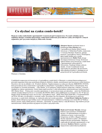 Boom na rynku condo-hoteli i apartamentów wczasowych pod wynajem trwa. Na rynek wchodzą i przez najbliższe miesiące wchodzić będą kolejne condo-hotele budowane przez liderów rynku, deweloperów z innych segmentów, jak i prywatne inicjatywy kilku osób z branży. Zdrojowa Invest uruchamia latem w Kołobrzegu Ultra-Marine przy 5-gwiazdkowym Marine Hotel, kończy inwestycje w Szklarskiej Porębie, rozpoczyna w Ustroniu Morskim i Kudowie, planuje postawić 5-gwiazdkowy hotel w Świnoujściu, gdzie kupiła działkę przy osiedlu apartamentowców Baltic Park od jego dewelopera Kristensen Group. Kristensen ogłosił właśnie nową inwestycję, condo-hotel z apartamentami wakacyjnymi w Dziwnówku. Finalizuje kolejne nabycia działek. Z kolei Condohotels Group wprowadza do sprzedaży dla inwestorów indywidualnych pokoje w działającym od ponad dwóch lat 4-gwiazdkowym hotelu Platinum w Ostródzie. Condohotels rozpoczyna też inwestycje w 4-gwiazdkowy condo-hotel w Olsztynie w centrum biurowousługowym i prowadzi negocjacje dotyczące pozyskania kolejnych obiektów, działek, nieruchomości pod inwestycje condo-hotelowe. Docelowo sieć ma się składać z ok. 30 takich obiektów. Najaktywniejsza na rynku jest obecnie ZDROJOWA INVEST, która prowadzi już dwa condo-hotele: 4-gwiazdkowy Sand Hotel i 5-gwiazdkowy Marine Hotel z 230 pokojami. Przy tym drugim we wrześniu uruchamia… Ultra Marine. To 42 pokojowy obiekt hotelowy połączony z Marine, w którym znajdują się większe apartamenty. Goście będą mogli korzystać z całej infrastruktury gastronomicznej, konferencyjnej i SPA Marine Hotel. – Praktycznie wszystkie apartamenty w tej inwestycji mamy już sprzedane – mówi Jan Wróblewski, członek zarządu Zdrojowej Invest w wywiadzie dla HOTELARZA, który publikujemy na stronach 22–24). W lipcu po drugiej stronie Kołobrzegu ruszyć ma też inny 5-gwiazdkowy hotel – Baltic Plaza Hotel Medi SPA z 78 apartamentami od 50 do 100 mkw. do sprzedaży w systemie condo. Deweloper Sea Development, dla którego jest to pierwsza inwestycja w condo-hotel, deklaruje, że większość pokoi już została sprzedana… Cristal Resort Szklarska Poręba to kolejny obiekt Zdrojowej typu holiday resort z 60 apartamentami z widokiem na Szrenicę oraz strefą SPA & Wellness (basen, jacuzzi, sauna, łaźnia parową i siłownia), „narciarnią” na sprzęt zimowy i salą dla biznesu. Jego budowa jest już zaawansowana i obiekt powinien się pojawić na rynku w przyszłym roku. Boulevard Ustronie Morskie, którego budowa rusza jesienią to 20 budynków łącznie z 54 apartamentami (wszystkie z widokiem na morze w pierwszej linii brzegowej), na klifie o długości 350 m z dwoma zejściami na plaże i 20 lokalami usługowymi przy promenadzie. Zdrojowa rozpoczęła już sprzedaż apartamentów w tej inwestycji. Kudowa Towers w górskiej miejscowości uzdrowiskowej Kudowie- Zdroju to kolejny kompleks hotelowy w systemie condo kołobrzeskiego holdingu. Obiekt ulokowany będzie bezpośrednio przy Stawie i Parku Zdrojowym, na osi głównej promenady uzdrowiska. Jedna z dwóch wież mieściła będzie hotel 4-, a druga 5-gwiazdkowy, w systemie condo. Łącznie w kompleksie znajdzie się 250 apartamentów od 25 do 100 mkw., dysponował będzie też infrastrukturą konferencyjną na ok. 800 osób oraz Centrum SPA & Wellness (z barem w basenie). Wyższa wieża będzie liczyła 55 m. Wartość tej inwestycji wynosi 120 mln zł. Budowa rozpocząć ma się w przyszłym roku. 5-gwiazdkowy condo-hotel w Świnoujściu. To najnowsza informacja ze Zdrojowej ogłoszona podczas panelu „Czy condo-hotele podbiją rynek?” prowadzonego przez redaktora naczelnego HOTELARZA Rafała Szubstarskiego na 3. Konferencji Inwestycji Hotelarskich w Europie Środkowej. Zdrojowa Invest kupiła działkę w Świnoujściu od Kristensen Group i chce postawić tam dwa hotele: 5- i 4-gwiazdkowy pod znanymi markami globalnymi na ponad 200 pokoi. KRISTENSEN GROUP jest liderem na rynku apartamentów wakacyjnych w Polsce. To pojęcie jest często mylone z condohotelami. Różnica jest taka, że w apartamentach wakacyjnych nie ma części hotelowych: gastronomii, pow. konferencyjnych, SPA, recepcji. Podobieństwo polega na tym, że właściciele apartamentów wakacyjnych mogą je również, tak jak właściciele pokoi w condohotelach, oddać pod wspólny wynajem i czerpać z tego zyski. Ale jak pokazuje praktyka, indywidualni inwestorzy kupują apartamenty wczasowe częściej dla własnych potrzeb, a inwestorzy hotelowi traktują to bardziej jako narzędzie inwestycyjne. Kristensen Group zrealizował już w Świnoujściu... Baltic Park – osiedle siedmiu apartamentów z ponad 200 jednostkami, w których ponad 90 proc. pokoi jest już sprzedanych. Właśnie na działce obok, którą Kristensen sprzedał Zdrojowej powstać ma zespół hotelowy, razem z apartamentowcami Baltic Parku tworzący największy nad polskim morzem kompleks apartamentowo-hotelowo-rekreacyjny. Inne inwestycje Kristensen to Apartamenty Bukowa Góra w Wiśle. Budynek z 44 apartamentami, a obok powstaje drugi z 78 apartamentami. Apartamenty pod Śnieżką w Karpaczu. Zespół drewnianych domków, w których znajdują się pod dwa apartamenty. Osada Zamkowa w Pasymiu na Mazurach. Zespół 22 domów bliźniaczych i szeregowych. Najnowszą inwestycją Kristensen Group jest Dziwnówek Park SPA. Deweloper kupił w Dziwnówku działkę o powierzchni blisko 2 tys. mkw., przy samej plaży. Powstanie na niej 4-kondygnacyjny budynek z 55 apartamentami od 42 do 73 mkw. i podziemnymi garażami. Planowana jest również budowa kameralnego condo-hotelu, składającego się maksymalnie z 20 pokoi oraz restauracji. Średnia cena za mkw. apartamentu w standardzie „pod klucz” wyniesie ok. 7,2 tys. zł, czyli mniej niż w innych tego typu inwestycjach, gdzie ceny oscylują wokół 10 tys. zł za metr. – Chcemy dać wybór osobom, które zastanawiają się nad nabyciem działki nad mo