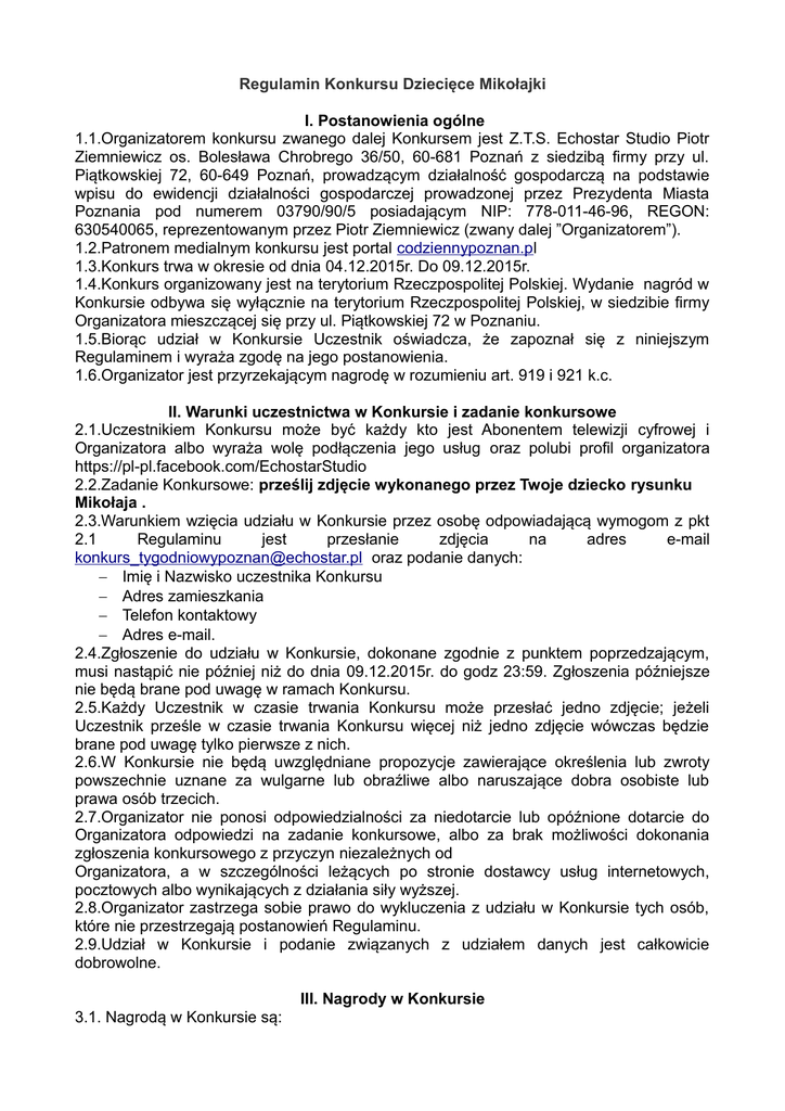 Regulamin Konkursu Dziecięce Mikołajki I. Postanowienia ogólne 1.1.Organizatorem konkursu zwanego dalej Konkursem jest Z.T.S. Echostar Studio Piotr Ziemniewicz os. Bolesława Chrobrego 36/50, 60-681 Poznań z siedzibą firmy przy ul. Piątkowskiej 72, 60-649 Poznań, prowadzącym działalność gospodarczą na podstawie wpisu do ewidencji działalności gospodarczej prowadzonej przez Prezydenta Miasta Poznania pod numerem 03790/90/5 posiadającym NIP: 778-011-46-96, REGON: 630540065, reprezentowanym przez Piotr Ziemniewicz (zwany dalej ”Organizatorem”). 1.2.Patronem medialnym konkursu jest portal codziennypoznan.pl 1.3.Konkurs trwa w okresie od dnia 04.12.2015r. Do 09.12.2015r. 1.4.Konkurs organizowany jest na terytorium Rzeczpospolitej Polskiej. Wydanie nagród w Konkursie odbywa się wyłącznie na terytorium Rzeczpospolitej Polskiej, w siedzibie firmy Organizatora mieszczącej się przy ul. Piątkowskiej 72 w Poznaniu. 1.5.Biorąc udział w Konkursie Uczestnik oświadcza, że zapoznał się z niniejszym Regulaminem i wyraża zgodę na jego postanowienia. 1.6.Organizator jest przyrzekającym nagrodę w rozumieniu art. 919 i 921 k.c. II. Warunki uczestnictwa w Konkursie i zadanie konkursowe 2.1.Uczestnikiem Konkursu może być każdy kto jest Abonentem telewizji cyfrowej i Organizatora albo wyraża wolę podłączenia jego usług oraz polubi profil organizatora https://pl-pl.facebook.com/EchostarStudio 2.2.Zadanie Konkursowe: prześlij zdjęcie wykonanego przez Twoje dziecko rysunku Mikołaja . 2.3.Warunkiem wzięcia udziału w Konkursie przez osobę odpowiadającą wymogom z pkt 2.1 Regulaminu jest przesłanie zdjęcia na adres e-mail [email protected] oraz podanie danych: Imię i Nazwisko uczestnika Konkursu Adres zamieszkania Telefon kontaktowy Adres e-mail. 2.4.Zgłoszenie do udziału w Konkursie, dokonane zgodnie z punktem poprzedzającym, musi nastąpić nie później niż do dnia 09.12.2015r. do godz 23:59. Zgłoszenia późniejsze nie będą brane pod uwagę w ramach Konkursu. 2.5.Każdy Uczestnik w czasie trwania Konkursu może przesłać jedno zdjęcie; jeżeli Uczestnik prześle w czasie trwania Konkursu więcej niż jedno zdjęcie wówczas będzie brane pod uwagę tylko pierwsze z nich. 2.6.W Konkursie nie będą uwzględniane propozycje zawierające określenia lub zwroty powszechnie uznane za wulgarne lub obraźliwe albo naruszające dobra osobiste lub prawa osób trzecich. 2.7.Organizator nie ponosi odpowiedzialności za niedotarcie lub opóźnione dotarcie do Organizatora odpowiedzi na zadanie konkursowe, albo za brak możliwości dokonania zgłoszenia konkursowego z przyczyn niezależnych od Organizatora, a w szczególności leżących po stronie dostawcy usług internetowych, pocztowych albo wynikających z działania siły wyższej. 2.8.Organizator zastrzega sobie prawo do wykluczenia z udziału w Konkursie tych osób, które nie przestrzegają postanowień Regulaminu. 2.9.Udział w Konkursie i podanie związanych z udziałem danych jest całkowicie dobrowolne. III. Nagrody w Konkursie 3.1. Nagrodą w Konkursie są: Ufundowane przez Cartoon Network i Boomerang 10 x mini puzzle Tom i Jerry 2 x karty piotruś CN Ben 10 10 x naklejki Monster Scooby-Doo 2 x zeszyt 60k CN ufundowane przez minimini+ 3 x duża pluszowa rybka minimini+ 2 x mała pluszowa rybka minimini+ 7 x plecak z rybka minimini+ (2 x niebieski, 2 x czerwony, 3 x pomarańczowy) ufundowane przez BBC Cbeebies 20x plastelina 6 kolorów 5x płyty DVD Ukryte Królestwa 5x płyty DVD Tajemnice Świata Przyrody 20x długopisy Dodatkowo ufundowane przez Echostar Studio 300 aktywacji na okres jednego miesiąca programów telewizyjnych o profilu bajkowym dostępnych w naszej sieci (programy: TVP ABC, Disney Channel, Duck TV, Duck TV HD, JimJam, Baby TV, BBC Cbeebies, Disney Junior, MiniMini+, TeleTOON+/Hyper+, Cartoon Network, Boomerang, Karusel, RTVi Detskii Mir). Aby odebrać aktywację, uczestnik konkursu musi być podłączony do sieci Echostar Studio. 3.2. Zdobywca nagrody w Konkursie nie może żądać wymiany nagrody na jej równowartość pieniężną ani na nagrodę innego rodzaju. 3.3. Uczestnicy Konkursu nie mogą przenieść prawa do uzyskania nagrody na osoby trzecie. IV. Zasady przyznawania i wydawania nagród w Konkursie 4.1. Wyłonienie finalistów Konkursu nastąpi dnia 11.12.2015r. i będzie polegało na wyborze 300 zwycięzców, którzy nadeślą najciekawsze zdjęcia zdaniem Komisji Konkursowej. Komisja Konkursowa w składzie: Anna Rzysko i Magdalena Łaniecka. 4.2. Lista zwycięzców Konkursu zostanie ogłoszona na Stronie internetowej partnera medialnego konkursu www.codziennypoznan.pl w dniu 11.12.2015r. do godz. 20:00. 4.3 Uczestnicy Konkursu wyrażają zgodę na opublikowanie ich danych osobowych, wizerunku oraz nadesłanych prac konkursowych na stronach www: http://www.codziennypoznan.pl/ http://www.echostar.pl/ https://www.facebook.com/EchostarStudio 4.4 Każdy ze zwycięzców nagrody w Konkursie zostanie powiadomiony o swojej wygranej telefonicznie lub za pomocą informacji e-mail, w terminie nie później niż 1 dzień roboczy od dnia wyłonienia zwycięzców Konkursu. Nagrody zostaną wydane zwycięzcom w siedzibie firmy Z.T.S. Echostar Studio mieszczącej się przy ul. Piątkowskiej 72 w Poznaniu (odbiór nagrody możliwy będzie w godzinach od 9:00 do 15:00 w dniach od 15.12.2015r. do 30.12.2015r. 4.5. Organizator nie ponosi odpowiedzialności za brak możliwości wydania Uczestnikowi nagrody z przyczyn leżących po stronie Uczestnika, a w szczególności z powodu nie odebrania telefonu lub wiadomości e-mailowej z informacją o wygranej przed terminem wydania nagrody. V. Postępowanie reklamacyjne 5.1. Reklamacje, co do przebiegu Konkursu mogą być zgłaszane pisemnie na adres Organizatora: Z.T.S. Echostar Studio ul. Piątkowska 72, 60-649 Poznań, z dopiskiem: „Reklamacja”, do dnia 23.12.2015r. O zachowaniu terminu składania reklamacji decyduje data dotarcia reklamacji 