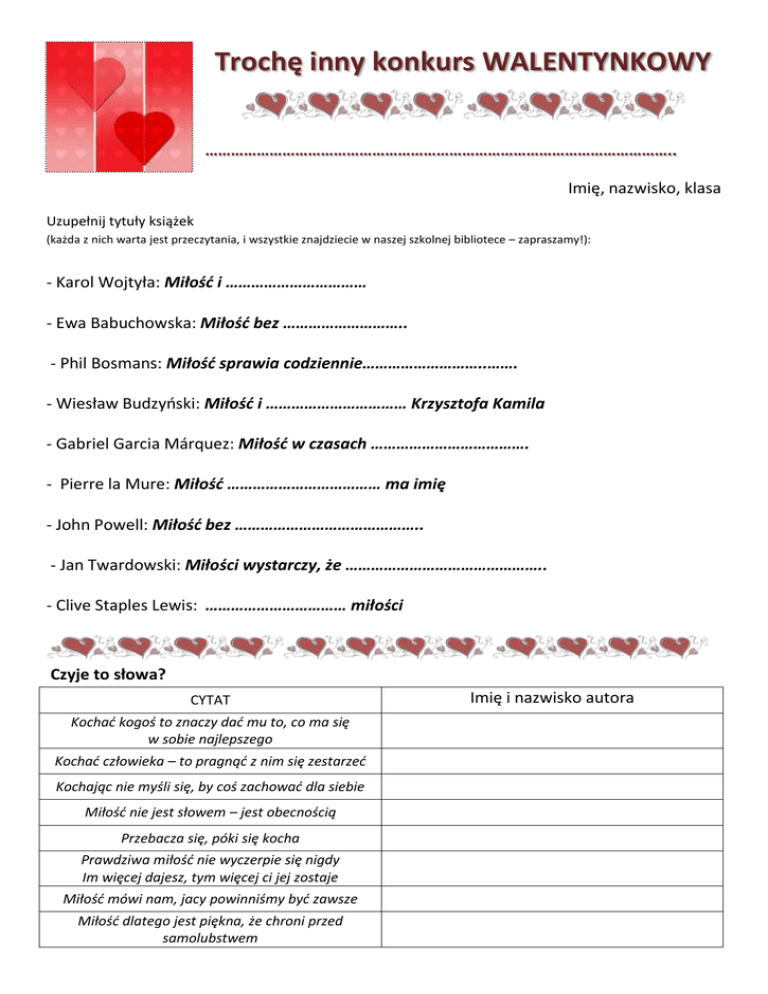 Trochę inny konkurs WALENTYNKOWY ……………………………………………………………………………………………….. Imię, nazwisko, klasa Uzupełnij tytuły książek (każda z nich warta jest przeczytania, i wszystkie znajdziecie w naszej szkolnej bibliotece – zapraszamy!): - Karol Wojtyła: Miłość i …………………………… - Ewa Babuchowska: Miłość bez ……………………….. - Phil Bosmans: Miłość sprawia codziennie………………………..……. - Wiesław Budzyński: Miłość i …………………………… Krzysztofa Kamila - Gabriel Garcia Márquez: Miłość w czasach ………………………………. - Pierre la Mure: Miłość ……………………………… ma imię - John Powell: Miłość bez …………………………………….. - Jan Twardowski: Miłości wystarczy, że ……………………………………….. - Clive Staples Lewis: …………………………… miłości Czyje to słowa? CYTAT Kochać kogoś to znaczy dać mu to, co ma się w sobie najlepszego Kochać człowieka – to pragnąć z nim się zestarzeć Kochając nie myśli się, by coś zachować dla siebie Miłość nie jest słowem – jest obecnością Przebacza się, póki się kocha Prawdziwa miłość nie wyczerpie się nigdy Im więcej dajesz, tym więcej ci jej zostaje Miłość mówi nam, jacy powinniśmy być zawsze Miłość dlatego jest piękna, że chroni przed samolubstwem Imię i nazwisko autora Ubodzy, gdy się miłują, są bardzo bogaci Można nie kochać cię – i żyć, ale nie można owocować Podaj imię (oraz jeśli jest znane – nazwisko) drugiej osoby znanej pary: kobiety mężczyźni kobiety Odyseusz pani de Rênal mężczyźni Helena Kurcewiczówna Winston Smith Don Kichot z Manchy Oleńka Bilewiczówna Izabela Łęcka Laura Kościeniecka Winicjusz Heatcliff Izolda Eurydyka Petrarka Raskolnikow Natasza Rostowa Jan Bohatyrowicz Anna Karenina Joanna Podborska Werter Cyrano de Bergerac Uzupełnij tekst: 14 lutego wspominamy świętego Walentego, który był biskupem w …………... Poniósł śmierć męczeńską około ……………….. roku. Jest patronem: 1. ………………………………… 2. ……………………………….. 3. ……………………………….... Uzupełnij tabelkę – wykaz kilku bardzo znanych powieści z wątkiem miłosnym (oczywiście wszystkie mamy w zbiorach): Imię i nazwisko autora: Emily Szekspir Jane Margaret Mniszek Tadeusz Dołęga- Tytuł: Wzgórza i Julia Duma i Przeminęło z Trędowata Znachor