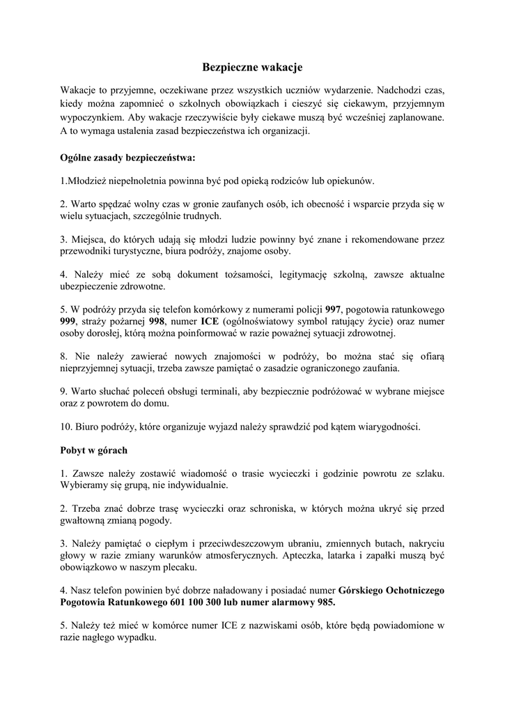 Bezpieczne wakacje Wakacje to przyjemne, oczekiwane przez wszystkich uczniów wydarzenie. Nadchodzi czas, kiedy można zapomnieć o szkolnych obowiązkach i cieszyć się ciekawym, przyjemnym wypoczynkiem. Aby wakacje rzeczywiście były ciekawe muszą być wcześniej zaplanowane. A to wymaga ustalenia zasad bezpieczeństwa ich organizacji. Ogólne zasady bezpieczeństwa: 1.Młodzież niepełnoletnia powinna być pod opieką rodziców lub opiekunów. 2. Warto spędzać wolny czas w gronie zaufanych osób, ich obecność i wsparcie przyda się w wielu sytuacjach, szczególnie trudnych. 3. Miejsca, do których udają się młodzi ludzie powinny być znane i rekomendowane przez przewodniki turystyczne, biura podróży, znajome osoby. 4. Należy mieć ze sobą dokument tożsamości, legitymację szkolną, zawsze aktualne ubezpieczenie zdrowotne. 5. W podróży przyda się telefon komórkowy z numerami policji 997, pogotowia ratunkowego 999, straży pożarnej 998, numer ICE (ogólnoświatowy symbol ratujący życie) oraz numer osoby dorosłej, którą można poinformować w razie poważnej sytuacji zdrowotnej. 8. Nie należy zawierać nowych znajomości w podróży, bo można stać się ofiarą nieprzyjemnej sytuacji, trzeba zawsze pamiętać o zasadzie ograniczonego zaufania. 9. Warto słuchać poleceń obsługi terminali, aby bezpiecznie podróżować w wybrane miejsce oraz z powrotem do domu. 10. Biuro podróży, które organizuje wyjazd należy sprawdzić pod kątem wiarygodności. Pobyt w górach 1. Zawsze należy zostawić wiadomość o trasie wycieczki i godzinie powrotu ze szlaku. Wybieramy się grupą, nie indywidualnie. 2. Trzeba znać dobrze trasę wycieczki oraz schroniska, w których można ukryć się przed gwałtowną zmianą pogody. 3. Należy pamiętać o ciepłym i przeciwdeszczowym ubraniu, zmiennych butach, nakryciu głowy w razie zmiany warunków atmosferycznych. Apteczka, latarka i zapałki muszą być obowiązkowo w naszym plecaku. 4. Nasz telefon powinien być dobrze naładowany i posiadać numer Górskiego Ochotniczego Pogotowia Ratunkowego 601 100 300 lub numer alarmowy 985. 5. Należy też mieć w komórce numer ICE z nazwiskami osób, które będą powiadomione w razie nagłego wypadku. 6. Pamiętać należy o prawidłowym opalaniu z kremem z wysokim filtrem. 7. Należy unikać picia alkoholu i zachowań ryzykownych. Pobyt nad morzem 1.Nad morzem można się kąpać tylko w miejscach dozwolonych pod okiem ratownika. Nie wchodzimy do wody w pobliżu mostów, portów i przystani. Najlepsze kąpieliska są przy służbach Wodnego Ochotniczego Pogotowia Ratunkowego. Biała flaga oznacza kąpiel dozwoloną, czerwona flaga kąpiel zabronioną z powodu złych warunków atmosferycznych. 2. Co zabieramy ze sobą na plażę? Krem z filtrem, aby uniknąć poparzenia słonecznego, wodę do picia, koniecznie nakrycie głowy chroniące przed udarem, okulary przeciwsłoneczne oraz telefon komórkowy z zapisanym numerem alarmowym Wodnego Ochotniczego Pogotowia Ratunkowego: 601 100 100. 3. W komórce powinien też być numer ICE z kontaktem osoby, którą należy powiadomić w razie wypadku. 4. Należy zawsze słuchać poleceń instruktora i ratownika, na głęboką wodę można wypływać tylko posiadaczom karty pływackiej drugiego stopnia. Na łodzi nie wolno zdejmować kapoka, pomimo, że jest niewygodny ratuje życie w razie wpadnięcia do wody. Pamiętajmy o bojach w polu pływania, to one wyznaczają obszar poruszania się osoby pływającej. 5. Szukając ochłody nie wolno wchodzić do zimnej wody, bo może to spowodować szok termiczny i pobyt w szpitalu. Najpierw trzeba skorzystać z prysznica i dopiero potem powoli wchodzić do wody. 6. Podczas pobytu na plaży i w wodzie nie wolno pić alkoholu, grozi to utonięciem. 7. Na plażę najlepiej wybrać się grupą w kilka osób i pilnować się nawzajem. 8. Należy unikać zachowań ryzykownych. 9. Pobyt nad jeziorami i rzekami - w jeziorach i rzekach lepiej nie pływać, mają wiry, ostre nurty i nieregularne podłoże. Zamiast tego można skorzystać z ofert basenów krytych i odkrytych w regionie. Adresy takich miejsc są w przewodnikach turystycznych oraz na stronach internetowych. Gdzie się wybrać? Możliwości jest wiele. Powinny to być miejsca polecane przez znajomych, biura podróży, informatory turystyczne. Najlepiej jechać z rodziną lub dobrymi znajomymi, na których wsparcie możemy zawsze liczyć i koszty grupowe są mniejsze. Osobom, które lubią piękną górską przyrodę można polecić szlaki górskie w Beskidzie Śląskim i Żywieckim, Pieniny, Góry Stołowe w Sudetach. Można odbyć długi spacer do Morskiego Oka w Tatrach. Kto woli morze ma szeroki wybór małych i dużych miejscowości na polskim wybrzeżu, gdzie może podziwiać plaże z zachodami słońca, ale nie tylko. Wiele miejscowości ma charakter zabytkowy np. Gdańsk. Zabytki i skanseny kuszą swoją historią. Można zwiedzić też wszystkie polskie latarnie morskie. Kto lubi jeziora, żeglarstwo i sporty wodne niech wybierze się na Mazury lub Pojezierze Wielkopolskie. Można tam zrobić kurs pływacki lub żeglarski. Na koneserów zabytków i sztuki czekają zamki Dolnego Śląska. Urzekają pięknem, tajemniczością i bogatą historią. A sympatycy dzikiej przyrody mogą odpocząć w leśniczówkach w Borach Tucholskich, Bieszczadach lub okolicy Białowieży. Wybór zależy od naszych zainteresowań, charakteru oraz aktualnych potrzeb. A co można polecić osobom, które z różnych przyczyn nie mogą wyjechać z miasta? Takie osoby mogą organizować sobie krótkie wycieczki po regionie np. zwiedzanie zamków na Jurze Krakowsko Częstochowskiej, jednodniowy wyjazd w góry, wyjście na basen, grill z rodziną lub znajomymi. Miłośnicy filmu i sztuki mogą skorzystać z letniej propozycji repertuarów kinowych lub teatralnych. Kto lubi ruch może się wybrać do parku rozrywki, który zaskoczy go niejedną atrakcją. A dla tych os