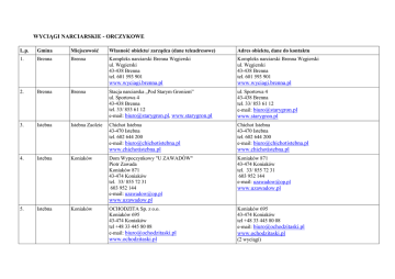 WYCIĄGI NARCIARSKIE - ORCZYKOWE L.p. Gmina Miejscowość Własność obiektu/ zarządca (dane teleadresowe) Adres obiektu, dane do kontaktu 1. Brenna Brenna Kompleks narciarski Brenna Węgierski ul. Węgierski 43-438 Brenna tel. 601 593 901 Kompleks narciarski Brenna Węgierski ul. Węgierski 43-438 Brenna tel. 601 593 901 www.wyciagi.brenna.pl www.wyciagi.brenna.pl Stacja narciarska „Pod Starym Groniem” ul. Sportowa 4 43-438 Brenna tel. 33/ 853 61 12 e-mail: [email protected], www.starygron.pl ul. Sportowa 4 43-438 Brenna tel. 33/ 853 61 12 e-mail: [email protected] Chichot Istebna 43-470 Istebna tel. 602 644 200 e-mail: [email protected] Chichot Istebna 43-470 Istebna tel. 602 644 200 e-mail: [email protected] www.chichotistebna.pl www.chichotistebna.pl Dom Wypoczynkowy "U ZAWADÓW" Piotr Zawada Koniaków 871 43-474 Koniaków tel. 33/ 855 72 31 603 952 144 e-mail: [email protected] Koniaków 871 43-474 Koniaków tel. 33/ 855 72 31 603 952 144 e-mail: [email protected] 2. 3. 4. Brenna Istebna Istebna Brenna Istebna Zaolzie Koniaków www.starygron.pl www.uzawadow.pl www.uzawadow.pl 5. Istebna Koniaków OCHODZITA Sp. z o.o. Koniaków 695 43-474 Koniaków tel +48 33 445 80 08 e-mail: [email protected] Koniaków 695 43-474 Koniaków tel +48 33 445 80 08 e-mail: [email protected] www.ochodzitaski.pl (2 wyciągi) www.ochodzitaski.pl 6. Skoczów Skoczów Skoczowski Ośrodek Sportu i Rekreacji ul. Górecka 2A 43-430 Skoczów Tel. 33/ 853 18 20, 33/ 858 46 11 e-mail: [email protected] www.basendelfin.pl, www.skoczow-sosir.pl 7. Ustroń Ustroń 4 wyciągów bd 8. Wisła Wisła- Jawornik Właściciel: Joachim Słowiok ul. Cieślarów 13 43-460 Wisła tel. 502 367 589 e-mail: [email protected] [email protected] www.czupel.com.pl ul. Gajowa 43-430 Skoczów tel. 33/ 853 18 20 wew. 101, 106 e-mail: [email protected] www.basendelfin.pl, www.skoczow-sosir.pl Czupel ul. Cieślarów 13 43-460 Wisła tel. 502 367 589 e-mail: [email protected] [email protected] www.czupel.com.pl 9. Wisła Wisła- Jawornik Właściciel: Bodeko Hotele Sp. zo.o. ul. Jawornik 52A 43-460 Wisła tel. 33/ 856 41 00 e-mail: [email protected] www.hotelstok.pl 10. Wisła Wisła- Centrum Andrzej Poleczek ul. Partecznik 6 43-460 Wisła tel. 33/ 855 28 50 33/ 855 18 44 e-mail: [email protected] www.partecznik.bo.pl 11. Wisła Wisła- Jawornik Seweryn Kwaśny ul. Cieślarów 15 A 43-460 Wisła Kiczera ul. Jawornik 52A 43-460 Wisła tel. 33/ 856 41 00 e-mail: [email protected] www.hotelstok.pl Partecznik ul. Partecznik 6 43-460 Wisła tel. 33/ 855 28 50 33/ 855 18 44 e-mail: [email protected] www.partecznik.bo.pl Rowienki ul. Cieślarów 15 A 43-460 Wisła 12. Wisła tel. 33/ 855 30 26 606 499 878 e-mail: [email protected] tel. 33/ 855 30 26 606 499 878 e-mail: [email protected] www.rowienki.pl www.rowienki.pl Wisła- Jawornik Wagart Warszawa Sp. zo.o. ul. Zawiszy Czarnego 2 40-872 Katowice tel. 32/ 250 62 90 32/ 608 00 28 e- mail: [email protected] www.soszow.pl Soszów ul. Cieślarów 30 43-460 Wisła tel. 33/ 855 28 32 33/ 474 23 95 e- mail: [email protected] www.soszow.pl