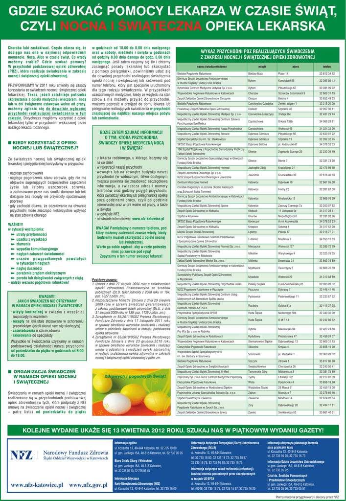 GDZIE SZUKAĆ POMOCY LEKARZA W CZASIE ŚWIĄT, CZYLI NOCNA I ŚWIĄTECZNA OPIEKA LEKARSKA Choroba lubi zaskakiwać. Często zdarza się, że dosięga nas ona w najmniej odpowiednim momencie. Nocą. Albo w czasie świąt. Co wtedy możemy zrobić? Gdzie szukać pomocy? W przychodni podstawowej opieki zdrowotnej (POZ), która realizuje świadczenia w zakresie nocnej i świątecznej opieki zdrowotnej. PRZYPOMNIJMY! W 2011 roku zmieniły się zasady korzystania ze świadczeń nocnej i świątecznej opieki lekarskiej. Teraz, jeżeli zaistnieje potrzeba skorzystania z opieki medycznej wieczorem, nocą lub w dni świąteczne ustawowo wolne od pracy, możemy zgłosić się do dowolnie wybranej przychodni realizującej świadczenia w tym zakresie. Dotychczas mogliśmy korzystać z opieki lekarskiej tylko w przychodni wskazanej przez naszego lekarza rodzinnego. n KIEDY KORZYSTAĆ Z OPIEKI NOCNEJ LUB ŚWIĄTECZNEJ? Ze świadczeń nocnej lub świątecznej opieki lekarskiej i pielęgniarskiej korzystamy w przypadku: · nagłego zachorowania · nagłego pogorszenia stanu zdrowia, gdy nie ma objawów sugerujących bezpośrednie zagrożenie życia lub istotny uszczerbek zdrowia, a zastosowane przez nas środki domowe lub leki dostępne bez recepty nie przyniosły spodziewanej poprawy · gdy zachodzi obawa, że oczekiwanie na otwarcie przychodni może znacząco niekorzystnie wpłynąć na stan zdrowia chorego WAŻNE!!! w sytuacji wystąpienia: ü utraty przytomności ü upadku z wysokości ü złamania ü wypadku komunikacyjnego ü nagłych zaburzeń świadomości ü urazów powypadkowych powstałych w sytuacjach nagłych ü nagłej duszności ü porażenia prądem elektrycznym ü porodu lub dolegliwości związanych z ciążą – należy wezwać pogotowie ratunkowe! UWAGA!!!! JAKICH ŚWIADCZEŃ NIE OTRZYMAMY W RAMACH OPIEKI NOCNEJ I ŚWIATECZNEJ? · wizyty kontrolnej w związku z wcześniej rozpoczętym leczeniem · recepty na leki stale stosowane w schorzeniu przewlekłym (jeżeli akurat nam się skończyły) · zaświadczenia o stanie zdrowia · skierowania do specjalisty Wszystkie te świadczenia uzyskamy w ramach podstawowej działalności naszej przychodni od poniedziałku do piątku w godzinach od 8.00 do 18.00. n ORGANIZACJA ŚWIADCZEŃ W RAMACH OPIEKI NOCNEJ I ŚWIĄTECZNEJ w godzinach od 18.00 do 8.00 dnia następnego oraz w soboty, niedziele i święta w godzinach od godziny 8.00 dnia danego do godz. 8.00 dnia następnego. Jeśli zatem czujemy się źle i chcemy zasięgnąć porady lekarskiej lub skorzystać z pomocy pielęgniarki, powinniśmy udać się do dowolnej przychodni realizującej świadczenia opieki nocnej i świątecznej lub zadzwonić pod numer telefonu, który jest specjalnie uruchomiony dla tego rodzaju świadczenia. W przypadkach uzasadnionych medycznie, kiedy ze względu na stan zdrowia nie możemy przyjść do przychodni, możemy poprosić o przyjazd do domu lekarza lub pielęgniarkę realizujących świadczenia w przychodni znajdującej się najbliżej naszego miejsca pobytu lub zamieszkania. GDZIE ZATEM SZUKAĆ INFORMACJI O TYM, KTÓRA PRZYCHODNIA ŚWIADCZY OPIEKĘ MEDYCZNĄ NOCĄ I W ŚWIĘTA? · u lekarza rodzinnego, u którego leczymy się na co dzień · w rejestracji naszej przychodni · wewnątrz lub na zewnątrz budynku naszej przychodni (w widocznym, łatwo dostępnym miejscu powinna się znajdować szczegółowa informacja, a zwłaszcza adres i numery telefonów oraz godziny przyjęć przychodni, która świadczy lekarską lub pielęgniarską opiekę poza godzinami pracy, czyli po godzinie osiemnastej oraz w dni wolne od pracy, a także w święta) · w oddziale NFZ · na stronie internetowej: www.nfz-katowice.pl UWAGA! Pamiętajmy o numerze telefonu, pod który możemy zadzwonić zawsze wtedy, kiedy będziemy musieli skorzystać z opieki nocnej lub świątecznej. Warto go sobie zapisać, aby w razie potrzeby mieć go zawsze pod ręką! Zapytajmy o ten numer swojego lekarza! Podstawa prawna: 1. Ustawa z dnia 27 sierpnia 2004 roku o świadczeniach opieki zdrowotnej finansowanych ze środków publicznych (Dz.U. tekst jednolity z 2008 roku nr 164; poz. 1027 z późn. zm.) 2. Rozporządzenie Ministra Zdrowia z dnia 29 sierpnia 2009 roku w sprawie świadczeń gwarantowanych z zakresu podstawowej opieki zdrowotnej (Dz.U. z dnia 31 sierpnia 2009 roku nr 139; poz. 1139 z późn. zm.) 3. Zarządzenie nr 85/2011/DSOZ Prezesa Narodowego Funduszu Zdrowia z dnia 17 listopada 2011 roku w sprawie określenia warunków zawierania i realizacji umów o udzielanie świadczeń w rodzaju: podstawowa opieka zdrowotna 4. Zarządzenie nr 85/2010/DSOZ Prezesa Narodowego Funduszu Zdrowia z dnia 23 grudnia 2010 roku w sprawie określenia warunków zawierania i realizacji umów o udzielanie świadczeń opieki zdrowotnej w rodzaju podstawowa opieka zdrowotna w zakresie nocnej i świątecznej opieki zdrowotnej z późn. zm. Zdrowych i pogodnych Świąt! Świadczenia w ramach opieki nocnej i świątecznej realizowane są w przychodniach podstawowej opieki zdrowotnej (w tych, które podpisały z NFZ umowę na świadczenie opieki nocnej i świątecznej – patrz lista) od poniedziałku do piątku WYKAZ PRZYCHODNI POZ REALIZUJĄCYCH ŚWIADCZENIA Z ZAKRESU NOCNEJ I ŚWIĄTECZNEJ OPIEKI ZDROWOTNEJ nazwa świadczeniodawcy miasto adres telefon Bielskie Pogotowie Ratunkowe Bielsko-Biała Plater 14 33 812 34 12 Górniczy Zespół Lecznictwa Ambulatoryjnego w Rudzie Śląskiej Fundacji Unia Bracka Bytom Konstytucji 89 32 395 05 13 Bytomskie Centrum Medyczne Jedynka Sp. z o.o. Bytom Piłsudskiego 67 32 281 09 22 Wojewódzkie Pogotowie Ratunkowe w Katowicach Chorzów Strzelców Bytomskich 9 32 609 31 13 Zespół Zakładów Opieki Zdrowotnej w Cieszynie Cieszyn Bielska 4 33 852 49 33 Bielskie Pogotowie Ratunkowe Czechowice-Dziedzice Żwirki i Wigury 1 32 215 20 00 Powiatowy Zespół Zakładów Opieki Zdrowotnej Czeladź Szpitalna 40 32 267 30 11 Niepubliczny Zakład Opieki Zdrowotnej Medipoz Sp. z o.o. Czer