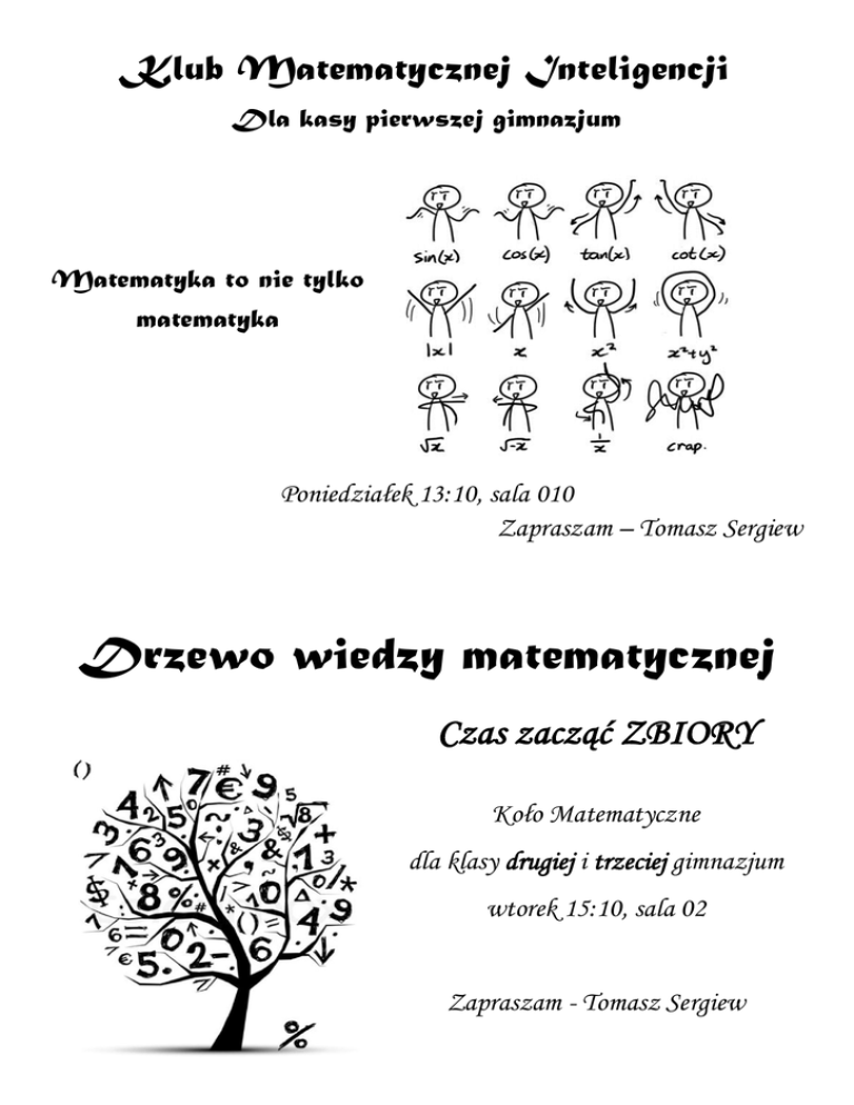 Klub Matematycznej Inteligencji Dla kasy pierwszej gimnazjum Matematyka to nie tylko matematyka Poniedziałek 13:10, sala 010 Zapraszam – Tomasz Sergiew Drzewo wiedzy matematycznej Czas zacząć ZBIORY Koło Matematyczne dla klasy drugiej i trzeciej gimnazjum wtorek 15:10, sala 02 Zapraszam - Tomasz Sergiew