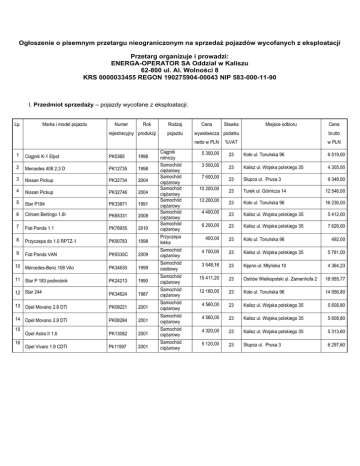 Ogłoszenie o pisemnym przetargu nieograniczonym na sprzedaż pojazdów wycofanych z eksploatacji Przetarg organizuje i prowadzi: ENERGA-OPERATOR SA Oddział w Kaliszu 62-800 ul. Al. Wolności 8 KRS 0000033455 REGON 190275904-00043 NIP 583-000-11-90 I. Przedmiot sprzedaży – pojazdy wycofane z eksploatacji: Lp. Marka i model pojazdu Numer Rok rejestracyjny produkcji 1 Ciągnik K-1 Elpol PK0365 1998 2 Mercedes 408 2,3 D PK12735 1998 3 Nissan Pickup PK32734 2004 4 Nissan Pickup PK32746 2004 5 Star P184 PK33871 1991 6 Citroen Berlingo 1.6I PK65331 2008 7 Fiat Panda 1.1 PK76935 2010 8 Przyczepa do 1.0 RPTZ-1 PK90783 1998 9 Fiat Panda VAN PK9335C 2009 10 Mercedes-Benz 108 Vito PK34630 1999 11 Star P 183 podnośnik PK24213 1990 12 Star 244 PK34624 1987 13 Opel Movano 2.8 DTI PK09221 2001 14 Opel Movano 2.8 DTI PK08284 2001 Opel Astra II 1.6 PK13082 2001 Opel Vivaro 1.9 CDTI Pk11597 2001 15 16 Rodzaj pojazdu Ciągnik rolniczy Samochód ciężarowy Samochód ciężarowy Samochód ciężarowy Samochód ciężarowy Samochód ciężarowy Samochód ciężarowy Przyczepa lekka Samochód ciężarowy Samochód osobowy Samochód ciężarowy Samochód ciężarowy Samochód ciężarowy Samochód ciężarowy Samochód ciężarowy Samochód ciężarowy Cena Stawka Miejsce odbioru Cena wywoławcza podatku brutto netto w PLN w PLN %VAT 5 300,00 23 Koło ul. Toruńska 96 6 519,00 3 500,00 23 Kalisz ul. Wojska polskiego 35 4 305,00 7 600,00 23 Słupca ul. Prusa 3 9 348,00 10 200,00 23 Turek ul. Górnicza 14 12 546,00 13 200,00 23 Koło ul. Toruńska 96 16 236,00 4 400,00 23 Kalisz ul. Wojska polskiego 35 5 412,00 6 200,00 23 Kalisz ul. Wojska polskiego 35 7 626,00 400,00 23 Koło ul. Toruńska 96 4 700,00 23 Kalisz ul. Wojska polskiego 35 5 781,00 3 548,16 23 Kępno ul. Młyńska 10 4 364,23 15 411,20 23 Ostrów Wielkopolski ul. Zamenhofa 2 18 955,77 12 160,00 23 Koło ul. Toruńska 96 14 956,80 4 560,00 23 Kalisz ul. Wojska polskiego 35 5 608,80 4 560,00 23 Kalisz ul. Wojska polskiego 35 5 608,80 4 320,00 23 Kalisz ul. Wojska polskiego 35 5 313,60 5 120,00 23 Słupca ul. Prusa 3 6 297,60 492,00 II. Warunki udziału w przetargu 1. W przetargu mogą brać udział spółki Grupy ENERGA oraz pracownicy Spółki ENERGA OPERATOR SA 2. Uczestnik przetargu winien złożyć ofertę w formie pisemnej w zamkniętej kopercie 3. Ofertę należy składać w siedzibie Organizatora przetargu: Kalisz ul. Al. Wolności 8, w kancelarii pokój nr 3, w terminie do 27.01.2017 4. Złożenie oferty zostanie potwierdzone pieczęcią wpływu złożenia. 5. Komisyjne otwarcie ofert odbędzie się w ciągu trzech dni roboczych od terminu zakończenia składania ofert 6. Informacji o stanie technicznym wraz z wyceną rzeczoznawcy (częścią opisową) pojazdu udziela Pan Rafał Grabarczyk [email protected] , tel. 62 5002334 w godz. 8.00-12.00. 7. Oględzin pojazdu można dokonać w podanym w tabeli „miejscu odbioru: po wcześniejszym uzgodnieniu telefonicznym z osobą wskazaną w pkt 6 8. Pojazd zostanie sprzedany Uczestnikowi, który zaoferuje najwyższą cenę brutto za dany pojazd, nie niższą niż cena wywoławcza brutto. 9. W przypadku, gdy kilku Uczestników przetargu zaoferuje jednakową cenę brutto, Uczestnicy zostaną wezwani w dniu otwarcia ofert (ustnie, telefonicznie, bądź e-mailowo) do złożenia pisemnej oferty dodatkowej na formularzu ofertowym – załącznik nr 1. 10. Zespół likwidacyjny po rozpatrzeniu ofert niezwłocznie poinformuje nabywcę o rezultacie.