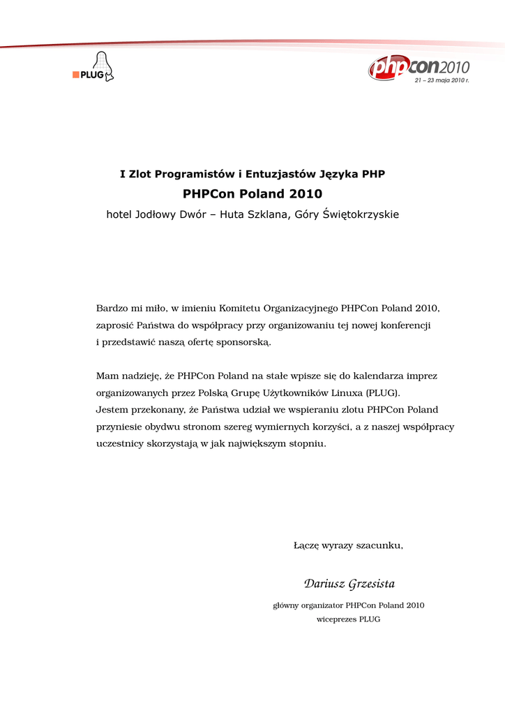 I Zlot Programistów i Entuzjastów Języka PHP PHPCon Poland 2010 hotel Jodłowy Dwór – Huta Szklana, Góry Świętokrzyskie Bardzo mi miło, w imieniu Komitetu Organizacyjnego PHPCon Poland 2010, zaprosić Państwa do współpracy przy organizowaniu tej nowej konferencji i przedstawić naszą ofertę sponsorską. Mam nadzieję, że PHPCon Poland na stałe wpisze się do kalendarza imprez organizowanych przez Polską Grupę Użytkowników Linuxa (PLUG). Jestem przekonany, że Państwa udział we wspieraniu zlotu PHPCon Poland przyniesie obydwu stronom szereg wymiernych korzyści, a z naszej współpracy uczestnicy skorzystają w jak największym stopniu. Łączę wyrazy szacunku, Dariusz Grzesista główny organizator PHPCon Poland 2010 wiceprezes PLUG INFORMACJE NA TEMAT ZLOTU PHPCon Poland 2010 to pierwsza edycja ogólnopolskiej konferencji programistów i entuzjastów języka PHP, organizowana siłami wolontariuszy z całego kraju pod egidą stowarzyszenia Polska Grupa Użytkowników Linuxa (PLUG). Nazwa, czas i miejsce PHPCon Poland 2010, 2123 maja 2010 r.; http://www.phpcon.pl/ Ośrodek TurystycznoWypoczynkowy „Jodłowy Dwór”, Huta Szklana w powiecie kieleckim; http://www.jodlowydwor.com.pl/ Misja i cel Podnoszenie kwalifikacji, szerzenie dobrych praktyk programistycznych, integracja środowisk programistów PHP w Polsce oraz wymiana doświadczeń. Podobnie, jak inne imprezy o ogólnopolskim charakterze organizowane przez PLUG (czyli: Pingwinaria, Jesień Linuksowa oraz PyCon PL), zlot odbywać się będzie w weekend właśnie po to, by umożliwić uczestnictwo jak najszerszej grupie zainteresowanych. Grupa docelowa Specjaliści i entuzjaści programowania w języku PHP oraz technologiach pokrewnych. Z racji niewygórowanej ceny imprezy, zarówno studenci, uczniowie, jak i pracownicy firm czy instytucji. Tematyka Szeroko rozumiane programowanie i administrowanie środowiskiem PHP. Frameworki, serwery, najnowsze koncepcje, trendy i technologie. Wymiana pomysłów i doświadczeń, prezentacje indywidualnych podejść do problemów i sposoby ich rozwiązywania. oferta sponsorska PAKIET ZŁOTY • tytuł „Złotego Sponsora PHPCon Poland 2010”, przyznany na wyłączność (akceptujemy tylko jeden taki tytuł w ramach jednej edycji zlotu); • ulokowanie stoiska reklamowego Sponsora w pomieszczeniu bezpośrednio poprzedzającym główną salę wykładową; • umieszczenie znaku firmowego Sponsora na każdej podstronie serwisu internetowego konferencji, wraz z linkiem do strony internetowej wskazanej przez Sponsora, a także – niezależnie – w dziale „Sponsorzy” serwisu; • informacja o Sponsorze w materiałach prasowych, dotyczących zlotu; • możliwość przeprowadzenia specjalnej prelekcji lub warsztatu, służącej rekrutacji kadr Sponsora; • możliwość przeprowadzenia merytorycznego 90minutowego wykładu albo dwóch 45minutowych wykładów Sponsora; • możliwość przeprowadzenia ankiety wśród uczestników zlotu; • dołączenie gadżetów i materiałów promocyjnych, takich jak ulotki, foldery reklamowe, itp. do starterpacka, który uczestnicy otrzymają podczas rejestracji w ośrodku; • umieszczenie banneru lub standu reklamowego Sponsora w najbliższym sąsiedztwie ekranu, w głównej sali konferencyjnej imprezy; • umieszczenie dodatkowych reklam Sponsora w uzgodnionych miejscach; • informacja o sponsorowaniu głównej nagrody, o ile Sponsor ufunduje taką nagrodę; • informacja o sponsorowaniu dodatkowych nagród, o ile Sponsor je ufunduje; • możliwość wyświetlania prezentacji lub planszy graficznej Sponsora, w przerwach pomiędzy wykładami; • nieodpłatny udział dwóch przedstawicieli Sponsora w imprezie. Cena: 5 000 zł netto oferta sponsorska PAKIET SREBRNY • tytuł „Srebrnego Sponsora”; • ulokowanie stoiska reklamowego Sponsora w pomieszczeniu bezpośrednio poprzedzającym główną salę wykładową; • umieszczenie znaku firmowego Sponsora w dziale „Sponsorzy” serwisu internetowego konferencji, wraz z linkiem do strony internetowej wskazanej przez Sponsora; • możliwość przeprowadzenia specjalnej prelekcji lub warsztatu, służącej rekrutacji kadr Sponsora; • możliwość przeprowadzenia merytorycznego 45minutowego wykładu Sponsora; • dołączenie gadżetów i materiałów promocyjnych, takich jak ulotki, foldery reklamowe, itp. do starterpacka, który uczestnicy otrzymają podczas rejestracji w ośrodku; • umieszczenie banneru lub standu reklamowego Sponsora w głównej sali konferencyjnej imprezy; • umieszczenie dodatkowych reklam Sponsora w uzgodnionych miejscach; • informacja o sponsorowaniu dodatkowych nagród, o ile Sponsor je ufunduje; • możliwość wyświetlania prezentacji lub planszy graficznej Sponsora, w przerwach pomiędzy wykładami; • nieodpłatny udział jednego przedstawiciela Sponsora w imprezie. Cena: 2 000 zł netto oferta sponsorska PAKIET BRĄZOWY • tytuł „Brązowego Sponsora”; • ulokowanie stoiska reklamowego Sponsora w pomieszczeniu bezpośrednio poprzedzającym główną salę wykładową; • umieszczenie znaku firmowego Sponsora w dziale „Sponsorzy” serwisu internetowego konferencji, wraz z linkiem do strony internetowej wskazanej przez Sponsora; • dołączenie gadżetów i materiałów promocyjnych, takich jak ulotki, foldery reklamowe, itp. do starterpacka, który uczestnicy otrzymają podczas rejestracji w ośrodku; • umieszczenie banneru lub standu reklamowego Sponsora w głównej sali konferencyjnej imprezy; • informacja o sponsorowaniu dodatkowych nagród, o ile Sponsor je ufunduje. Cena: 1 000 zł netto Kontakt: Dariusz Grzesista email: [email protected] GSM: +48 508 050345