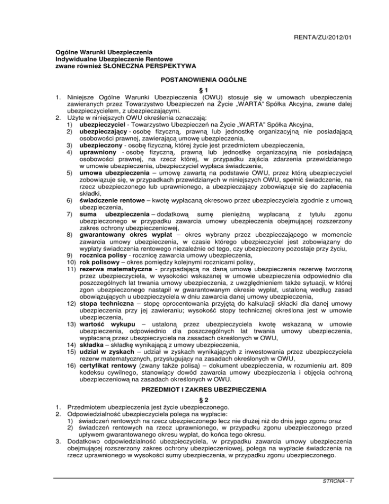 RENTA/ZU/2012/01 Ogólne Warunki Ubezpieczenia Indywidualne Ubezpieczenie Rentowe zwane również SŁONECZNA PERSPEKTYWA POSTANOWIENIA OGÓLNE §1 1. Niniejsze Ogólne Warunki Ubezpieczenia (OWU) stosuje się w umowach ubezpieczenia zawieranych przez Towarzystwo Ubezpieczeń na Życie „WARTA” Spółka Akcyjna, zwane dalej ubezpieczycielem, z ubezpieczającymi. 2. Użyte w niniejszych OWU określenia oznaczają: 1) ubezpieczyciel - Towarzystwo Ubezpieczeń na Życie „WARTA” Spółka Akcyjna, 2) ubezpieczający - osobę fizyczną, prawną lub jednostkę organizacyjną nie posiadającą osobowości prawnej, zawierającą umowę ubezpieczenia, 3) ubezpieczony - osobę fizyczną, której życie jest przedmiotem ubezpieczenia, 4) uprawniony - osobę fizyczną, prawną lub jednostkę organizacyjną nie posiadającą osobowości prawnej, na rzecz której, w przypadku zajścia zdarzenia przewidzianego w umowie ubezpieczenia, ubezpieczyciel wypłaca świadczenie, 5) umowa ubezpieczenia – umowę zawartą na podstawie OWU, przez którą ubezpieczyciel zobowiązuje się, w przypadkach przewidzianych w niniejszych OWU, spełnić świadczenie, na rzecz ubezpieczonego lub uprawnionego, a ubezpieczający zobowiązuje się do zapłacenia składki, 6) świadczenie rentowe – kwotę wypłacaną okresowo przez ubezpieczyciela zgodnie z umową ubezpieczenia, 7) suma ubezpieczenia – dodatkową sumę pieniężną wypłacaną z tytułu zgonu ubezpieczonego w przypadku zawarcia umowy ubezpieczenia obejmującej rozszerzony zakres ochrony ubezpieczeniowej, 8) gwarantowany okres wypłat – okres wybrany przez ubezpieczającego w momencie zawarcia umowy ubezpieczenia, w czasie którego ubezpieczyciel jest zobowiązany do wypłaty świadczenia rentowego niezależnie od tego, czy ubezpieczony pozostaje przy życiu, 9) rocznica polisy - rocznicę zawarcia umowy ubezpieczenia, 10) rok polisowy – okres pomiędzy kolejnymi rocznicami polisy, 11) rezerwa matematyczna - przypadającą na daną umowę ubezpieczenia rezerwę tworzoną przez ubezpieczyciela, w wysokości wskazanej w umowie ubezpieczenia odpowiednio dla poszczególnych lat trwania umowy ubezpieczenia, z uwzględnieniem także sytuacji, w której zgon ubezpieczonego nastąpił w gwarantowanym okresie wypłat, ustaloną według zasad obowiązujących u ubezpieczyciela w dniu zawarcia danej umowy ubezpieczenia, 12) stopa techniczna – stopę oprocentowania przyjętą do kalkulacji składki dla danej umowy ubezpieczenia przy jej zawieraniu; wysokość stopy technicznej określona jest w umowie ubezpieczenia, 13) wartość wykupu – ustaloną przez ubezpieczyciela kwotę wskazaną w umowie ubezpieczenia, odpowiednio dla poszczególnych lat trwania umowy ubezpieczenia, wypłacaną przez ubezpieczyciela na zasadach określonych w OWU, 14) składka – składkę wynikającą z umowy ubezpieczenia, 15) udział w zyskach – udział w zyskach wynikających z inwestowania przez ubezpieczyciela rezerw matematycznych, przysługujący na zasadach określonych w OWU, 16) certyfikat rentowy (zwany także polisą) – dokument ubezpieczenia, w rozumieniu art. 809 kodeksu cywilnego, stanowiący dowód zawarcia umowy ubezpieczenia i objęcia ochroną ubezpieczeniową na zasadach określonych w OWU. PRZEDMIOT I ZAKRES UBEZPIECZENIA §2 1. Przedmiotem ubezpieczenia jest życie ubezpieczonego. 2. Odpowiedzialność ubezpieczyciela polega na wypłacie: 1) świadczeń rentowych na rzecz ubezpieczonego lecz nie dłużej niż do dnia jego zgonu oraz 2) świadczeń rentowych na rzecz uprawnionego, w przypadku zgonu ubezpieczonego przed upływem gwarantowanego okresu wypłat, do końca tego okresu. 3. Dodatkowo odpowiedzialność ubezpieczyciela, w przypadku zawarcia umowy ubezpieczenia obejmującej rozszerzony zakres ochrony ubezpieczeniowej, polega na wypłacie świadczenia na rzecz uprawnionego w wysokości sumy ubezpieczenia, w przypadku zgonu ubezpieczonego. STRONA - 1 SUMA UBEZPIECZENIA §3 Suma ubezpieczenia odpowiada łącznej kwocie świadczeń rentowych należnych ubezpieczonemu w roku polisowym, w którym nastąpił jego zgon. ZAWARCIE UMOWY UBEZPIECZENIA §4 Umowa ubezpieczenia zawierana jest na czas do dnia zgonu ubezpieczonego, a w przypadku gdy zgon ubezpieczonego nastąpił przed upływem gwarantowanego okresu wypłat – do końca tego okresu. §5 1. Umowa ubezpieczenia zawierana jest na podstawie kompletnie wypełnionego wniosku o zawarcie umowy ubezpieczenia, skierowanego do ubezpieczyciela na formularzu przygotowanym przez ubezpieczyciela. 2. Wniosek, o którym mowa w ust. 1, stanowi integralną część umowy ubezpieczenia. 3. Jeżeli wniosek, o którym mowa w ust. 1, został wypełniony nieprawidłowo lub jest niekompletny, ubezpieczyciel wezwie ubezpieczającego do uzupełnienia tego wniosku, względnie do sporządzenia nowego wniosku, w terminie 14 dni licząc od daty otrzymania przez ubezpieczającego wezwania na piśmie, z zastrzeżeniem iż w razie niewykonania wezwania ubezpieczyciela umowa ubezpieczenia może nie dojść do skutku. 4. Ubezpieczający, z zastrzeżeniem postanowień ust. 5, powinien dostarczyć wniosek o zawarcie umowy ubezpieczenia do ubezpieczyciela wraz z dowodem zapłacenia składki w wysokości ustalonej przez ubezpieczyciela. Warunek doręczenia dowodu zapłacenia składki, o którym mowa powyżej, nie dotyczy przypadku gdy składka stanowi świadczenie z innej umowy ubezpieczenia zawartej z ubezpieczycielem, która dopuszcza możliwość wypłaty świadczenia w formie renty. 5. Wniosek o zawarcie umowy ubezpieczenia może być złożony także łącznie z wnioskiem o wypłatę świadczenia z tytułu innej umowy ubezpieczenia zawartej z ubezpieczycielem, która dopuszcza możliwość wypłaty świadczeń w formie renty. 6. Ubezpieczeniem może być objęta osoba, która w dniu doręczenia ubezpieczycielowi wniosku o zawarcie umowy ubezpieczenia ukończyła 35 lat i nie ukończyła 71 lat. 7. Umowa ubezpieczenia jest zawart