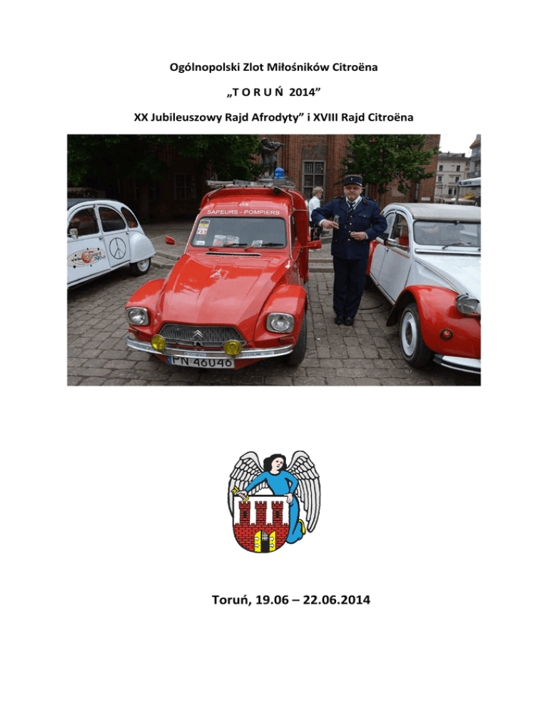 Ogólnopolski Zlot Miłośników Citroëna „T O R U Ń 2014” XX Jubileuszowy Rajd Afrodyty” i XVIII Rajd Citroëna Toruń, 19.06 – 22.06.2014 Ogólnopolski Zlot Miłośników Citroëna XX Jubileuszowy Rajd Afrodyty XVIII Rajd Citroëna Organizatorzy: Automobilklub Toruński PHU Polmozbyt Toruń Holding S.A. Dealer Citroëna w Toruniu Przy wsparciu: Gminy Miasta Toruń Urzędu Marszałkowskiego Województwa Kujawsko – Pomorskiego w Toruniu Starostwa Powiatowego w Toruniu Wojewódzkiego Funduszu Ochrony Środowiska i Gospodarki Wodnej w Toruniu Miejskiego Ośrodka Sportu i Turystyki w Toruniu Citroën Polska TOTAL i OM PTTK im. Mariana Sydowa w Toruniu sponsorzy: Firma THORN 1231 ”WALASZKO” FHU Bol- Car Impreza Zorganizowana w ramach obchodów 55- lecia Automobilklubu Toruńskiego termin imprezy: od 19 czerwca do 22 czerwca 2014 roku cel imprezy: • • • • • • • • Integracja środowiska Miłośników Citroëna Popularyzacja czynnego wypoczynku na świeżym powietrzu Krzewienie zasad ochrony środowiska naturalnego Popularyzacja odznak krajoznawczych wśród turystów motorowych Aktywizacja ruchowa społeczności motorowej i turystycznej Prezentacja walorów miasta Torunia i okolic Prezentacja miejsca światowego zlotu miłośników Citroëna w 2015 roku Prezentacja zabytkowych samochodów Władze imprezy: Dyrektor – Stanisław Marasek V-ce Dyrektor ds. organizacyjnych – Czesław Nosewicz V-ce Dyrektor ds. sportowych – Jan Balcerak V-ce dyrektor ds. turystycznych – Julita Bąkowska Kierownik tras i przewodników PTTK – Marian Rochniński Kierownik rekreacji – Karol Marasek Kierownik techniczny – Jerzy Celmer Szef cateringu – Zbigniew Ligocki Kierownik biura zlotu – Ewa Kozłowska Kierownik komisji obliczeń – Patryk Brejnak Impreza odbędzie się bez względu na pogodę - zakwaterowanie i wpisowe Zakwaterowanie uczestników na campingu TRAMP w Toruniu ul. Kujawska: Wymienione niżej kwoty zawierają ceny trzech noclegów (czwartek/piątek, piątek/sobota, sobota/niedziela) oraz udział w popołudniowych trzech biesiadach (czwartek – Fort I X, piątek – Barbarka i sobota – camping „TRAMP”) 1. Pokoje hotelowe z łazienkami i pokoje w domkach campingowych z łazienkami – 195,- zł od jednej osoby dzieci od lat 7 do 16 – 165,- zł 2. Domki campingowe bez łazienek – 145,- zł od osoby dzieci od lat 7 do 16 – 115,- zł 3. campery i przyczepy campingowe na miejscu z przyłączem elektrycznym – 145,- zł od osoby dzieci od lat 7 do 16 – 115,- zł 4. namiot własny na polu campingowym: 125,- zł od osoby dzieci od lat 7 do 16 – 95,- zł 5. dzieci do lat 7 bezpłatnie 6. istnieje możliwość indywidualnej rejestracji wcześniejszego przyjazdu i późniejszego wyjazdu z imprezy za dodatkową opłatą pod warunkiem dokonania takiej rezerwacji w porozumieniu z organizatorem. w ramach wpisowego oprócz zakwaterowania wliczone są w powyższe kwoty: • • • • • • • • • • • • zwiedzanie z przewodnikiem obiektów „wiedzy” miasta Torunia Biesiada mądrości w Forcie IX BMW Weteran - Club transport autokarem camping – Fort – Camping zwiedzanie z przewodnikiem obiektów sportowych biesiada sportowa na „Barbarce” transport autokarem camping – Barbarka – Camping niespodzianki biesiada turystyczna na campingu TRAMP zabawa taneczna przy muzyce „na żywo” podczas wszystkich biesiad zwiedzanie miasta i fortyfikacji z przewodnikiem materiały do zdobywania odznak krajoznawczych materiały rajdowe wyżywienie uczestników we własnym zakresie. Na terenie campingu istnieje możliwość zakupu śniadań i obiadów w tutejszym zakładzie gastronomicznym. Proponujemy dodatkowe atrakcje w postaci: 1. zwiedzenie muzeum piernika z pokazem wypieku własnoręcznie przygotowanych pierników, seans w Planetarium - 20 zł od osoby 2. pobyt w Aqa-parku „OLENDER”w Wielkiej Nieszawce – 20 zł od osoby 3. zwiedzanie Centrum „Młyn Wiedzy” – 20 zł od osoby Ostateczny termin składania zgłoszeń upływa z dniem 10 czerwca 2014 roku. Ilość miejsc ograniczona i decyduje kolejność zgłoszeń do wyczerpania limitu. Zgłoszenia należy kierować na adres: Automobilklub Toruński, ul.Ducha świetego 5, 87-100 TORUŃ [email protected] i pod nr telefonów + 48 0-56 62-283-61, fax + 48 0-56 622-86-91 wpisowe należy wpłacać na konto AT w banku : BGŻ nr 18 2030 0045 1110 0000 0279 3090 lub w gotówką w siedzibie Automobilklubu Toruńskiego ul.Ducha Świętego 5 w Toruniu. Po dokonaniu zgłoszenia u Pani Ewy Kozłowskiej (aby potwierdzić czy dany limit miejsc zakwaterowania nie został wykorzystany) i uiszczeniu wpłaty na konto z dopiskiem „zlot Citroena Toruń 2014” prosimy o przesłanie kopii dowodu wpłaty mailem lub faksem na adres Automobilklubu Toruńskiego. W przypadku nie przybycia na imprezę organizator nie zwraca wpisowego. W ramach zlotu odbędzie się XVIII Rajd Citroëna i XX Jubileuszowy Rajd Afrodyty W rajdzie startują załogi samochodowe i motocyklowe: kierowca i pilot (pozostałe osoby to załoganci) W rajdzie citroena kierowcą może być kobieta lub mężczyzna startująca dowolnym modelem citroena. W rajdzie Afrodyty za kierownicą dowolnego pojazdu musi zasiadać kobieta. Osoby niepełnosprawne za kierownicą mogą wystartować w dowolnym pojeździe. Każdy dzień zlotu będzie miał charakter tematyczny Szczegółowy program imprezy Czwartek 19 czerwca dzień wiedzy godz. 09:00 – 14:00 Msza w Katedrze św Janów i procesja Bożego Ciała godz.16:00 wyjazd autokaru z campingu 16:00 – 18:00 – zwiedzanie obiektów wiedzy miasta z przewodnikiem lub indywidualnie Centrum „Młyn Wiedzy ”, Centrum Sztuki Współczesnej , Uniwersytet Mikołaja Kopernika, WSKiM, Centrum Szkolenia Artylerii - lub alternatywnie pobyt w Aqa-parku Olender w Wielkiej Nieszawce godziny po 18:00 – biesiada w Forcie IX BMW Weteran - Club godz. 22:00 powrót autokarem na camping wieczorem na campingu pre