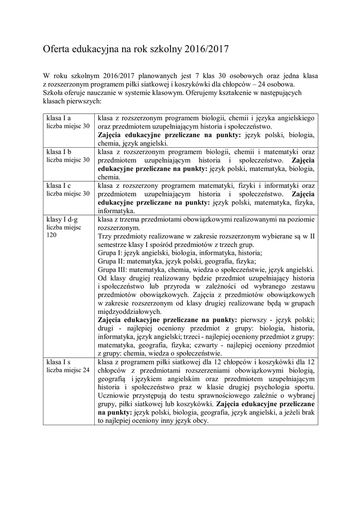 Oferta edukacyjna na rok szkolny 2016/2017 W roku szkolnym 2016/2017 planowanych jest 7 klas 30 osobowych oraz jedna klasa z rozszerzonym programem piłki siatkowej i koszykówki dla chłopców – 24 osobowa. Szkoła oferuje nauczanie w systemie klasowym. Oferujemy kształcenie w następujących klasach pierwszych: klasa I a liczba miejsc 30 klasa I b liczba miejsc 30 klasa I c liczba miejsc 30 klasy I d-g liczba miejsc 120 klasa I s liczba miejsc 24 klasa z rozszerzonym programem biologii, chemii i języka angielskiego oraz przedmiotem uzupełniającym historia i społeczeństwo. Zajęcia edukacyjne przeliczane na punkty: język polski, biologia, chemia, język angielski. klasa z rozszerzonym programem biologii, chemii i matematyki oraz przedmiotem uzupełniającym historia i społeczeństwo. Zajęcia edukacyjne przeliczane na punkty: język polski, matematyka, biologia, chemia. klasa z rozszerzony programem matematyki, fizyki i informatyki oraz przedmiotem uzupełniającym historia i społeczeństwo. Zajęcia edukacyjne przeliczane na punkty: język polski, matematyka, fizyka, informatyka. klasa z trzema przedmiotami obowiązkowymi realizowanymi na poziomie rozszerzonym. Trzy przedmioty realizowane w zakresie rozszerzonym wybierane są w II semestrze klasy I spośród przedmiotów z trzech grup. Grupa I: język angielski, biologia, informatyka, historia; Grupa II: matematyka, język polski, geografia, fizyka; Grupa III: matematyka, chemia, wiedza o społeczeństwie, język angielski. Od klasy drugiej realizowany będzie przedmiot uzupełniający historia i społeczeństwo lub przyroda w zależności od wybranego zestawu przedmiotów obowiązkowych. Zajęcia z przedmiotów obowiązkowych w zakresie rozszerzonym od klasy drugiej realizowane będą w grupach międzyoddziałowych. Zajęcia edukacyjne przeliczane na punkty: pierwszy - język polski; drugi - najlepiej oceniony przedmiot z grupy: biologia, historia, informatyka, język angielski; trzeci - najlepiej oceniony przedmiot z grupy: matematyka, geografia, fizyka; czwarty - najlepiej oceniony przedmiot z grupy: chemia, wiedza o społeczeństwie. klasa z programem piłki siatkowej dla 12 chłopców i koszykówki dla 12 chłopców z przedmiotami rozszerzeniami obowiązkowymi biologią, geografią i językiem angielskim oraz przedmiotem uzupełniającym historia i społeczeństwo praz w klasie drugiej psychologia sportu. Uczniowie przystępują do testu sprawnościowego zależnie o wybranej grupy, piłki siatkowej lub koszykówki. Zajęcia edukacyjne przeliczane na punkty: język polski, biologia, geografia, język angielski, a jeżeli brak to najlepiej oceniony inny język obcy.