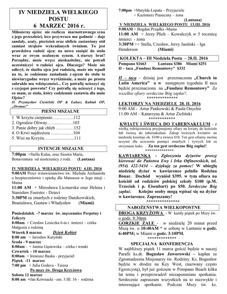 IV NIEDZIELA WIELKIEGO POSTU 6 MARZEC 2016 r. Miłosierny ojciec nie rozlicza marnotrawnego syna z jego przeszłości, lecz przywraca mu godność – daje sandały, szaty, pierścień oraz obficie zastawiony stół zamiast strąków wykradanych świniom. To jest prawdziwa radość ojca: na nowo zasiąść do stołu wraz ze swym ocalonym synem. A starszy brat? Porządny, może wręcz nieskazitelny, nie potrafi uczestniczyć w radości ojca. Dlaczego? Może nie odkrył, że służba ojcu jest radością, może nie wpadł na to, że codzienne zasiadanie z ojcem do stołu to niewiarygodne wręcz wyróżnienie, a może po prostu zabrakło mu wdzięczności... Czy potrafię ucieszyć się z czyjegoś powrotu? Czy potrafię się ucieszyć z tego, co mam, ze stołu, który codziennie zastawia dla mnie Ojciec? O. Przemysław Ciesielski OP & Łukasz Kubiak OP, „Oremus” PIEŚNI MSZALNE 1 W krzyżu cierpienie….………..112 2. Ogrodzie Oliwny……..……….103 3. Panie dobry jak chleb …………152 4. O Krwi najdroższa …..……..…104 5. Wisi na Krzyżu……...................111 INTENCJE MSZALNE 7:00pm +Stella Kulas, oraz Siostra Maria, Bonaventura od siostrzenicy z rodz. (Lantana) IV NIEDZIELA WIELKIEGO POSTU 6.III. 2016 9:00AM Przez wstawiennictwo św. Michała Archanioła o bezpieczeństwo i opiekę dla Mateusza w Jego misji Mama 11:00 AM + Mirosława Licznerska oraz Helena i Stanisław Foerster - Dzieci 3:30PM za zmarłych z rodziny Danikowskich, Branisława, Gustaw i Władysław (Miami) Poniedziałek -7 marzec św. męczennice Perpetuy i Felicyty 8:00am + Czesław Lesiczka 6-ta r. śmierci – córka Małgosia z rodziną Wtorek 8 marzec Dzień Kobiet 8:00 am + Jarosław Kutyński Środa - 9 marzec 8:00am - + Janina Gąsiewska – córka i wnuki Czwartek – 10 marzec 8:00am + Ireneusz Baska - przyjaciel Piątek -11 marzec 7:00 pm + Julia Godava - Teresa Po mszy św. Droga Krzyżowa Sobota 12 marzec 8:00 am +Jan Kownacki –zm. 3.III. 16 - rodzina 7:00pm +Matylda Łopata – Przyjaciele + Kazimierz Piaseczny – żona (Lantana) V NIEDZIELA WIELKIEGO POSTU 13.III. 2016 9:00AM + Bogdan Prządka -Mama 11:00 AM + Jerzy Plich – Kowalczyk w 5 rocznicę śmierci - żona 3:30PM ++ Stella, Czesław, Jerzy Jasiński – Iga Henderson (Miami) KOLEKTA – III Niedziela Postu – 28.II. 2016 Pompano $1663 Lantana $386 Miami $251 II – taca „Fundusz Remontowy” $332 II – taca – dzisiaj jest przeznaczona „Church in Latin America” a w następnym tygodniu II taca będzie przeznaczona na „Fundusz Remontowy” Za wszelkie ofiary serdeczne Bóg zapłać!. ************** LEKTORZY NA NIEDZIELĘ 28. II. 2016 9:00 AM - Artur Pankowski & Paula Onychir 11:00 AM – Katarzyna & Artur Zieliński ************ KWIATY I ŚWIECA DO TABERNAKULUM - z wielką wdzięcznością przyjmujemy ofiary na kwiaty do kościoła lub świecę do tabernakulum. Zakup świeżych kwiatów na niedzielę kosztuje ok. $100 a świeca $10. Ten gest ofiarny można uczynić dla uczczenia pamięci zmarłych i żywych lub za otrzymane łaski. . Za ten gest serdeczne Bóg zapłać! ************** KAWIARENKA - Zgłoszenia dyżurów proszę kierować do Państwa Ewy i Irka Otfinowskich, tel. (954) 422-5434 – dziękuję za pomoc! W ubiegłą niedzielę dyżur w kawiarence pełniła Rodzina Bonar. Dochód wyniósł $395. w tym ofiara na kościół od rodziców polskiej szkoły $100 (p.M. Trzeciak i p. Eisenbart) po $50. Serdeczne Bóg zapłać. Kolejne osoby mogą wpisać się na dyżur w kawiarence. Zapraszamy! *************** NABOŻEŃSTWA WIELKOPOSTNE DROGA KRZYŻOWA - W każdy piątek po Mszy św. o godz. 8:30pm GORZKIE ŻALE - w niedzielę 20 minut przed Mszą św. o 10:40AM * w sobotę w Lantanie o godz. 6:40PM; w Miami o godz. 3:10PM. ************* SPECJALNA KONFERENCJA W najbliższy piątek 11 marca gościć będzie w naszej Parafii ks.dr. Bogusław Jaworowski – kapłan ze Zgromadzenia Misjonarzy św. Rodziny. Ks. Bogusław będzie w drodze na Key West, (nazwany często Egzorcystą), był już gościem w Pompano Beach kilka lat temu i przeprowadził niezapomniane spotkania. Serdecznie zapraszam wszystkich na to niezwykłe i interesujące spotkanie. Podczas Mszy św. ks. Bogusław wygłosi homilię i poprowadzi Drogę Krzyżową. Na pewno nikt nie będzie żałował poświęconego czasu. Tematyka będzie dotyczyć Bożego Miłosierdzia, której poświęcony jest ten Rok. Pomoc Kościołowi w Płd. Ameryce Dzisiaj specjalne kolekta na pomoc Kościołowi w płd. Ameryce. Z tej okazji ks. Abp. Wenski skierował list do całej Archidiecezji z prośbą o wsparcie tych regionów i krajów, gdzie katolicyzm wymaga pomocy i naszej osobistej troski. Wiemy z jakimi problemami borykają się tamtejsi katolicy zwłaszcza w górach, czy głębokiej dżungli. Serdeczne Bóg zapłać. REKOLEKCJE WIELKOPOSTNE Poprowadzi ks. Kan. Krzysztof Krawiec – dyr. Domu rekolekcyjnego w Szczecinie od czwartku 17 marca do Niedzieli Palmowej włącznie, czyli do 20 marca. Zarezerwuj czas na refleksję swego życia w „Roku Miłosierdzia” przygotowując się do największych świąt chrześcijańskich Zmartwychwstania Pańskiego. Podczas rekolekcji będzie zbierana taca na potrzeby rekolekcyjne. ******************* TELEFONY KOMÓRKOWE Bardzo proszę o wyłączanie swoich telefonów przed wejściem do kościoła. Dziękuję za współpracę. OGŁOSZENIA POLONIJNE Oferta: Pani poszukuje małe mieszkanie lub samodzielny pokój do wynajęcia w okolicach WPB, Lake Worth, lub Lantana. Anna - tel:954-934-5026 (2x) Oferta: Do wynajęcia mieszkanie 1/1 w Pompano Beach na parterze, umeblowane lub bez, basen, security , całkowity remodeling. Tel: 954-608-4552 (3x) Oferta: Pan lat 53 bez nałogów pracujący szuka pokoju lub kawalerki w okolicach Dania lub Hollywood tel. 303-507-6442 Robert. Oferta: Sprzedaż samochodów i blacharka samochodowa GR Auto, 129 NW 4th Ave. Dania Fl 33304 tel: 954-927-7917 Robert Oferta: Kręgarz/ Chiropraktor w Pompano 