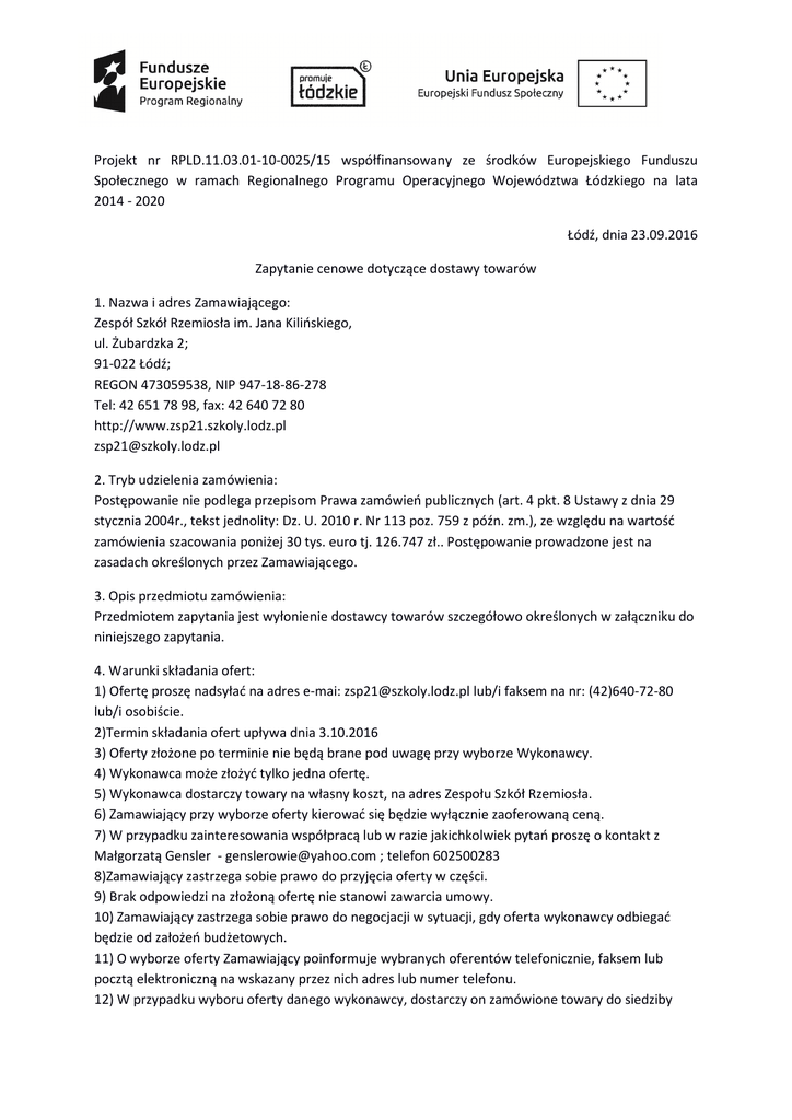 Projekt nr RPLD.11.03.01-10-0025/15 współfinansowany ze środków Europejskiego Funduszu Społecznego w ramach Regionalnego Programu Operacyjnego Województwa Łódzkiego na lata 2014 - 2020 Łódź, dnia 23.09.2016 Zapytanie cenowe dotyczące dostawy towarów 1. Nazwa i adres Zamawiającego: Zespół Szkół Rzemiosła im. Jana Kilińskiego, ul. Żubardzka 2; 91-022 Łódź; REGON 473059538, NIP 947-18-86-278 Tel: 42 651 78 98, fax: 42 640 72 80 http://www.zsp21.szkoly.lodz.pl [email protected] 2. Tryb udzielenia zamówienia: Postępowanie nie podlega przepisom Prawa zamówień publicznych (art. 4 pkt. 8 Ustawy z dnia 29 stycznia 2004r., tekst jednolity: Dz. U. 2010 r. Nr 113 poz. 759 z późn. zm.), ze względu na wartość zamówienia szacowania poniżej 30 tys. euro tj. 126.747 zł.. Postępowanie prowadzone jest na zasadach określonych przez Zamawiającego. 3. Opis przedmiotu zamówienia: Przedmiotem zapytania jest wyłonienie dostawcy towarów szczegółowo określonych w załączniku do niniejszego zapytania. 4. Warunki składania ofert: 1) Ofertę proszę nadsyłać na adres e-mai: [email protected] lub/i faksem na nr: (42)640-72-80 lub/i osobiście. 2)Termin składania ofert upływa dnia 3.10.2016 3) Oferty złożone po terminie nie będą brane pod uwagę przy wyborze Wykonawcy. 4) Wykonawca może złożyć tylko jedna ofertę. 5) Wykonawca dostarczy towary na własny koszt, na adres Zespołu Szkół Rzemiosła. 6) Zamawiający przy wyborze oferty kierować się będzie wyłącznie zaoferowaną ceną. 7) W przypadku zainteresowania współpracą lub w razie jakichkolwiek pytań proszę o kontakt z Małgorzatą Gensler - [email protected] ; telefon 602500283 8)Zamawiający zastrzega sobie prawo do przyjęcia oferty w części. 9) Brak odpowiedzi na złożoną ofertę nie stanowi zawarcia umowy. 10) Zamawiający zastrzega sobie prawo do negocjacji w sytuacji, gdy oferta wykonawcy odbiegać będzie od założeń budżetowych. 11) O wyborze oferty Zamawiający poinformuje wybranych oferentów telefonicznie, faksem lub pocztą elektroniczną na wskazany przez nich adres lub numer telefonu. 12) W przypadku wyboru oferty danego wykonawcy, dostarczy on zamówione towary do siedziby Zamawiającego w terminach ustalonych przez strony. Zamawiający zastrzega, że terminy dostaw mogą ulec zmianie. 13) Płatność za towary nastąpi do 30 dni po wystawieniu faktury, na rachunek wskazany przez sprzedającego Jednocześnie informujemy, że: - nie zwracamy kosztów przygotowania oferty dla celów niniejszego zapytania; - niniejsze pismo nie jest ofertą w rozumieniu przepisów kodeksu cywilnego; - odpowiemy jedynie na wybrane oferty i jednocześnie zastrzegamy sobie prawo do odstąpienia od dokonania wyboru oferty najkorzystniejszej bez podania przyczyny; - nie odsyłamy nadesłanych ofert. Załącznik: -wykaz towarów 1 sztuka-mikroskop stereoskopowy SMZ-161- TP: głowica trinokularowa z systemem optyki Greenough, współczynnik zoom 6:1 z układem zapadkowym Click-Stop, zakres powiększeń standard 7.5x – 45x, dystans roboczy WD=110 mm, tubusy okularowe nachylone pod kątem 45°, regulacja rozstawu międzyźrenicowego 50 - 75 mm; dwa okulary WF10X o numerze pola FN20, regulacją dioptrii w zakresie ±5D w tubusach okularowych, ergonomiczne muszle oczne, możliwość instalacji mikrometru okularowego; fototubus do podłączenia kamery z dwupozycyjną zwrotnicą podziału światła okulary : fototubus 100:0 / prawy okular : fototubus 0:100; uchwyt głowicy mikroskopu, z regulacją ostrości 43 mm, statyw z pilastrem fi25 mm, bez oświetlaczy, gniazdo na płytkę stolikową, czarnobiała płytka, pokrowiec, wymiary 237x170x398 mm UWAGA: wymagany adapter do podłączenia kamery 0.35xC, 0.5xC 1 sztuka- adapter z faktorem 0.5x do podłączenia kamery cyfrowej (1/3" lub 1/2") ze złączem Cmount do mikroskopów serii BA / AE / SMZ-171 / SMZ-161 1 sztuka- oświetlacz pierścieniowy z płynną regulacją intensywności oświetlenia, temperatura barwowa 6800K 1 sztuka - kamera mikroskopowa: matryca CMOS 1/4", rozdzielczość 800x600, złącze USB 2.0, obiektyw 8mm, adaptery okularowe 30mm i 38mm, statyw makro tuba, wzorzec kalibracyjny wraz z oprogramowaniem w jęz. polskim 2 sztuki - mikroskop petrograficzny (polaryzacyjny) A-04 standard, głowica monookularowa obrotowa 360 °, kąt 45°, okular szerokokątny 10x (WF 10x/18mm) z krzyżem celowniczym, rewolwer czterogniazdowy, obiektywy achromatyczne EA 4x, 10x, 40x S, stolik roboczy obrotowy od 0° do 360° z podziałką co 1°, kondensor Abbe 1.25 N.A., przysłona Irysowa z uchwytem na filtr, , oświetlacz halogenowy 12V/20W z regulacją intensywności, zasilanie 230V/50Hz, osłona winylowa FORMULARZ OFERTOWY ..................................... (miejscowość i data) ....................................................... ....................................................... ....................................................... (Nazwa i adres oferenta) OFERTA Zespół Szkół Rzemiosła im. Jana Kilińskiego, ul. Żubardzka 2 91-022 Łódź; REGON 470359538, NIP 947-18-86-278 Tel: 42 651 78 98, fax: 42 640 72 80 http://www.zsp21.szkoly.lodz.pl [email protected] (nazwa i adres zamawiającego) Odpowiadając na zapytanie o cenę oferujemy wykonanie niniejszego zamówienia: Lp. 1 2 3 4 5 6 7 Razem Przedmiot Jednostka Zamówienia miary n/d n/d Ilość Cena jednostkowa netto n/d n/d Wartość netto Stawka VAT (%) n/d Wartość VAT Wartość brutto