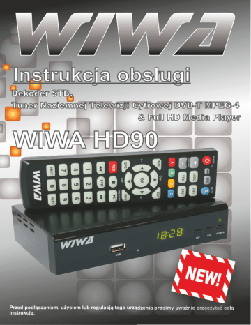Instrukcja obsługi Dekoder STB, Tuner Naziemnej Telewizji Cyfrowej DVB-T MPEG-4 & Full HD Media Player WIWA HD90 Przed podłączaniem, użyciem lub regulacją tego urządzenia prosimy uważnie przeczytać całą instrukcję. Bezpieczeństwo i ochrona środowiska UWAGA ! PRZECZYTAJ UWAŻNIE NINIEJSZY PODRĘCZNIK UŻYTKOWNIKA I POSTĘPUJ ZGODNIE Z JEGO INSTRUKCJAMI. PAMIĘTAJ POSTĘPOWANIE NIEZGODNE DO ZALECEŃ NARUSZA TWOJE PRAWO DO ROSZCZEŃ GWARANCYJNYCH. Aby poprawnie użytkować sprzęt należy dokładnie zapoznać się z treścią podręcznika użytkownika. Prosimy zachować niniejszy podręcznik, by móc korzystać z zawartych w nim instrukcji i wskazówek również w przyszłości. W razie zaistnienia konieczności naprawy sprzętu należy skontaktować się z autoryzowanym punktem serwisowym. OSTRZEŻENIE ! OTWARCIE OBUDOWY GROZI PORAŻENIEM PRĄDEM. Nie wolno pod groźbą porażenia prądem zdejmować obudowy lub tylniej pokrywy z urządzenia. Nawet gdy urządzenie jest wyłączone, wewnątrz obudowy może wystąpić niebezpiecznie wysokie napięcie. W środku nie ma żadnych części, które użytkownik może wymieniać lub naprawiać we własnym zakresie. W razie stwierdzenia uszkodzenia, naprawy mogą być dokonywane wyłącznie przez autoryzowany punkt serwisowy. Wymiany przewodu zasilającego może dokonać tylko specjalistyczny warsztat serwisowy. Baterie i urządzenia z zainstalowanymi bateriami należy chronić przed nadmiernym ciepłem pochodzącym od słońca, ognia itp. OSTRZEŻENIE ! Aby uniknąć niebezpieczeństwa pożaru lub porażenia prądem, nie wolno wystawiać sprzętu na działanie wody (np. deszczu) i należy chronić go przed wilgocią. Nie wolno umieszczać sprzętu w miejscach narażających go na zroszenie (np. w pobliżu łazienek, saun), umieszczać na odtwarzaczu przedmiotów zawierających płyny (np. wazony). UWAGA ! Nie wolno blokować otworów wentylacyjnych. Należy zainstalować zgodnie z zaleceniami producenta. Otwory znajdujące się w obudowie zostały wykonane dla zapewnienia wentylacji, prawidłowego działania i zabezpieczenia przed przegrzaniem. Otwory te nie mogą być zasłaniane przez położenie urządzenia na łóżku, sofie, dywanie lub na podobnej powierzchni. Urządzenia nie wolno umieszczać w powierzchni zabudowanej np. półkach na książki lub w szafkach, chyba że zapewniona jest właściwa wentylacja lub przestrzegane są zalecenia producenta. NAPRAWY Wszystkie czynności serwisowe muszą być dokonywane przez punkt serwisowy. Urządzenie należy zgłosić do serwisu, jeśli upadło, został naruszony kabel zasilający, do środka dostała się jakakolwiek ciecz, było trzymane na deszczu, nie pracuje prawidłowo lub słychać znaczące pogorszenie w jakości brzmienia. USUWANIE WYEKSPLOATOWANYCH URZĄDZEŃ ELEKTRYCZNYCH I ELEKTRONICZNYCH Ten symbol na produkcie lub jego opakowaniu oznacza, że produkt nie powinien być zaliczany do odpadów domowych i nie wolno wyrzucać razem z innymi odpadami z gospodarstw domowych. Polskie prawo zabrania pod karą grzywny łączenia zużytego sprzętu elektrycznego i elektronicznego wraz z innymi odpadami. Należy go przekazać do odpowiedniego punktu, który zajmuje się zbieraniem i recyklingiem urządzeń elektrycznych i elektronicznych. Dbając o pozbycie się produktu w należyty sposób, można zapobiec potencjalnym negatywnym skutkom dla środowiska naturalnego i zdrowia ludzkiego, jakie mogłyby wyniknąć z niewłaściwego postępowania z odpadami powstałymi ze zużytego sprzętu elektronicznego. Recykling materiałów pomaga w zachowaniu surowców naturalnych. Aby uzyskać szczegółowe informacje o recyklingu tego produktu, należy się skontaktować z władzami lokalnymi, firmą świadczącą usługi oczyszczania lub sklepem, w którym produkt ten został kupiony. CE Logo to informuje, że odbiornik zgodny jest z warunkami dyrektywy 89/336/EEC dotyczącej przestrzegania przez kraje członkowskie przepisów zgodności elektromagnetycznej oraz warunkami dyrektyw 73/23/EEC i 93/68/EEC dotyczących przestrzegania przez kraje członkowskie przepisów niskiego napięcia i bezpieczeństwa związanego z obsługą urządzeń elektrycznych. 2 Zalecenia eksploatacyjne Lokalizacja Urządzenie powinno stać na płaskiej, stabilnej powierzchni, z dala od innych urządzeń elektronicznych jak odtwarzacze video, odbiorniki radiowe czy głośniki, od których zakłócenia elektromagnetyczne mogą wpływać na jakość odtwarzanego obrazu i dźwięku. Umieszczając odbiornik w zamykanym regale musimy zadbać o wolną przestrzeń wokół niego, gwarantującą prawidłową wentylację, a także w miejscu o małej wilgotności powietrza, z dala od słońca i innych źródeł ciepła. Chroń urządzenie przed zalaniem. Zasilanie Jeśli odtwarzacz nie będzie używany przez dłuższy czas, należy go wyłączyć z gniazdka sieciowego. W celu wyłączenia przewodu chwycić za wtyczkę, nie ciągnąć za sam przewód. Nie dotykać przewodu zasilającego ani zasilacza sieciowego mokrymi rękami. Grozi to porażeniem prądem. Proszę używać tylko zasilaczy zalecanych przez producenta urządzenia i dostarczonych wraz z urządzeniem. Nie umieszczać zasilacza sieciowego w zamkniętej przestrzeni, takiej jak regał czy szafka AV. Chronić urządzenie przed upuszczeniem i wstrząsem. UWAGI dotyczące kabla zasilania Od czasu do czasu należy sprawdzać kabel urządzenia i jeżeli wykazuje on oznaki uszkodzenia lub zniszczenia odłączyć go i przerwać korzystanie z urządzenia, następnie wymienić kabel na dokładnie taki sam w autoryzowanym serwisie. Chronić kabel przed fizycznym i mechanicznym uszkodzeniem, takim jak skręcenie, zapętlenie, ściśnięcie, zgniecenie w drzwiach lub nadepnięcie. Zwrócić szczególną uwagę na wtyczki, gniazdka oraz miejsce, gdzie kabel wychodzi z urządzenia. Aby odłączyć zasilanie, należy wyciągnąć wtyczkę z gniazdka. Podczas instalacji urządzenia nal
