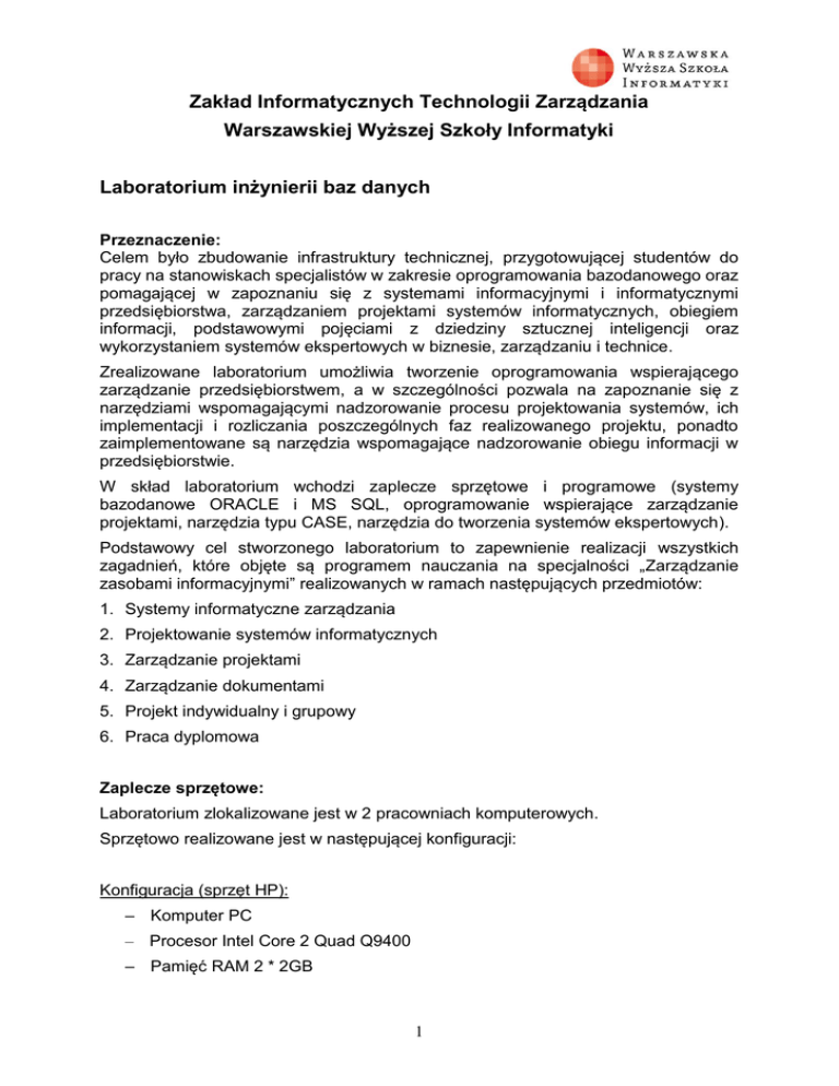 Zakład Informatycznych Technologii Zarządzania Warszawskiej Wyższej Szkoły Informatyki Laboratorium inżynierii baz danych Przeznaczenie: Celem było zbudowanie infrastruktury technicznej, przygotowującej studentów do pracy na stanowiskach specjalistów w zakresie oprogramowania bazodanowego oraz pomagającej w zapoznaniu się z systemami informacyjnymi i informatycznymi przedsiębiorstwa, zarządzaniem projektami systemów informatycznych, obiegiem informacji, podstawowymi pojęciami z dziedziny sztucznej inteligencji oraz wykorzystaniem systemów ekspertowych w biznesie, zarządzaniu i technice. Zrealizowane laboratorium umożliwia tworzenie oprogramowania wspierającego zarządzanie przedsiębiorstwem, a w szczególności pozwala na zapoznanie się z narzędziami wspomagającymi nadzorowanie procesu projektowania systemów, ich implementacji i rozliczania poszczególnych faz realizowanego projektu, ponadto zaimplementowane są narzędzia wspomagające nadzorowanie obiegu informacji w przedsiębiorstwie. W skład laboratorium wchodzi zaplecze sprzętowe i programowe (systemy bazodanowe ORACLE i MS SQL, oprogramowanie wspierające zarządzanie projektami, narzędzia typu CASE, narzędzia do tworzenia systemów ekspertowych). Podstawowy cel stworzonego laboratorium to zapewnienie realizacji wszystkich zagadnień, które objęte są programem nauczania na specjalności „Zarządzanie zasobami informacyjnymi” realizowanych w ramach następujących przedmiotów: 1. Systemy informatyczne zarządzania 2. Projektowanie systemów informatycznych 3. Zarządzanie projektami 4. Zarządzanie dokumentami 5. Projekt indywidualny i grupowy 6. Praca dyplomowa Zaplecze sprzętowe: Laboratorium zlokalizowane jest w 2 pracowniach komputerowych. Sprzętowo realizowane jest w następującej konfiguracji: Konfiguracja (sprzęt HP): – Komputer PC – Procesor Intel Core 2 Quad Q9400 – Pamięć RAM 2 * 2GB 1 – Dysk twardy 500 GB – Płyta główna zawierająca 4 sloty DDR2 800MHz, zawierająca kartę graficzną, kartę muzyczną i kartę sieciową – Monitor LCD 19" – Ilość – 2 * 24 stanowiska Zaplecze programowe: Oprogramowanie, które zabezpiecza zajęcia dydaktyczne jest następujące: Windows 7 Pro MS Office 2007 Pro Aplikacje MSDN AA – Microsoft .NET – MS Visio – MS Project – MS Access Microsoft SQL Server 2012 Oracle 11g Scilab Eclipse Roboguide AutoCad 2007 Oprogramowanie LabVIEW Professional Sphinx Python Generator aplikacji Magic Free Pascal Turbo C++ Wykaz wybranych realizowanych zagadnień: 1. Systemy informatyczne zarządzania 2. Projektowanie systemów informatycznych 3. Zarządzanie projektami – Zarządzanie harmonogramem i kosztami a. Wybrane techniki opisu struktury projektu b. Wybrane techniki sieciowe 2 c. Tworzenie harmonogramu projektu d. Definicja i planowanie zakresu projektu e. Ścieżka krytyczna i metoda pól czasowych f. Kontrola harmonogramu g. Wprowadzenie do zarządzania kosztami w projekcie h. Podstawy szacowania kosztów i. Prognozowanie j. Szacowanie kosztów a ryzyko k. Kontrola projektu l. Zarządzanie projektem przy pomocy metody (EVM) – Zarządzanie ryzykiem i jakością a. Podstawy zarządzania ryzykiem w projekcie b. Procesy zarządzania ryzykiem c. Podstawy statystyczne niezbędne do zarządzania ryzykiem w projekcie d. Budowa modelu ryzyka e. Reagowanie na wystąpienie ryzyka f. Zarządzanie kryzysowe g. Wprowadzenie do zarządzania jakością w projekcie h. Procesy zarządzania jakością w projekcie i. Zarządzanie jakością w projekcie j. Wyniki zarządzania jakością w projekcie k. Zarządzanie i komunikacja, których celem jest jakość l. Wybrane zagadnienia zarządzania jakością w projekcie – Zarządzanie zamówieniami i kontraktami a. Wprowadzenie do zarządzania kontraktami i zamówieniami b. Procesy zarządzania zamówieniami w projekcie c. Planowanie zamówień i dostaw d. Planowanie zamówień e. Zebranie ofert f. Wybór dostawców g. Administracja kontraktem h. Zamknięcie kontraktu 4. Zarządzanie dokumentami 5. Projekt indywidualny i grupowy 3 – Realizacja projektu systemu informatycznego obejmująca wszystkie fazy projektowania: a. Określenie dziedziny problemu, b. Analiza problemu, c. Projekt koncepcyjny, d. Projekt technologiczny, e. Implementacja. 4